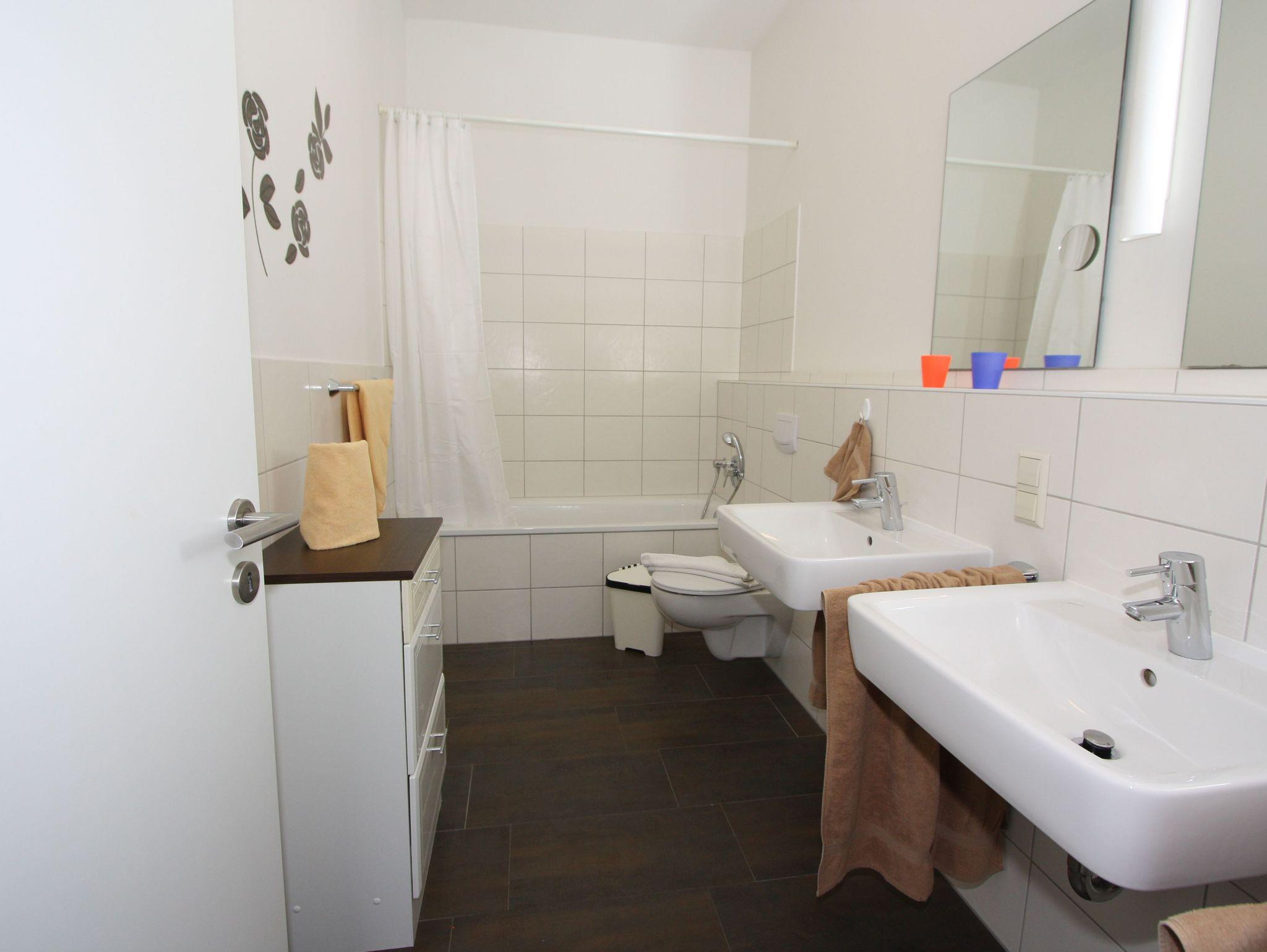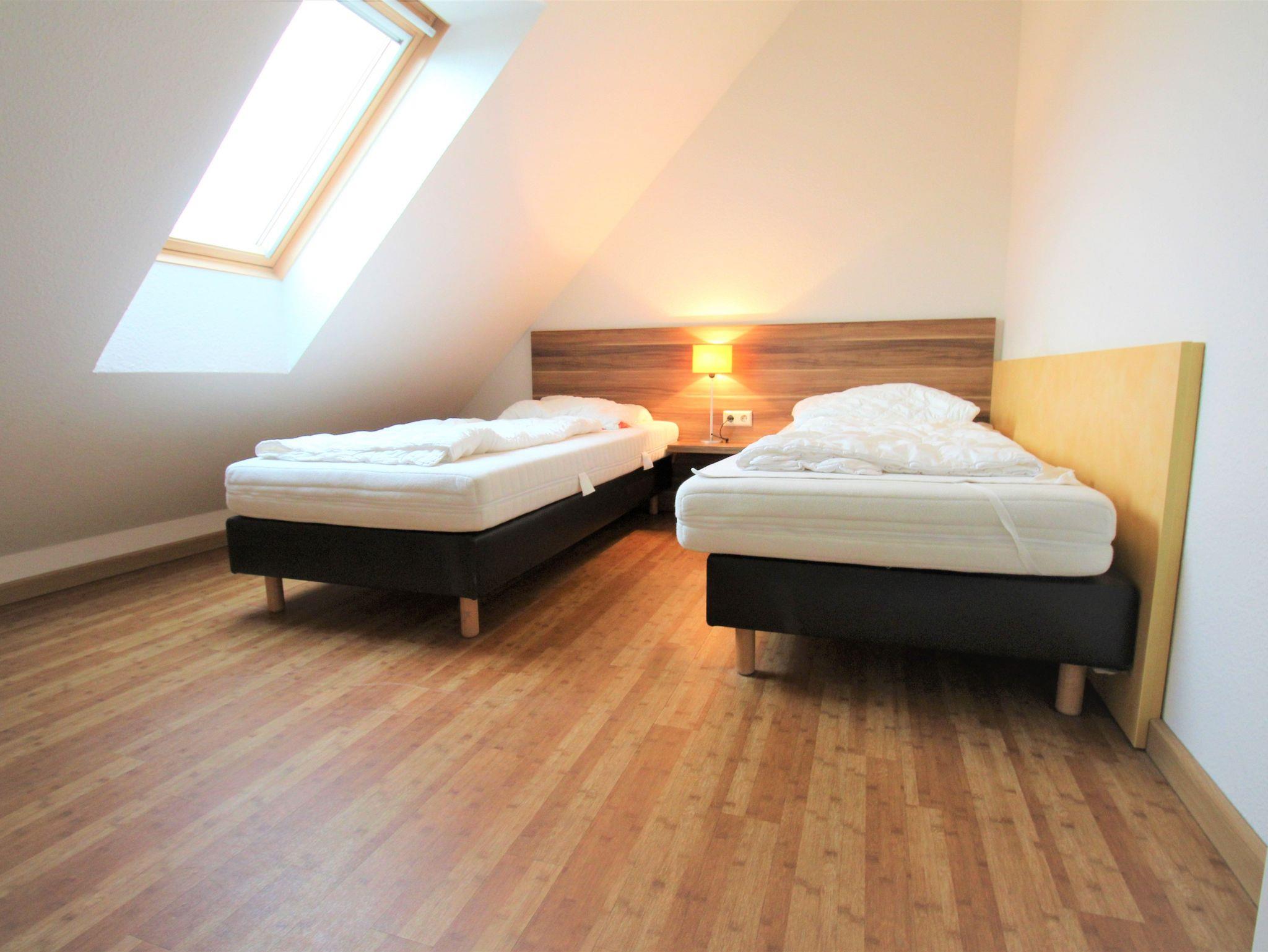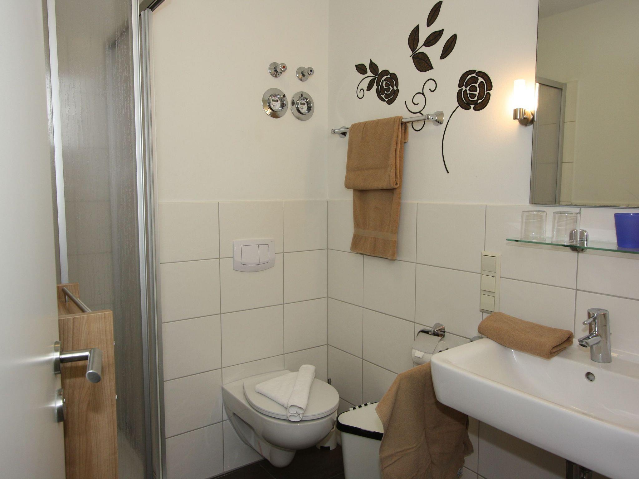 ein Duschbad, ein Schlafzimmer mit getrennten Betten.