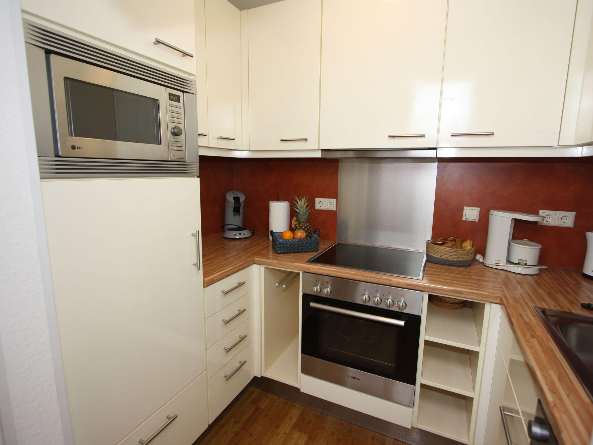 ausgestattete Einbauküche mit Geschirrspüler und Mikrowelle, ein Schlafzimmer mit Doppelbett und ein