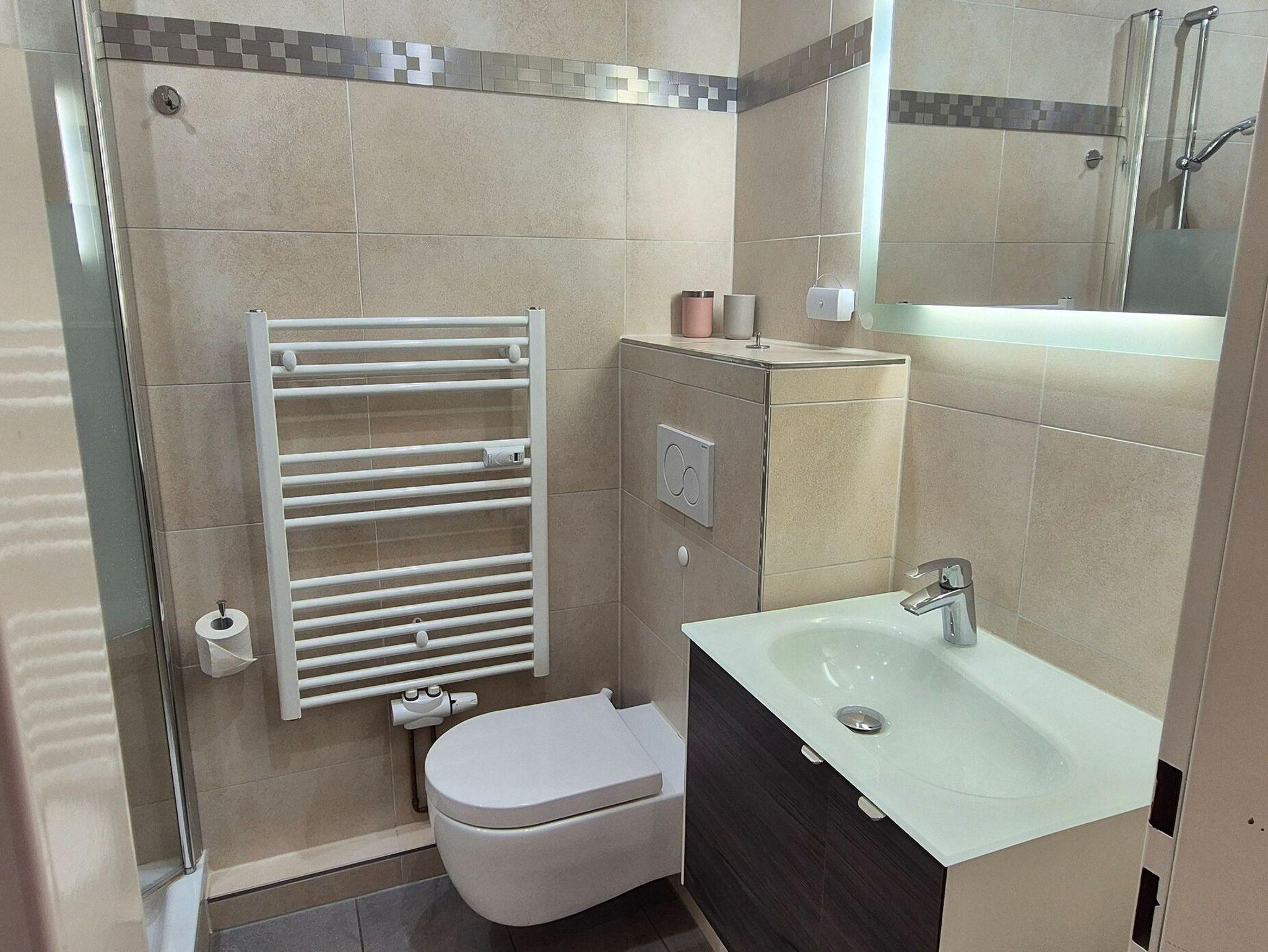 Das Appartement besteht aus einem Schlafzimmer mit Doppelbett, einem Wohnbereich mit ausziehbarem Schlafsofa, eine voll ausgestattete integrierter Küche, einem Badezimmer mit Dusche sowie WC.