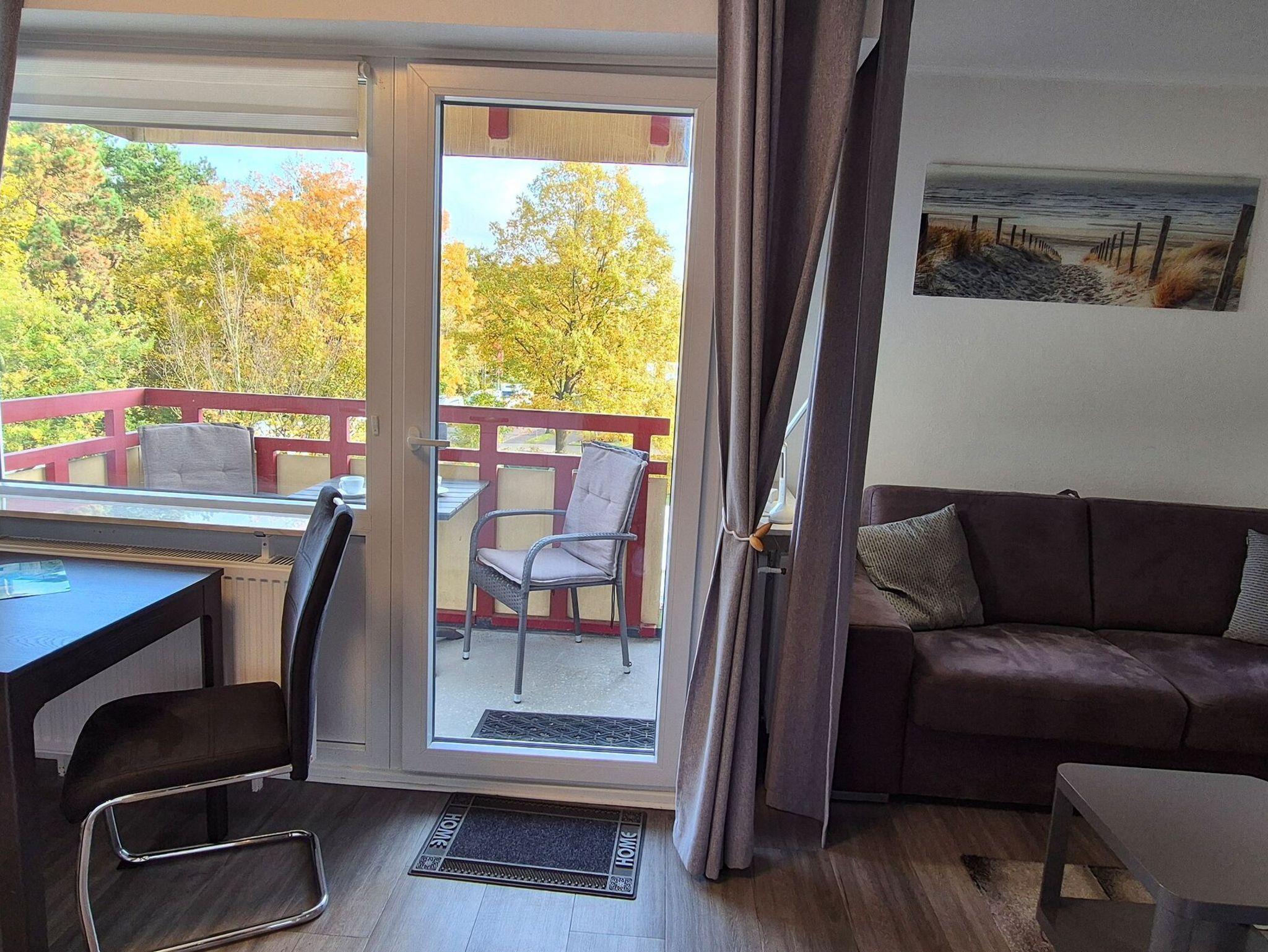 Das Appartement 36 ist ein 2-Raum-Appartement im 3. Obergeschoss für bis zu 4 Personen mit 26 qm. Der möblierte Ostbalkon bietet morgens Sonne und nachmittags Schatten.