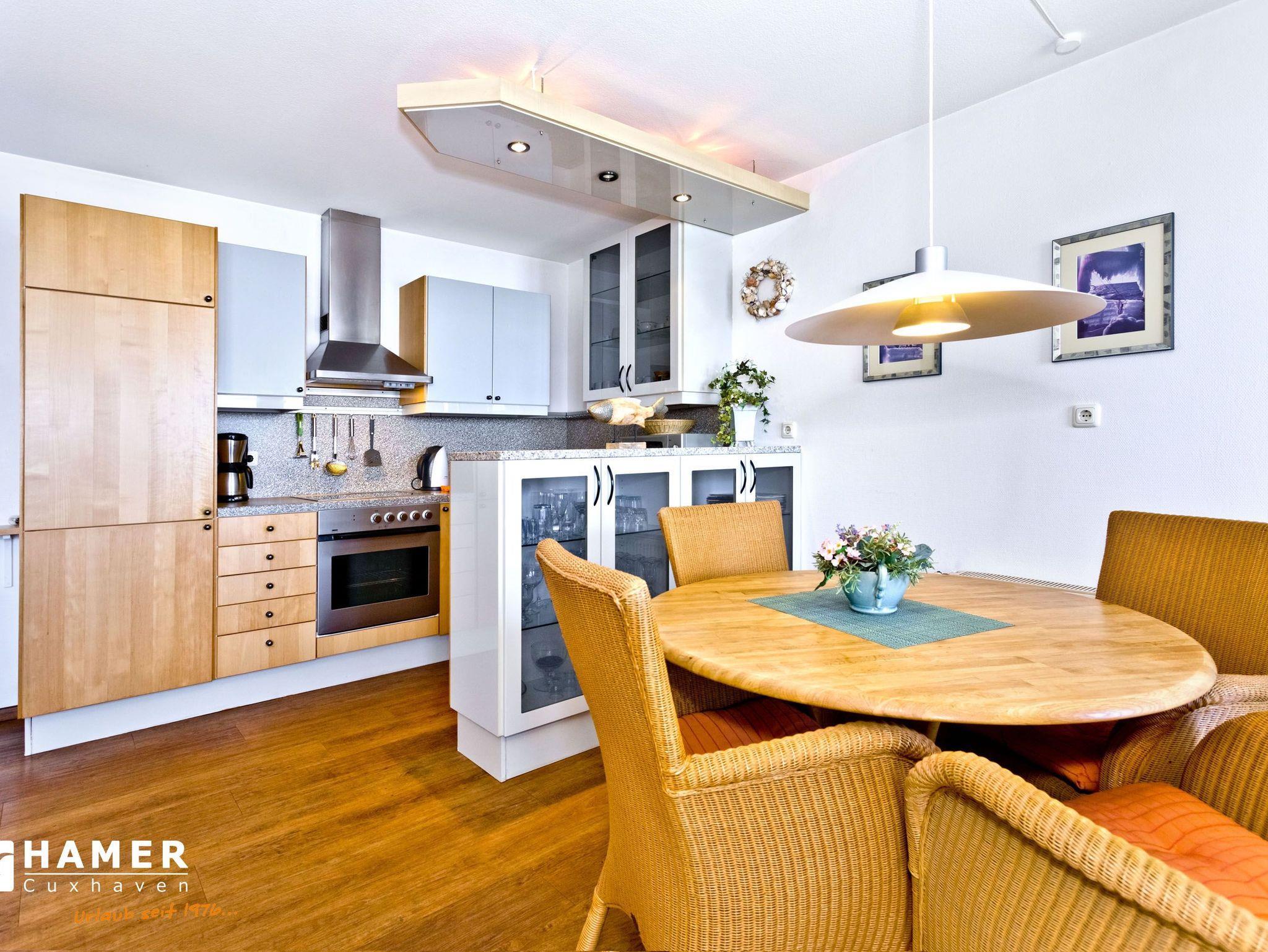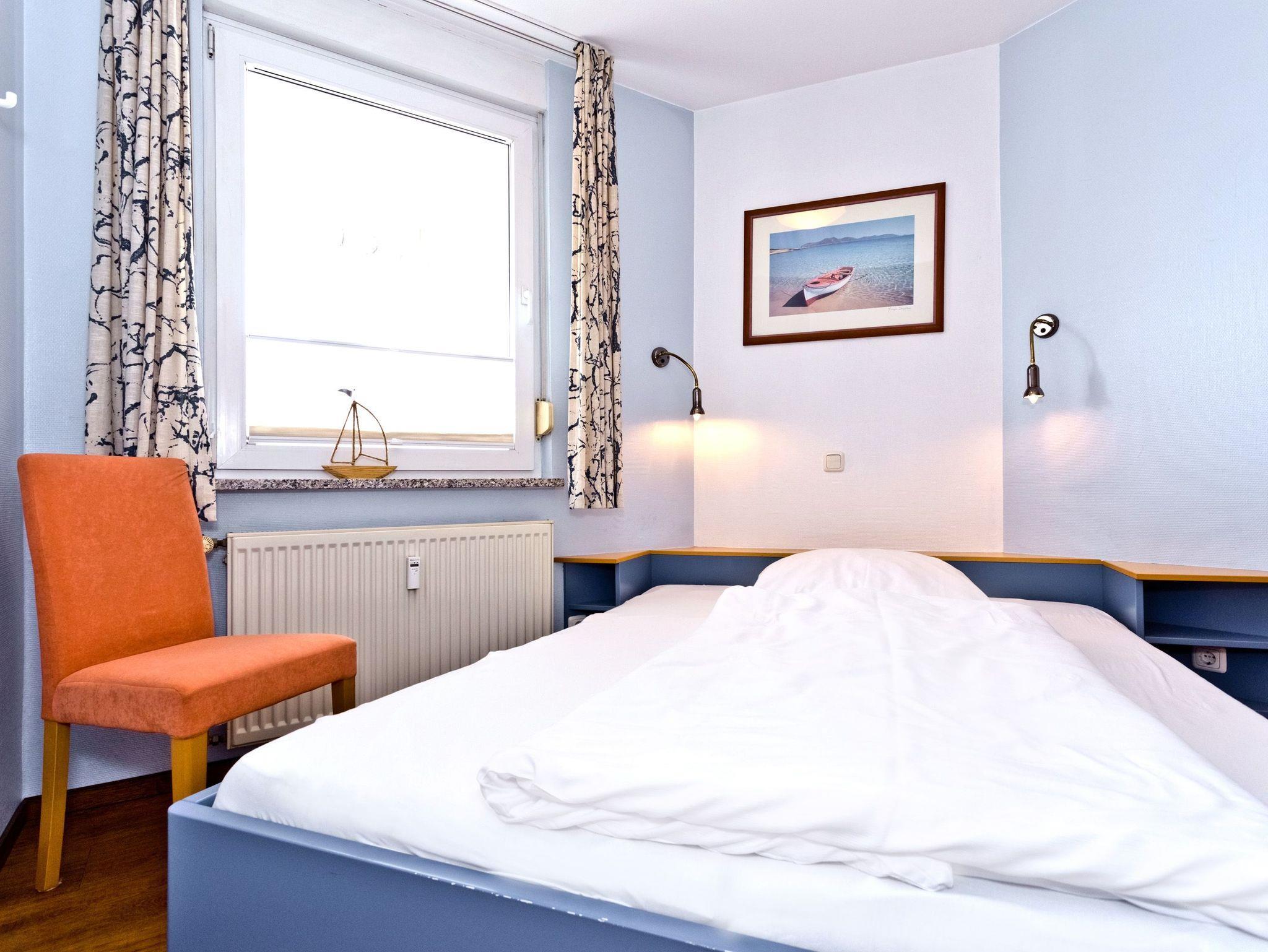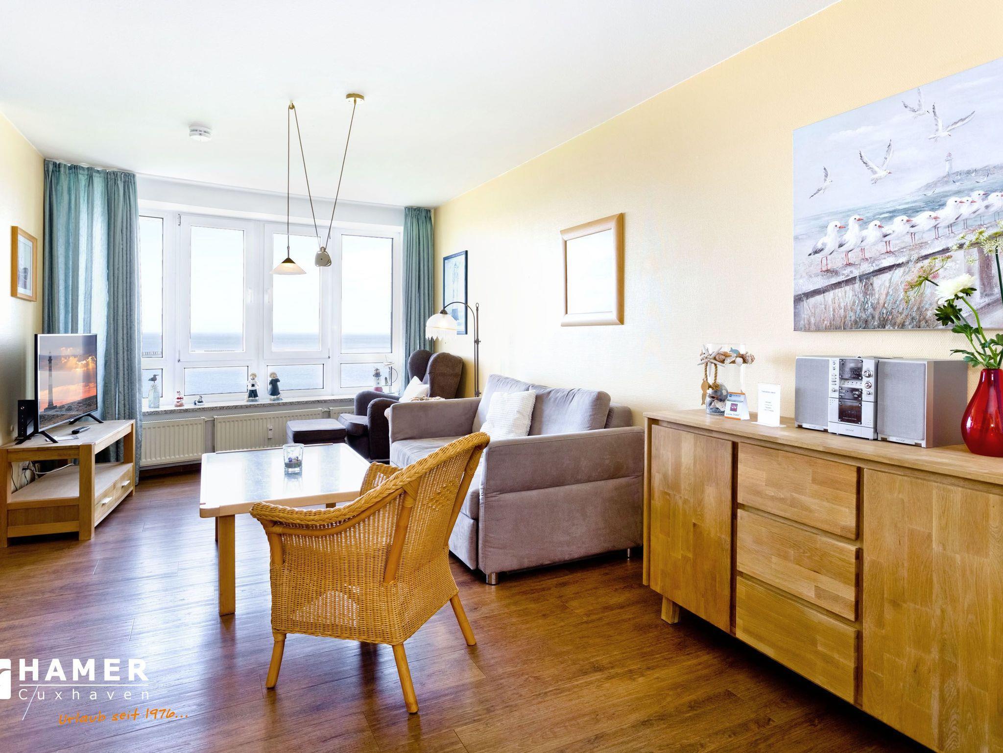 Schöne 2-Raum-Ferienwohnung für 2 Personen über ca. 50m² mit Sicht auf die Elbmündung. 3.Etage mit Aufzug, Schlafzimmer mit Doppelbett (2x75x190) und Rollladen, komplette Küchenzeile (Geschirrspüler, Mikrowelle etc.) Wohnzimmer mit Sofa, Kabel-TV, kostenfreies W-LAN, Esstisch, kleiner Balkon zur Seeseite (nord), nummerierter Pkw-Stellplatz #36 am Haus.