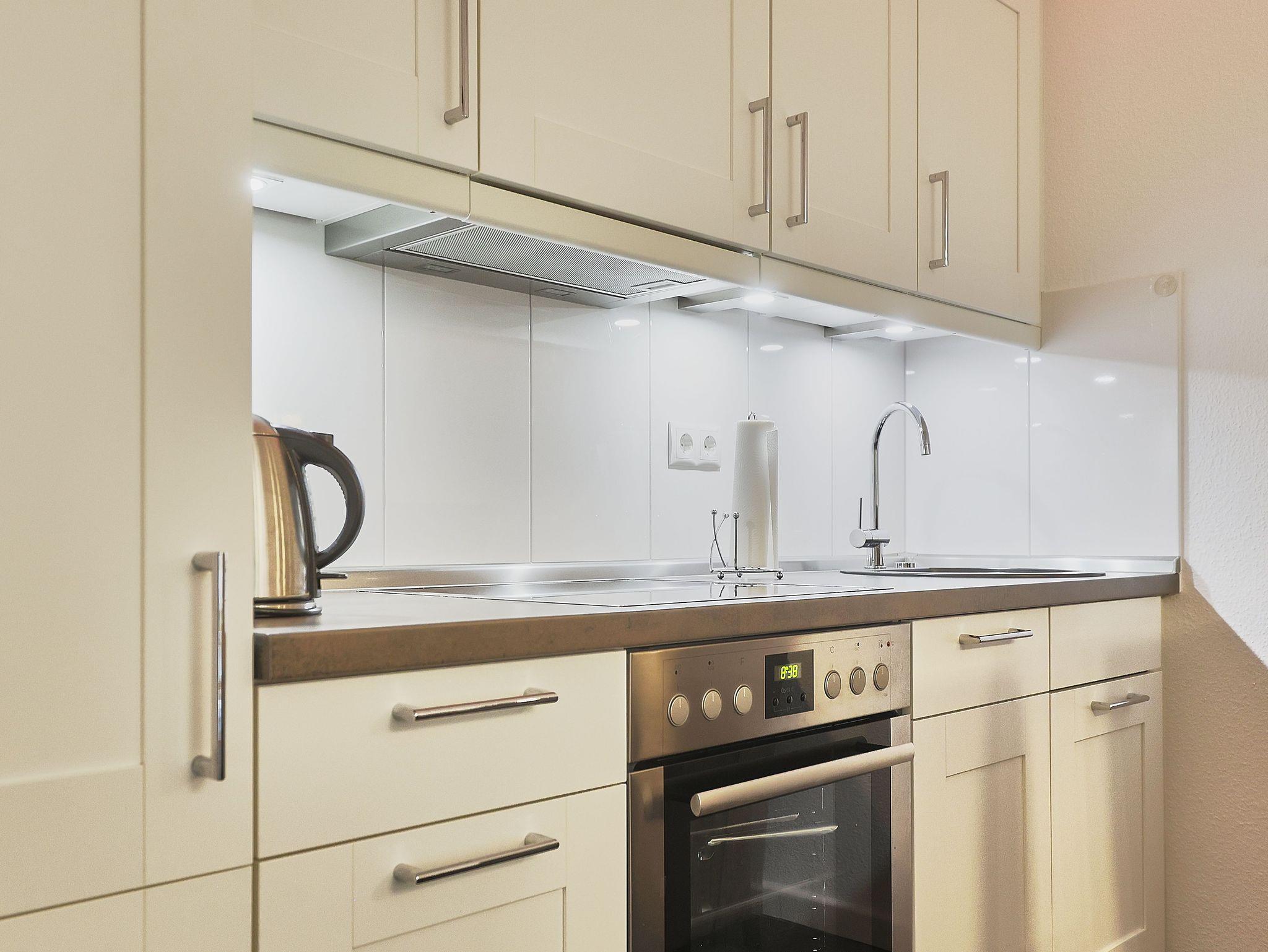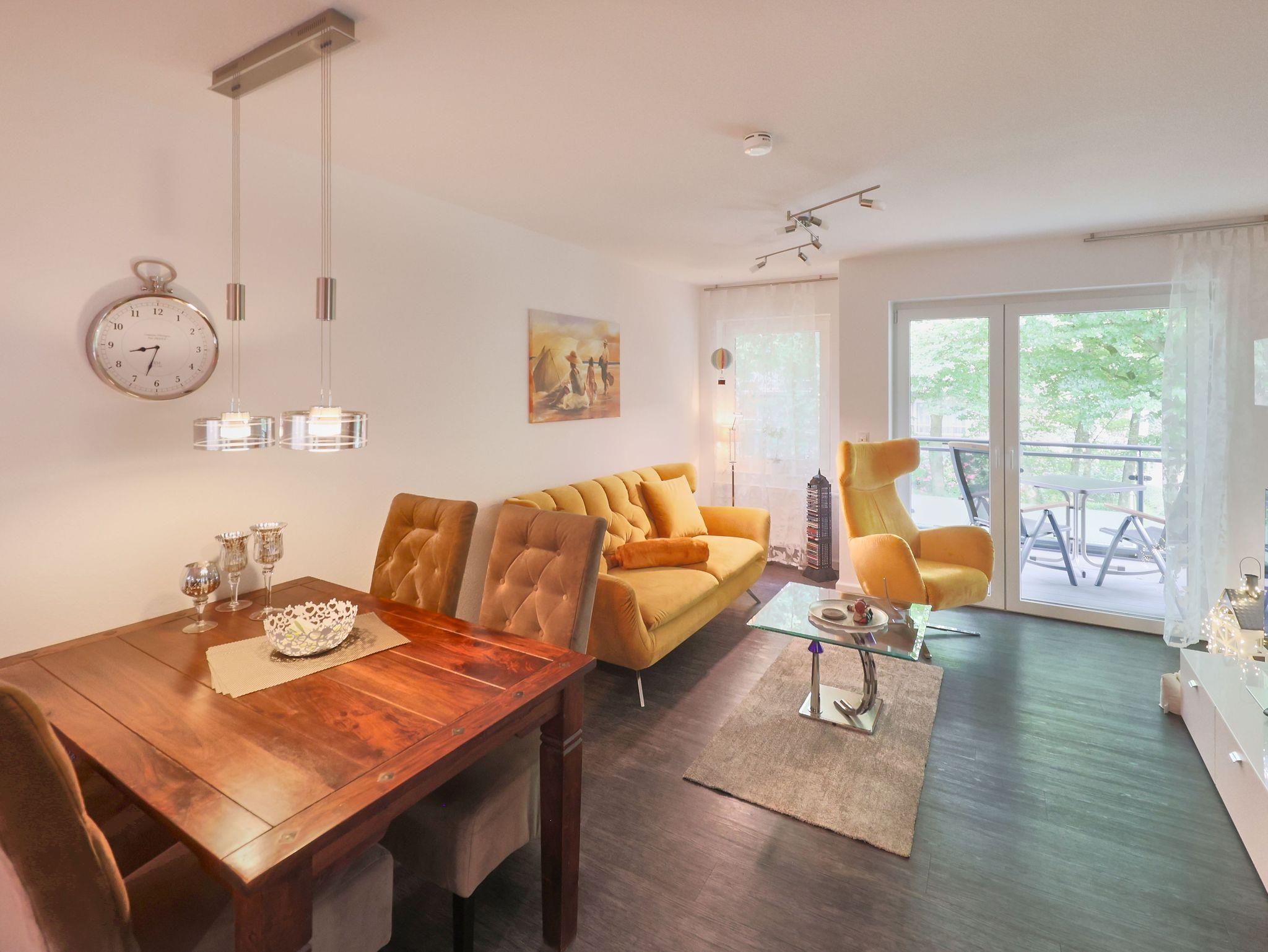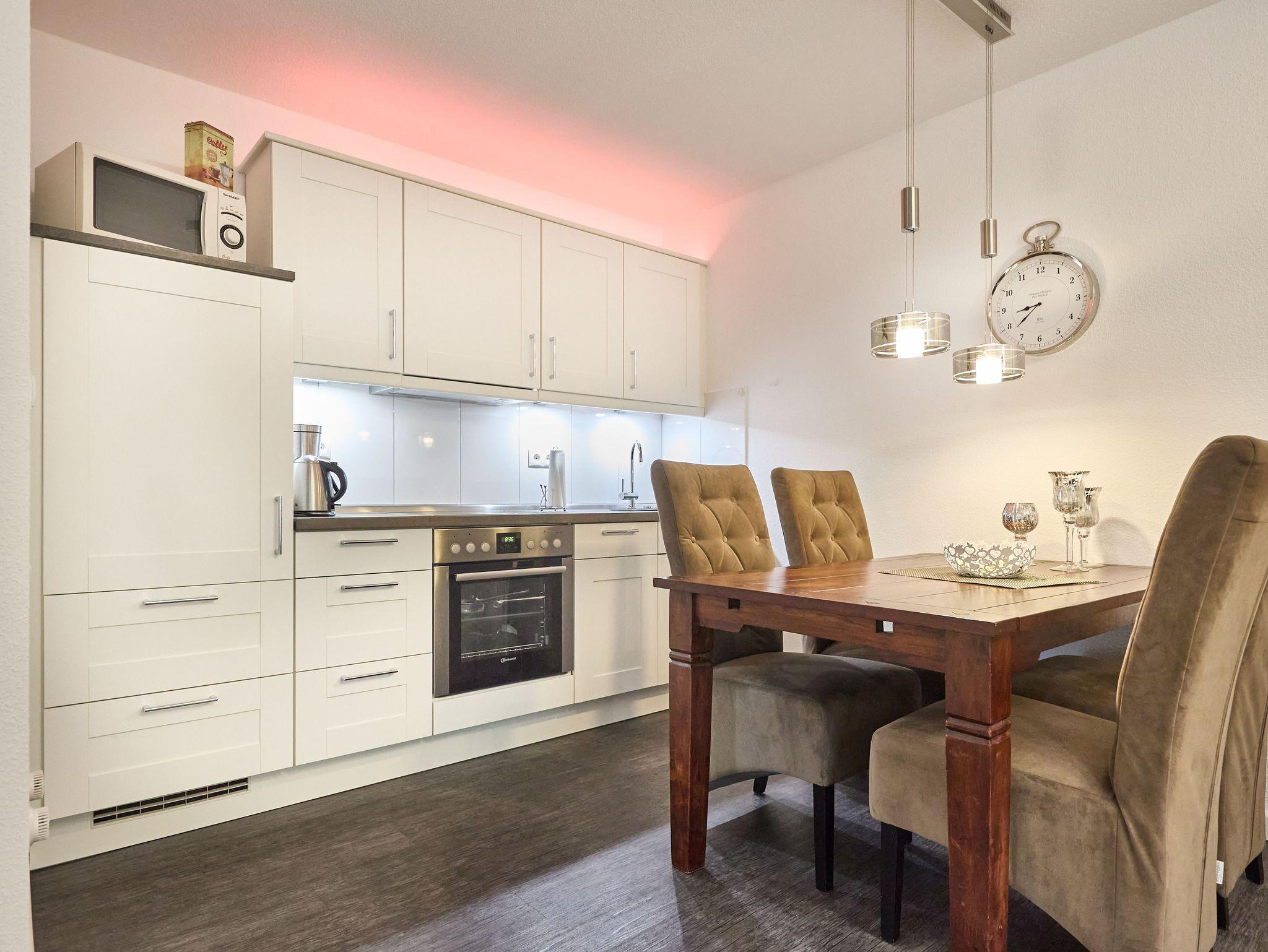 Der Wohn-, Küchen- und Essbereich ist mit einer komfortablen Einbauküche inklusive Geschirrspüler ausgestattet. Der Esstisch mit 4 Stühlen lädt zum gemeinsamen Mahl ein, während das Sofa mit einem Sessel zum Entspannen einlädt. Vom Wohnbereich aus gelangen Sie auf den Balkon, der Ihnen ebenfalls eine kleine Aussicht auf das Meer bietet und am Strandpalais Duhnen vorbeiführt.