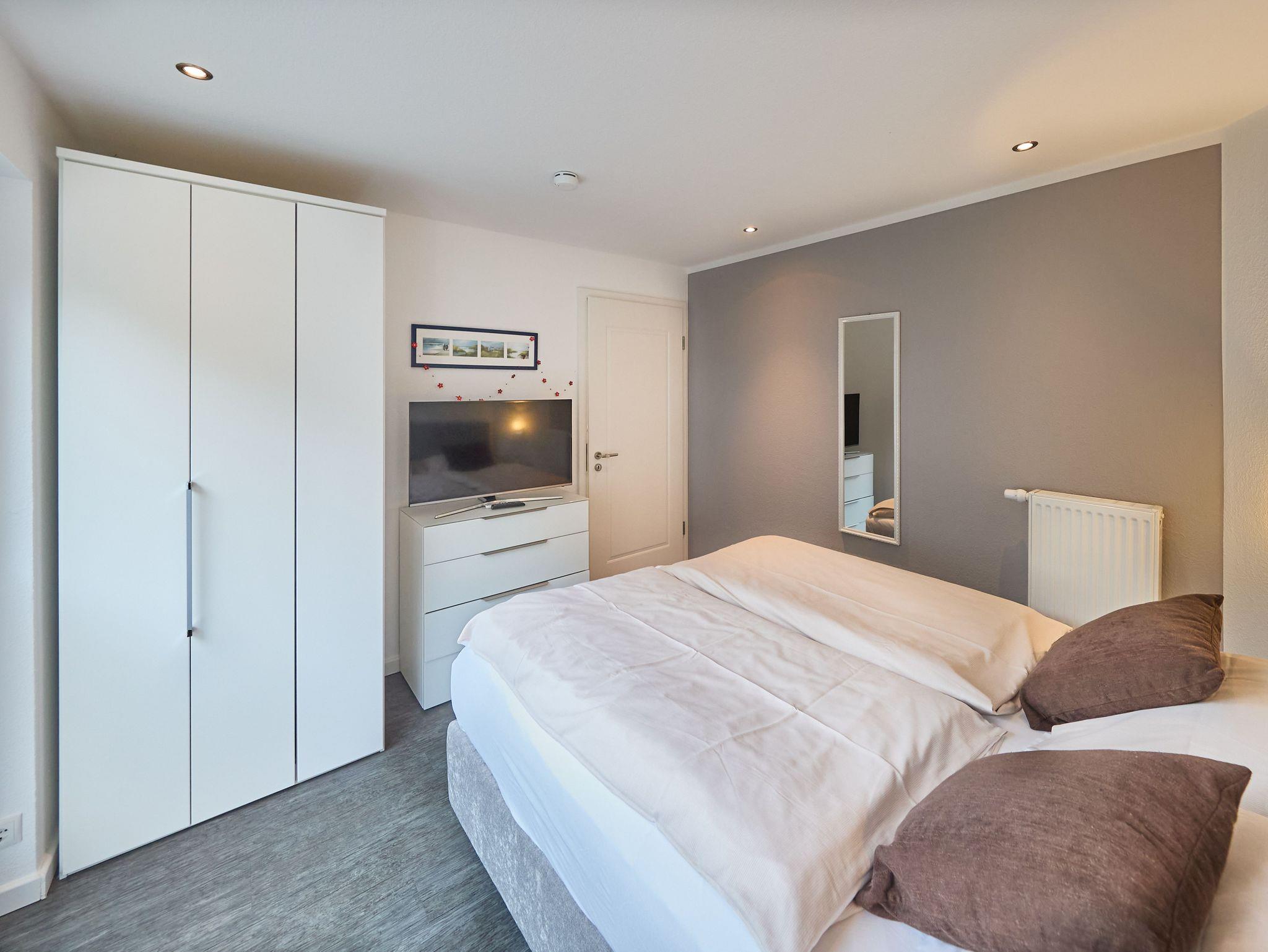 Die Einrichtung der Wohnung ist ansprechend und geschmackvoll gestaltet. Der Schlafbereich verfügt über komfortable Betten in seniorengerechter Komforthöhe sowie einen zusätzlichen Fernseher. Das angrenzende Duschbad mit WC bietet Ihnen Komfort und einen schönen Ausblick ins Grüne. Von hier aus können Sie sogar einen kleinen Blick auf das Meer erhaschen.