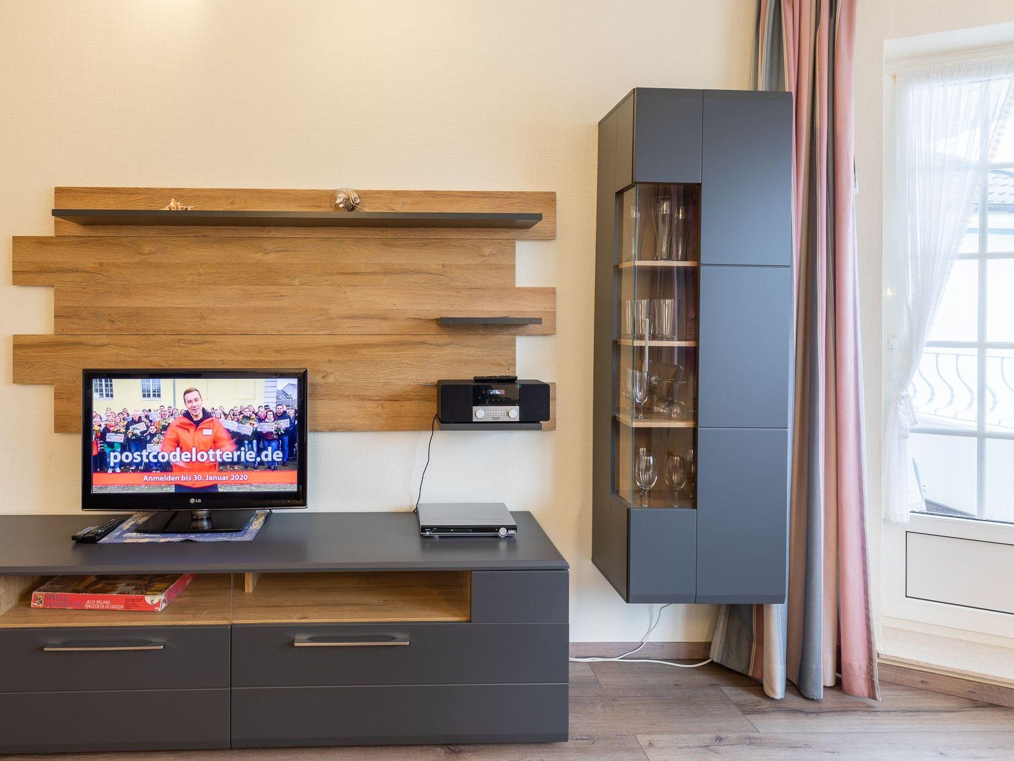 Die Ferienwohnung mit einer Größe von ca. 60m² Wohnfläche ist komplett bis zu 5 Personen ausgestattet. 1 Wohnzimmer mit Essplatz am Fenster, Ecksofa-/Schlafsofa, 1 Flachbildfernseher, 1 DVD Player, Küchenzeile (Cerankochfeld, Kühlschrank, Kaffeemaschine, Wasserkocher, Geschirrspüler und Toaster), Balkon zum Süden mit Tisch und 4 Stühlen,1 Schlafzimmer mit Doppelbett (180x200cm) und Schrank, 1 Schlafzimmer mit Doppelbett (140x200cm) und Schrank, Flur, Bad mit Dusche, WC, Waschbecken und Spiegel, Nichtraucherwohnung, keine Haustiere, PKW-Stellplatz am Haus (schmaler Stellplatz der nur Rückwärts befahren werden kann).