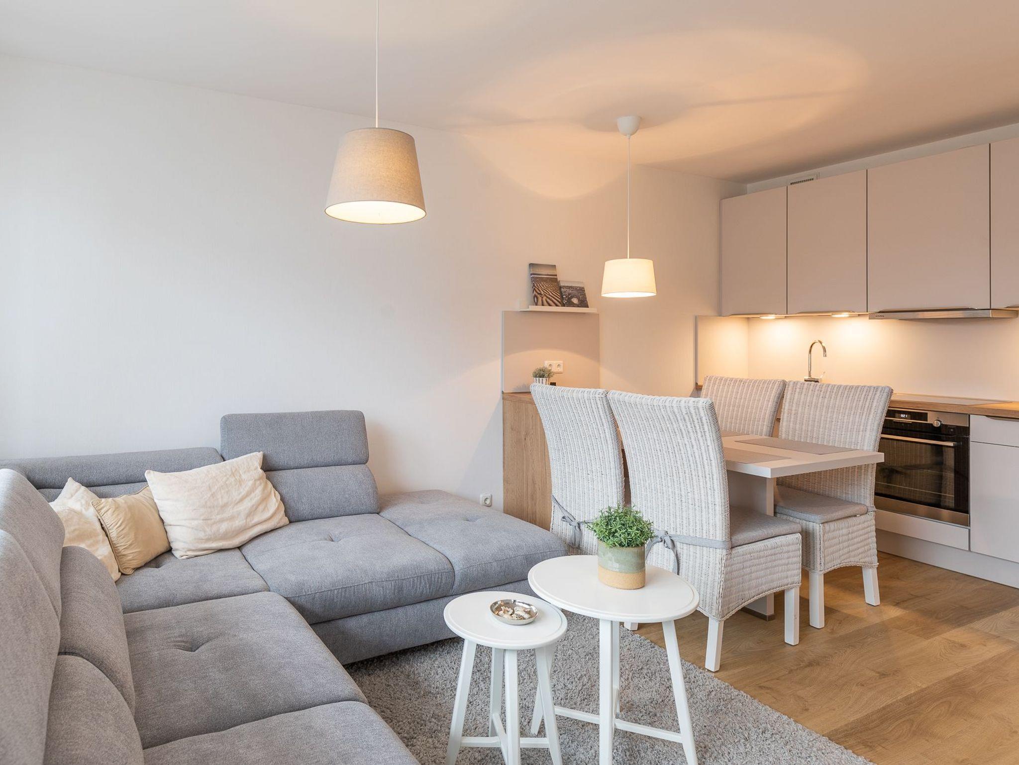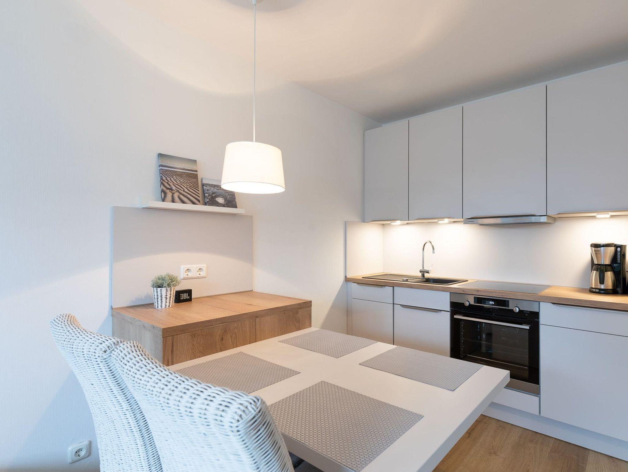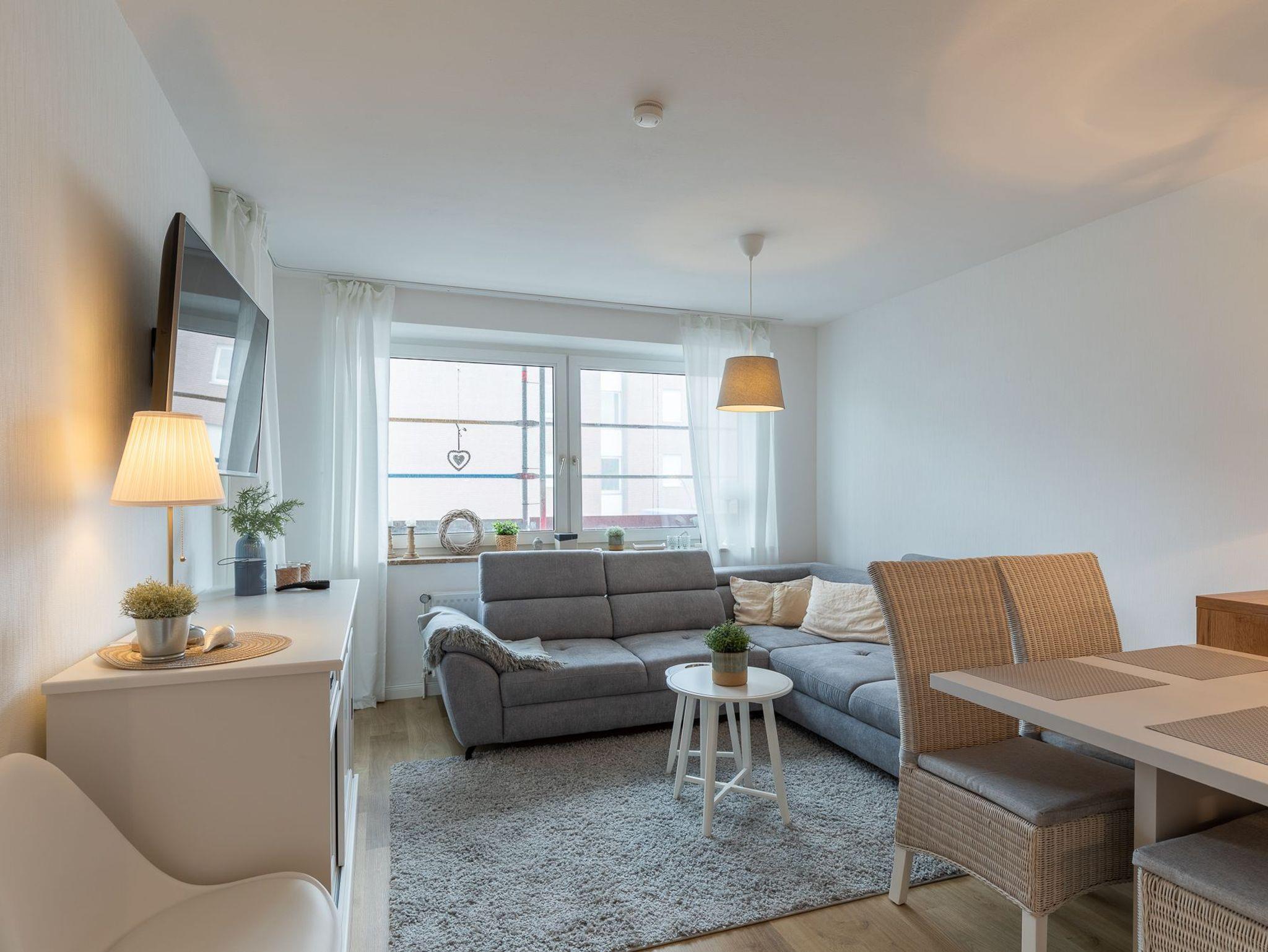 Mit einer Größe von ca. 54 m² Wohnfläche ist die Wohnung komplett bis zu 4 Personen ausgestattet, Wohnzimmer mit kompletter Einbauküche (Backofen, Cerankochfeld, Geschirrspüler, Toaster, Wasserkocher, Kühlschrank), Essplatz, Sofa-Ecke und direktem Zugang zum Balkon, 1 Schlafzimmer mit Doppelbett und TV, 2. Schlafzimmer innenliegend mit Etagenbett, Bad mit Dusche und WC, 1 Flatscreen TV im Wohnzimmer, Nichtraucherwohnung, keine Haustiere, PKW-Stellplatz direkt am Haus.