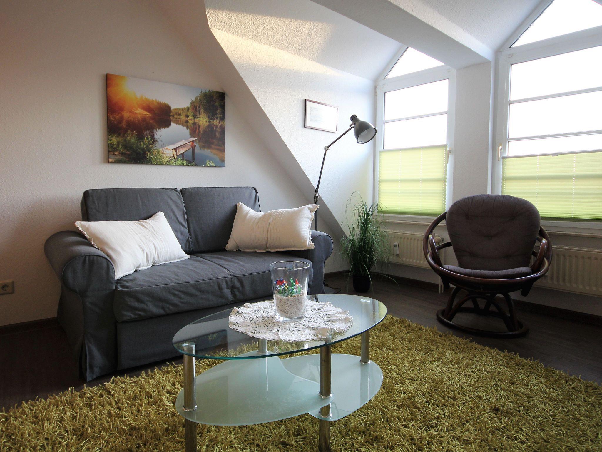 Die Ferienwohnung mit einer Größe von ca. 40m² Wohnfläche (im 3. Obergeschoss) ist komplett bis zu 3 Personen ausgestattet. 1 Wohnzimmer mit Essplatz, Sofa-/Schlafsofa, Sessel, 1 Flachbildfernseher, Küchenzeile (Cerankochfeld, Backofen, Geschirrspüler, Kühlschrank, Kaffeemaschine, Wasserkocher, Toaster und Mikrowelle),1 Schlafzimmer mit Doppelbett (180x200cm) und Schrank, Flur mit Garderobe, Bad mit Dusche, WC, Waschbecken und Spiegel, Fahrstuhl im Haus, Nichtraucherwohnung, keine Haustiere, Tiefgaragenstellplatz am Haus.