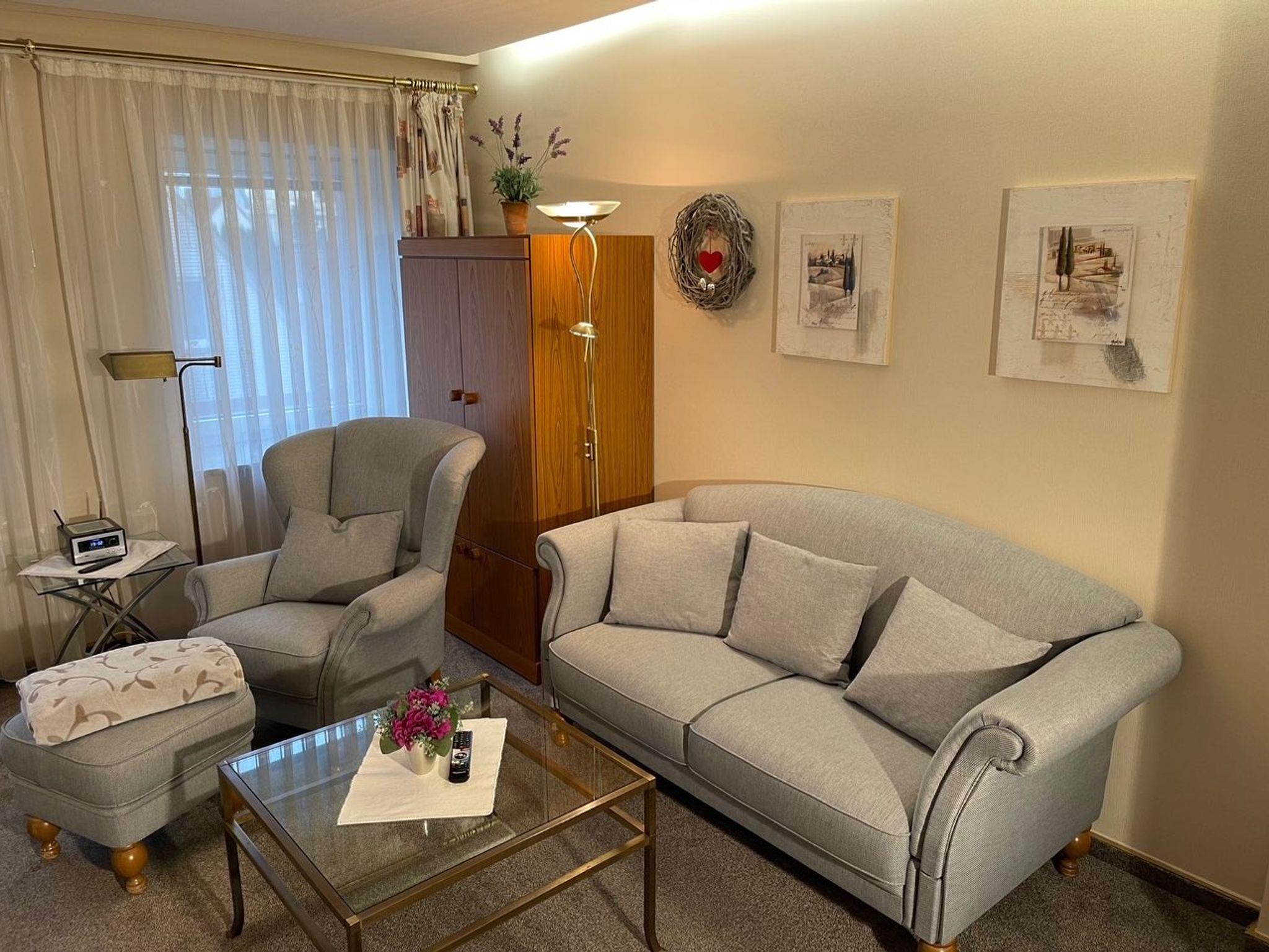 Die komfortable eingerichtete Wohnung hat 58 qm und befindet sich in der 1. Etage unseres Zweifamilienhauses. Die Wohnung ist geräumig und verfügt über 3 Zimmer mit separater Küche. Die Küche ist ausgestattet mit einem 4 Platten-Herd, Mikrowelle, Geschirrspüler, Kühlschrank mit Gefrierfach. Vom Esszimmer aus können Sie auf der Balkon-Terrasse eine schöne Aussicht ins Grüne genießen. Das Badezimmer ist hell und freundlich und verfügt über eine Dusche. Das Schlafzimmer ist für 2 Personen mit einem Boxspringbett und das Wohnzimmer bietet bequem Platz für eine 3. Person durch ein wegklappbares Schrankbett.