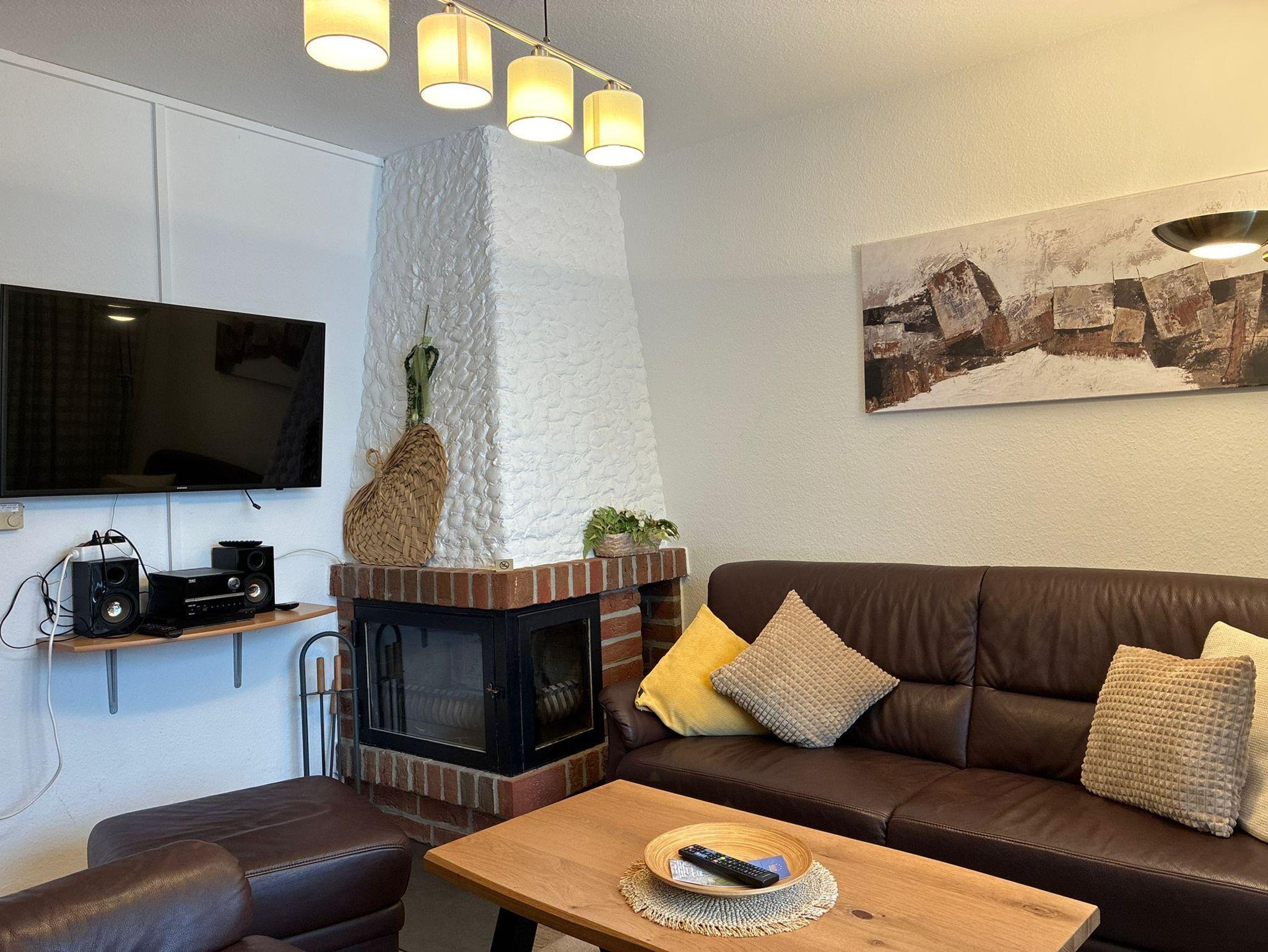 Der Wohnbereich hat einen gemauerten Kamin mit Heizeinsatz, eine Ledergarnitur, Flachbild Fernsehgerät mit SAT TV, eine Stereoanlage mit CD-Wechsler u. DVD Player.