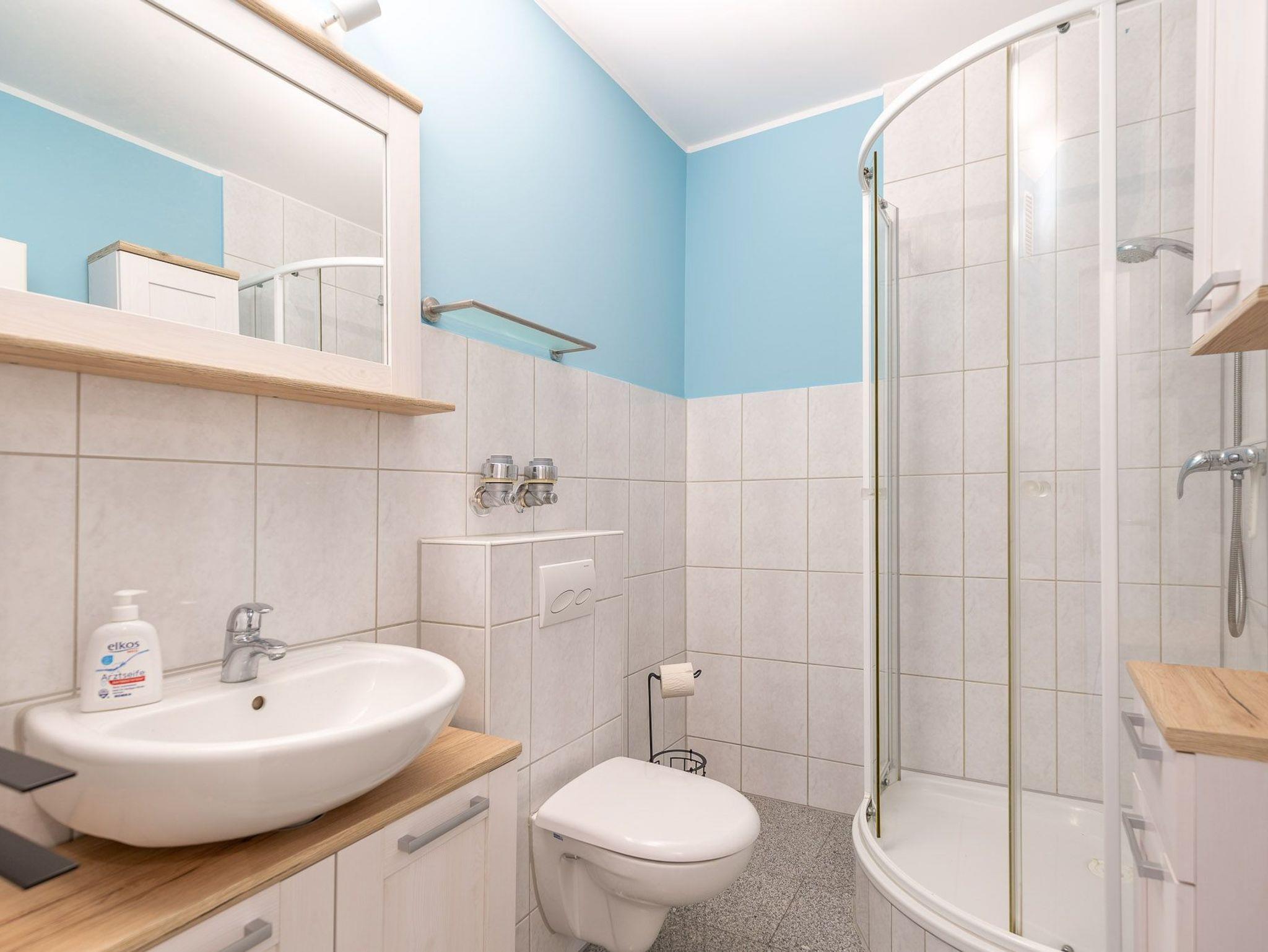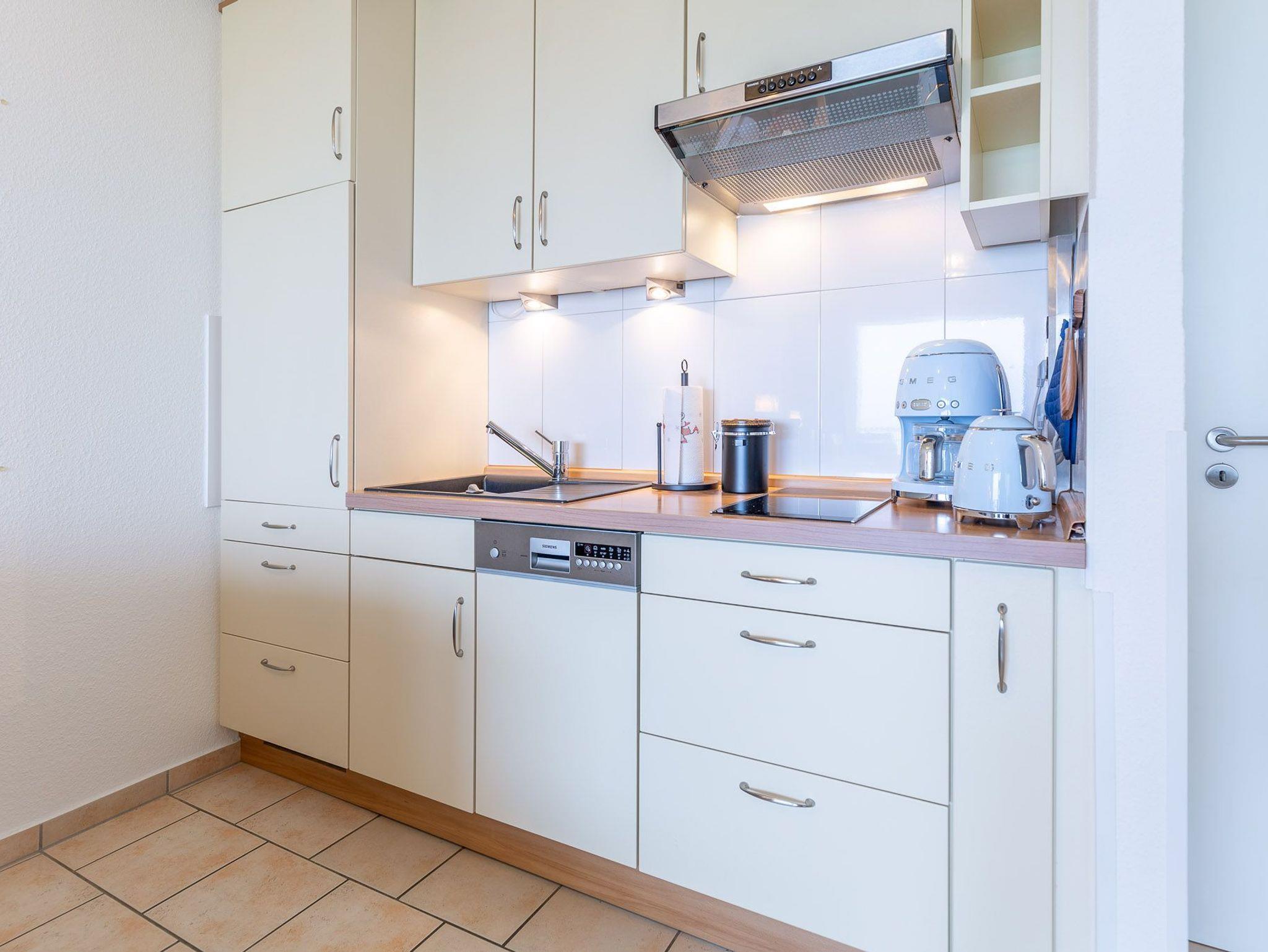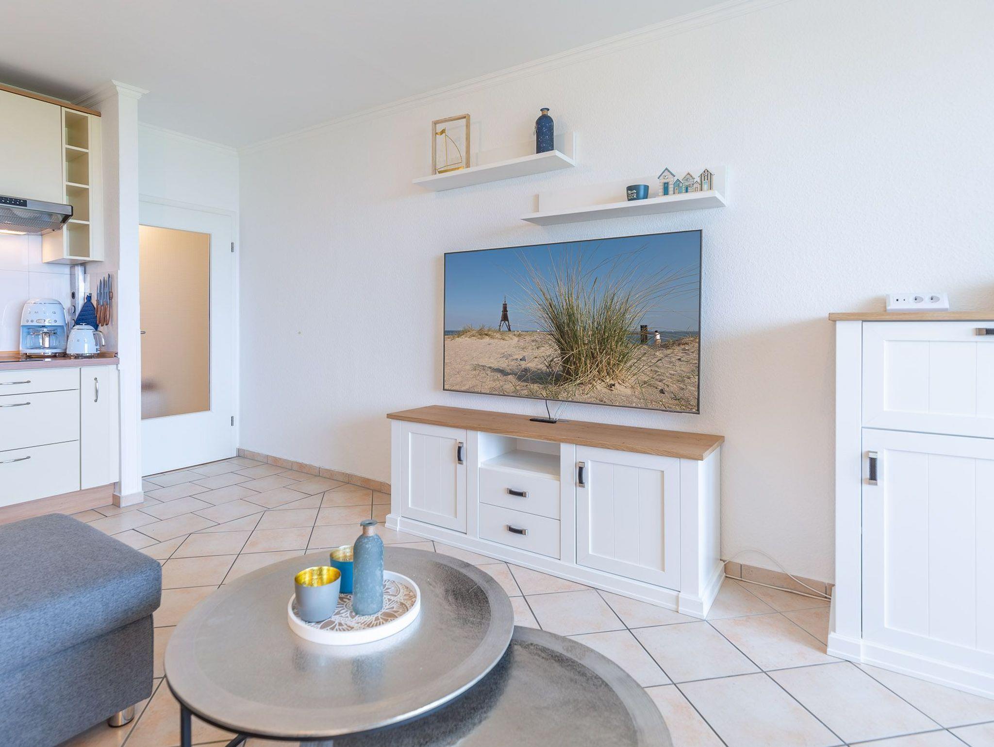 Der Flachbildfernseher im Wohnbereich gewährleistet, dass Sie auch im Urlaub nicht auf Ihre Lieblingsserie verzichten müssen. Die Küchenzeile ist mit einem Geschirrspüler, 2-Plattenherd, Kühlschrank und allen notwendigen Küchenutensilien ausgestattet. Ein separates Schlafzimmer mit komfortablen Betten gewährleistet einen erholsamen Schlaf. Elektrische Außenjalousien sorgen dafür, dass Sie nicht von der Morgensonne geweckt werden. Das Bad ist mit Dusche und WC ausgestattet. Zudem können Sie auf dem Balkon die frische Nordseeluft spüren, den Ausblick genießen und die Zeit vergessen. Zur Ferienwohnung gehört eine Garage (2,06 m Höhe, 2,20 m Breite (Garagentor) und ca. 5,00 m Länge).