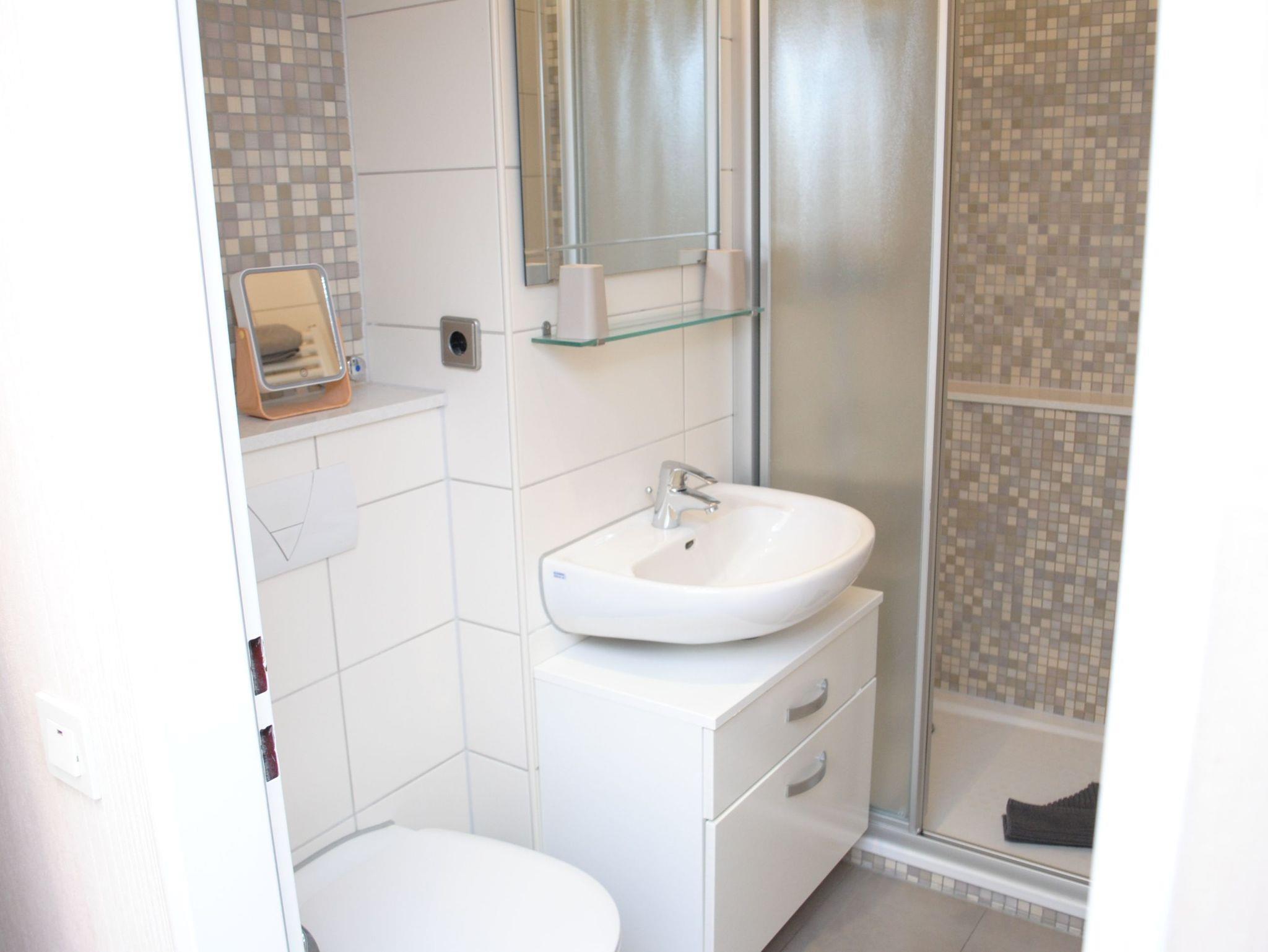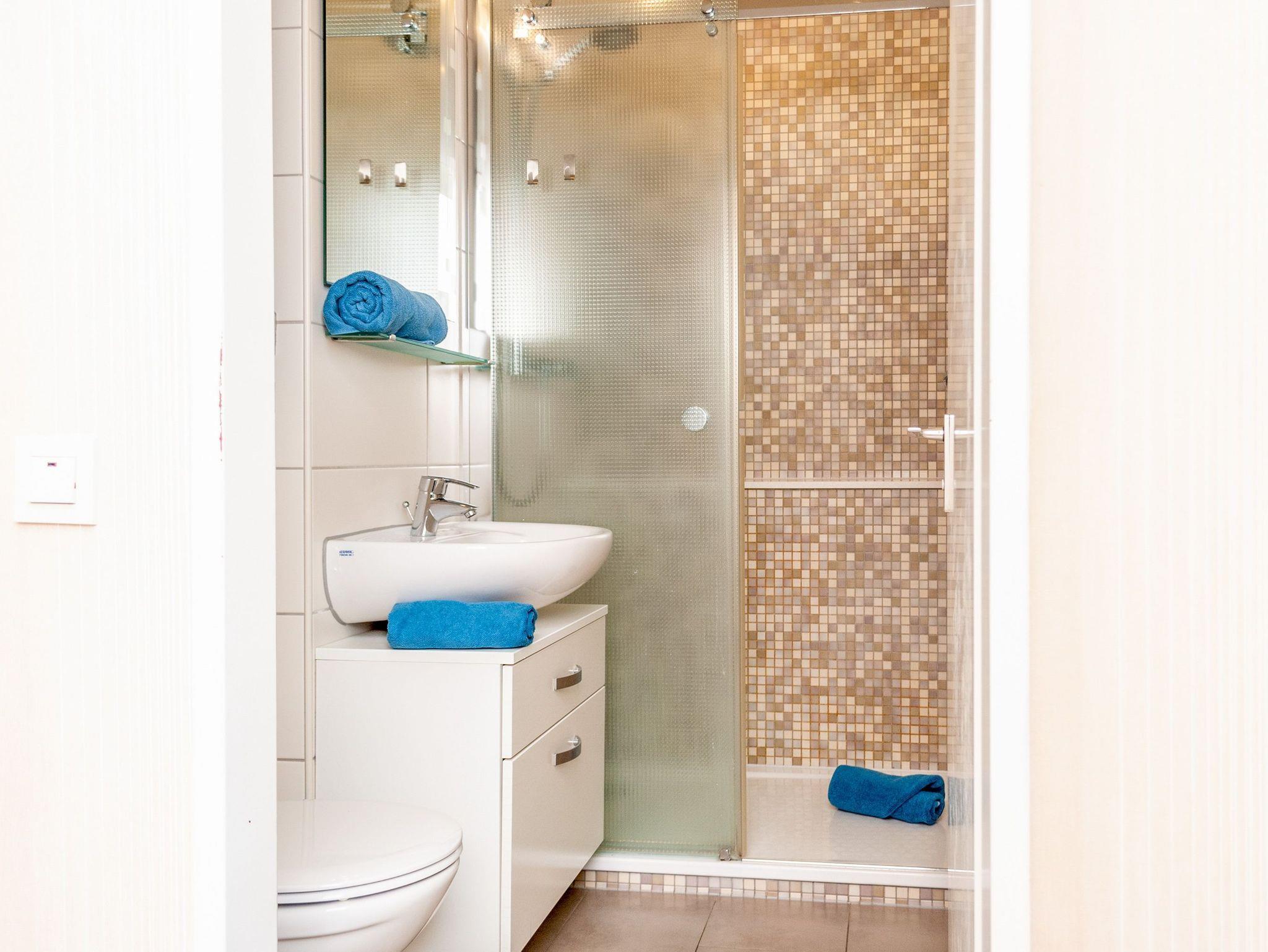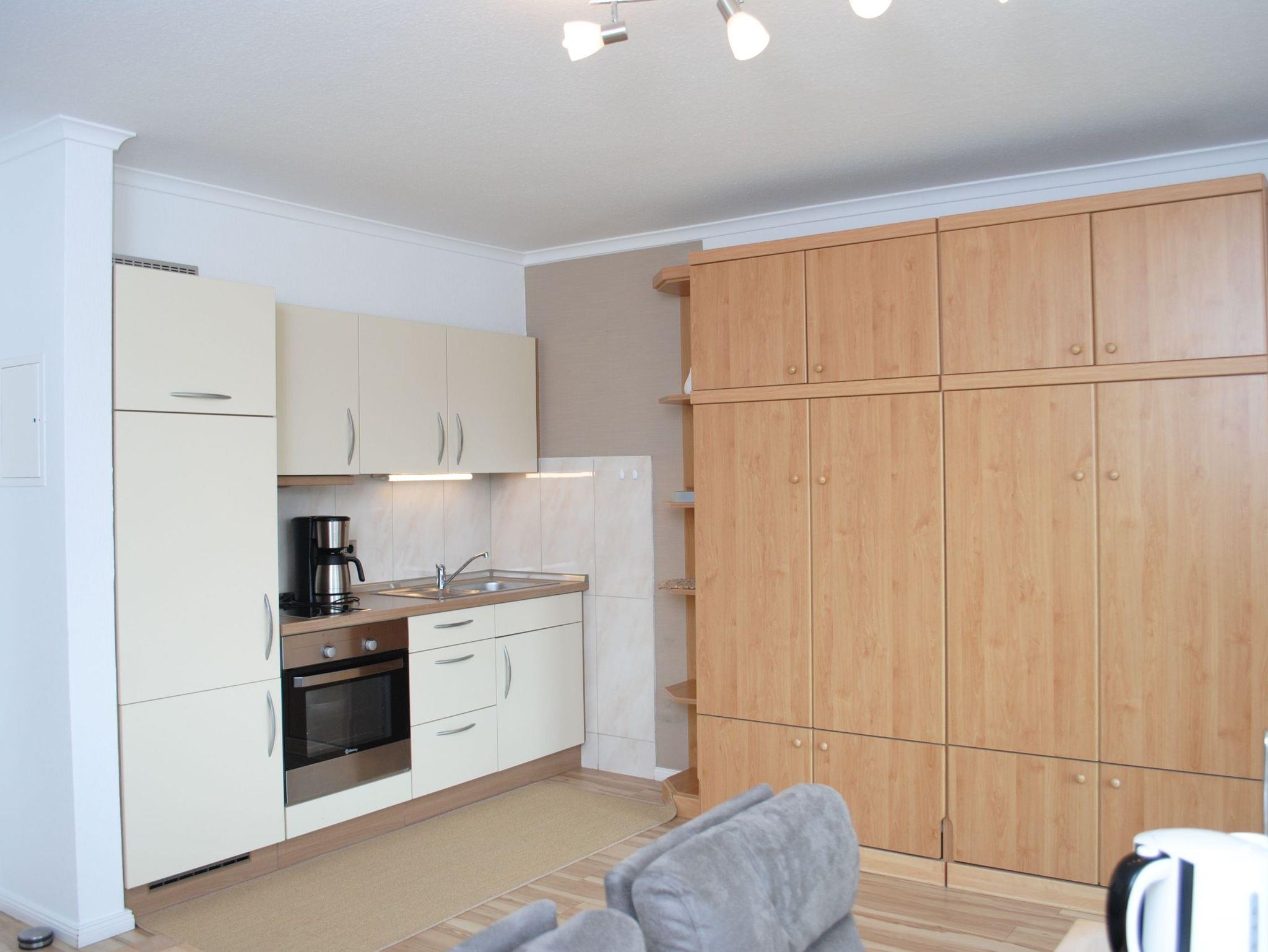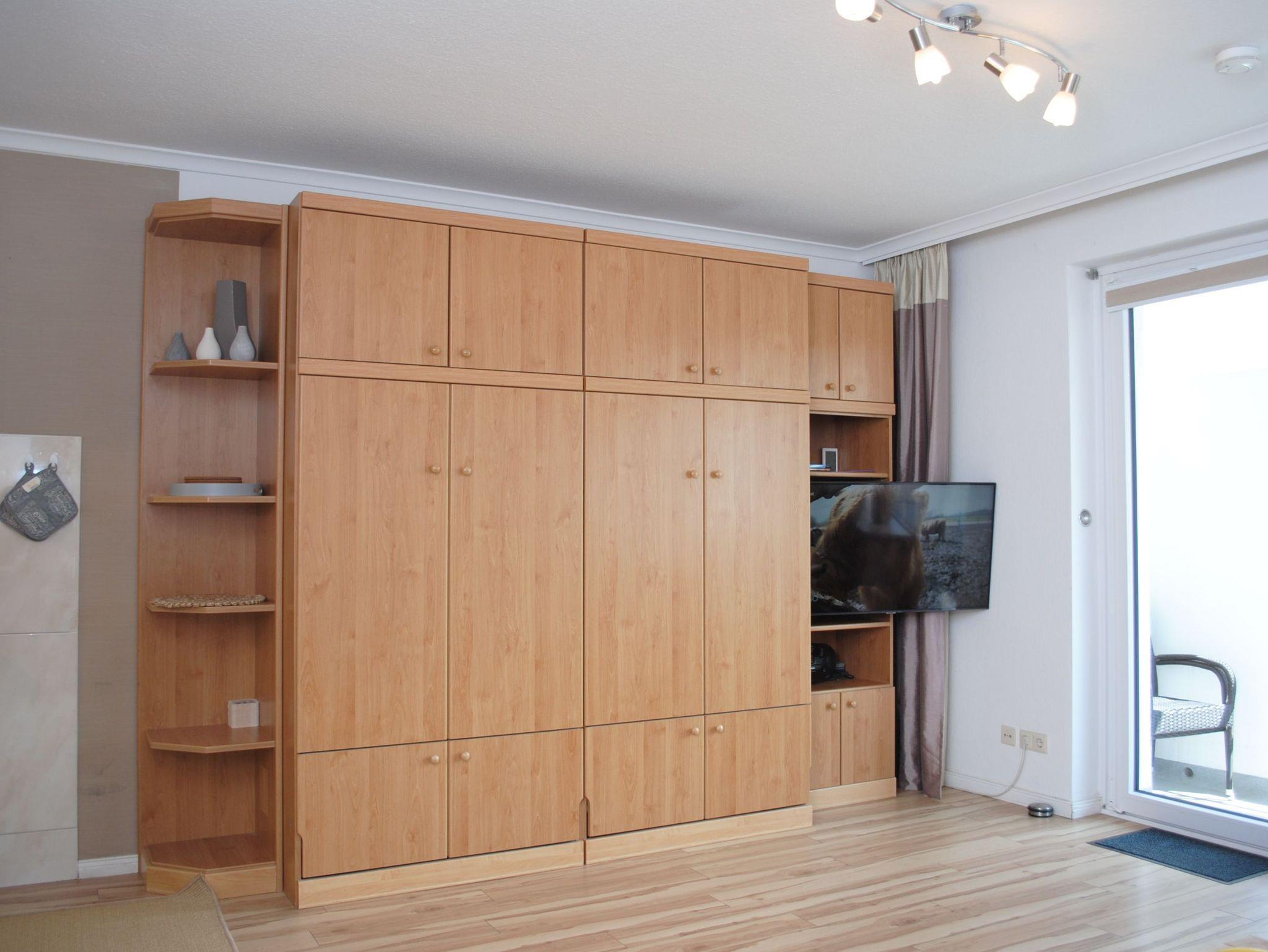 Das Apartment besteht aus einem Schlafzimmer mit 2 Einzelbetten, einem Wohnbereich mit zusätzlichem Schrankbett für 2 Personen und einem Badezimmer mit Dusche sowie WC. Die Ferienwohnung beinhaltet eine voll ausgestattete offene Küche.