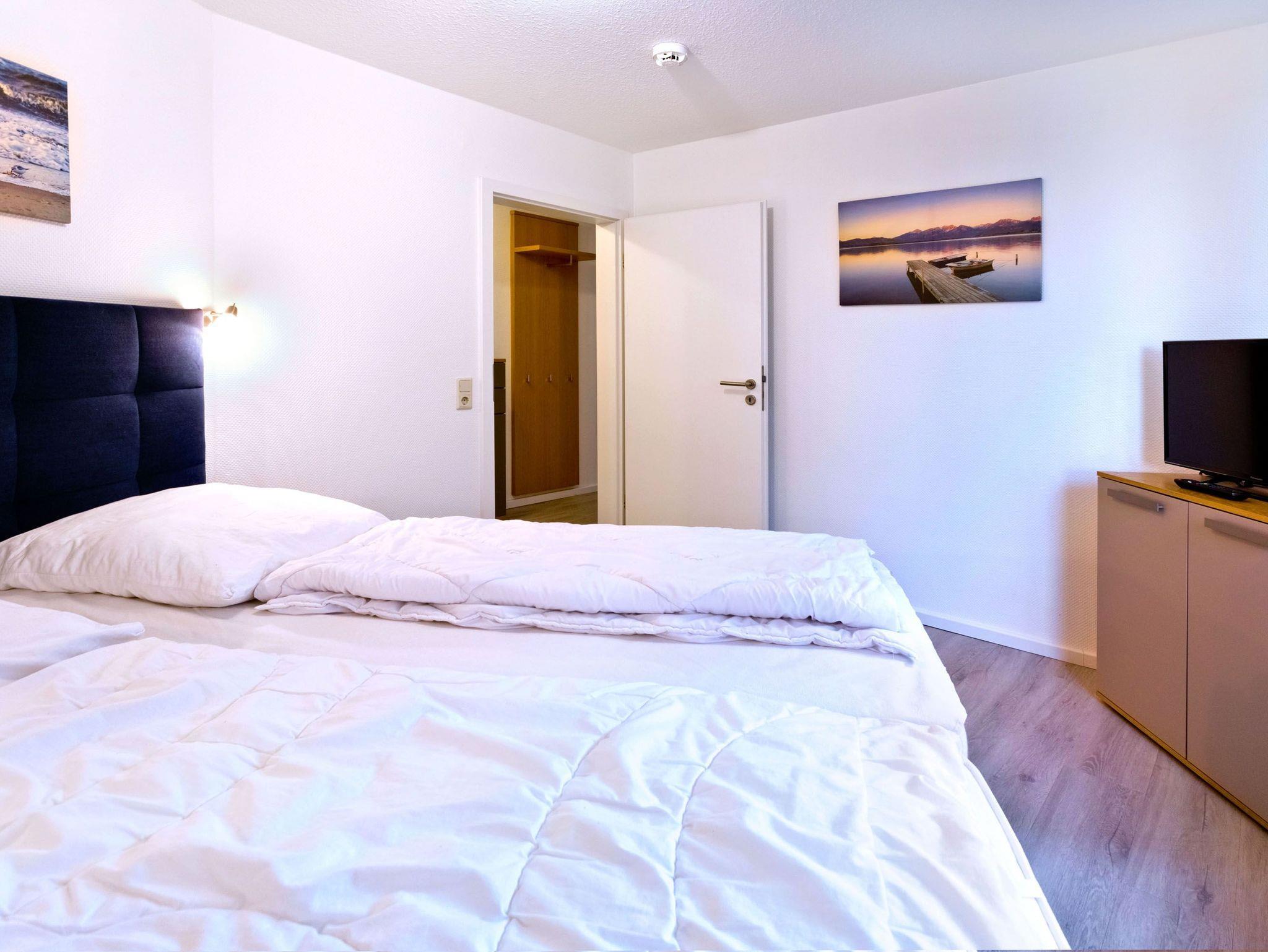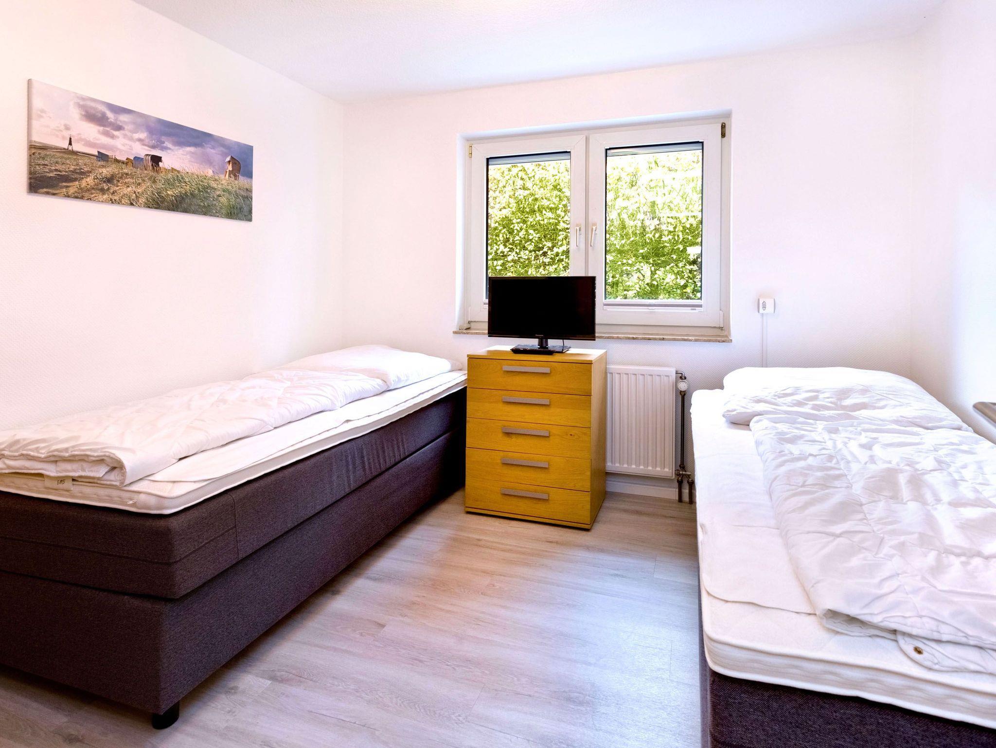 3-Raum-Parterrewohnung, ca. 52m², komplett ausgestattet bis 4 Pers., 1 Schlafzimmer mit Doppelbett, 1 Schlafzimmer mit 2 Einzelbetten, (beide Schlafzimmer mit elektr. Rollläden), Wohnzimmer mit Küchenzeile (Back., Mikrow., Geschirrspüler) 3xKabel-TV, W-Lan kostenfrei, Dusche/WC, Flur, alles gefliest, keine Haustiere, Nichtraucher, Pkw-Stellplatz