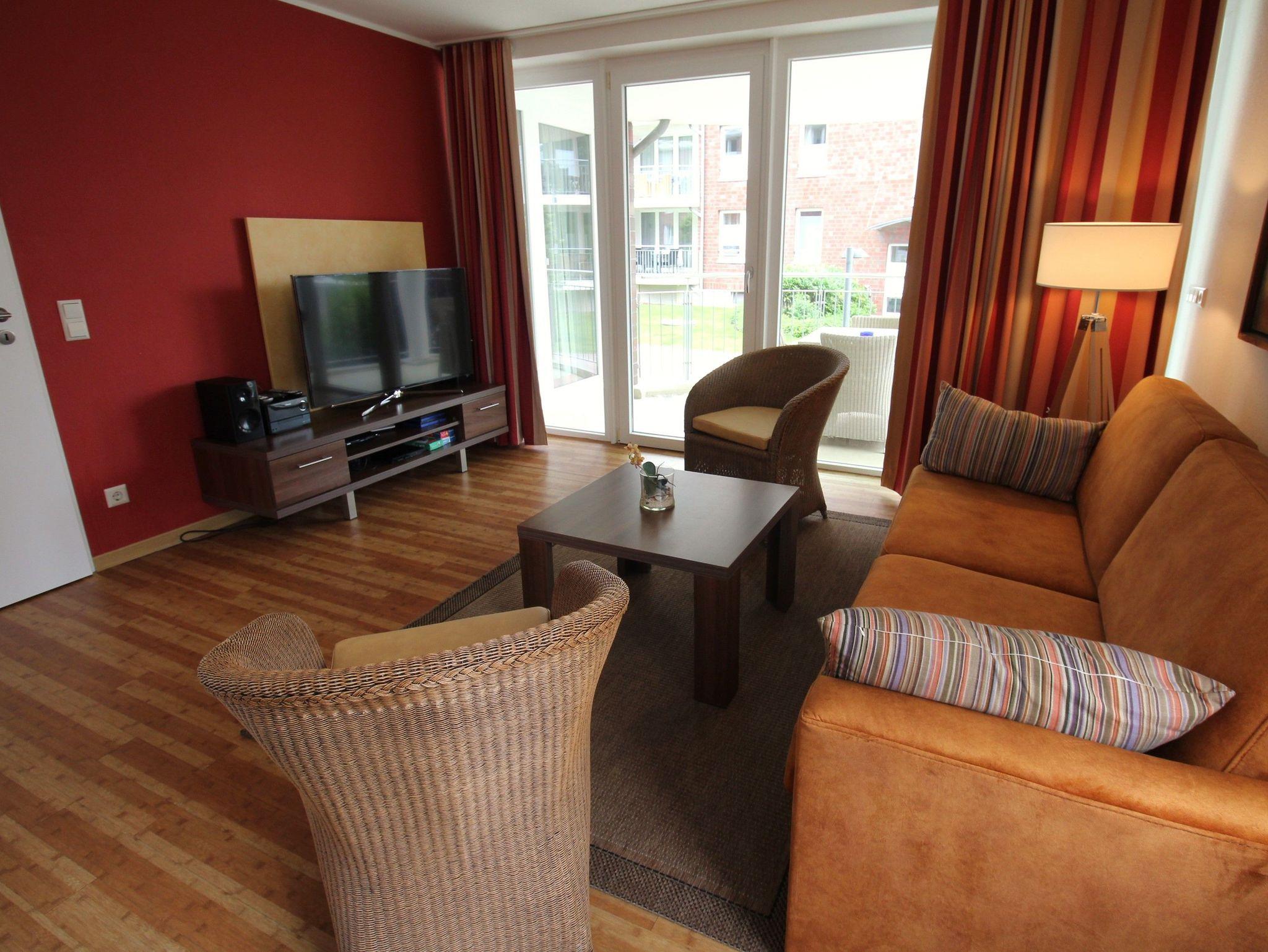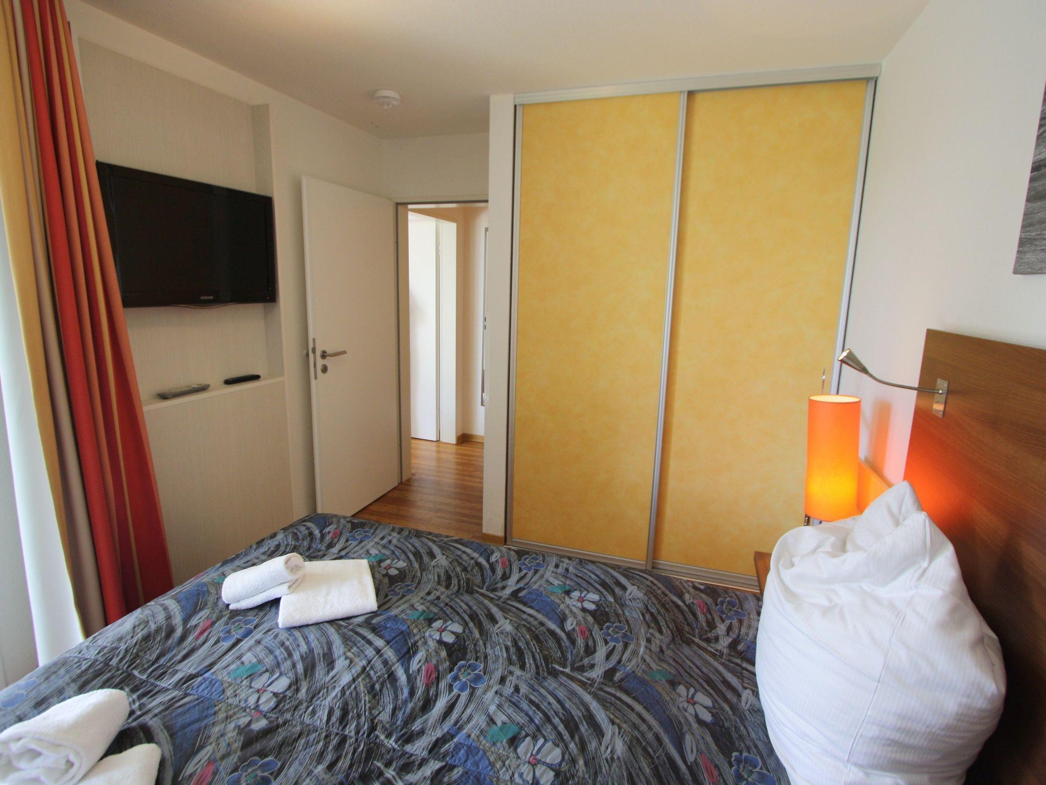 Sie wohnen in einem 3-Zimmer-Appartement für bis zu 6 Personen auf ca. 69 m² im Erdgeschoss. Zwei Schlafzimmer mit Doppelbett (ein Schlafzimmer mit TV-Flachbildschirm), großer heller Wohn-/Schlafraum mit bequemer Doppelbettcouch 170 x 200 cm (Neu im Jahr 2024), separater Essplatz, voll ausgestatteter Küchenbereich mit Geschirrspüler, Mikrowelle und Senseo-Kaffeemaschine, Dusche/WC, großer möblierter Balkon, Abstellraum, SAT-TV (Flachbildschirm) und Mini-HiFi-Anlage mit DVD-Player. Stellplatz für PKW in der Tiefgarage.