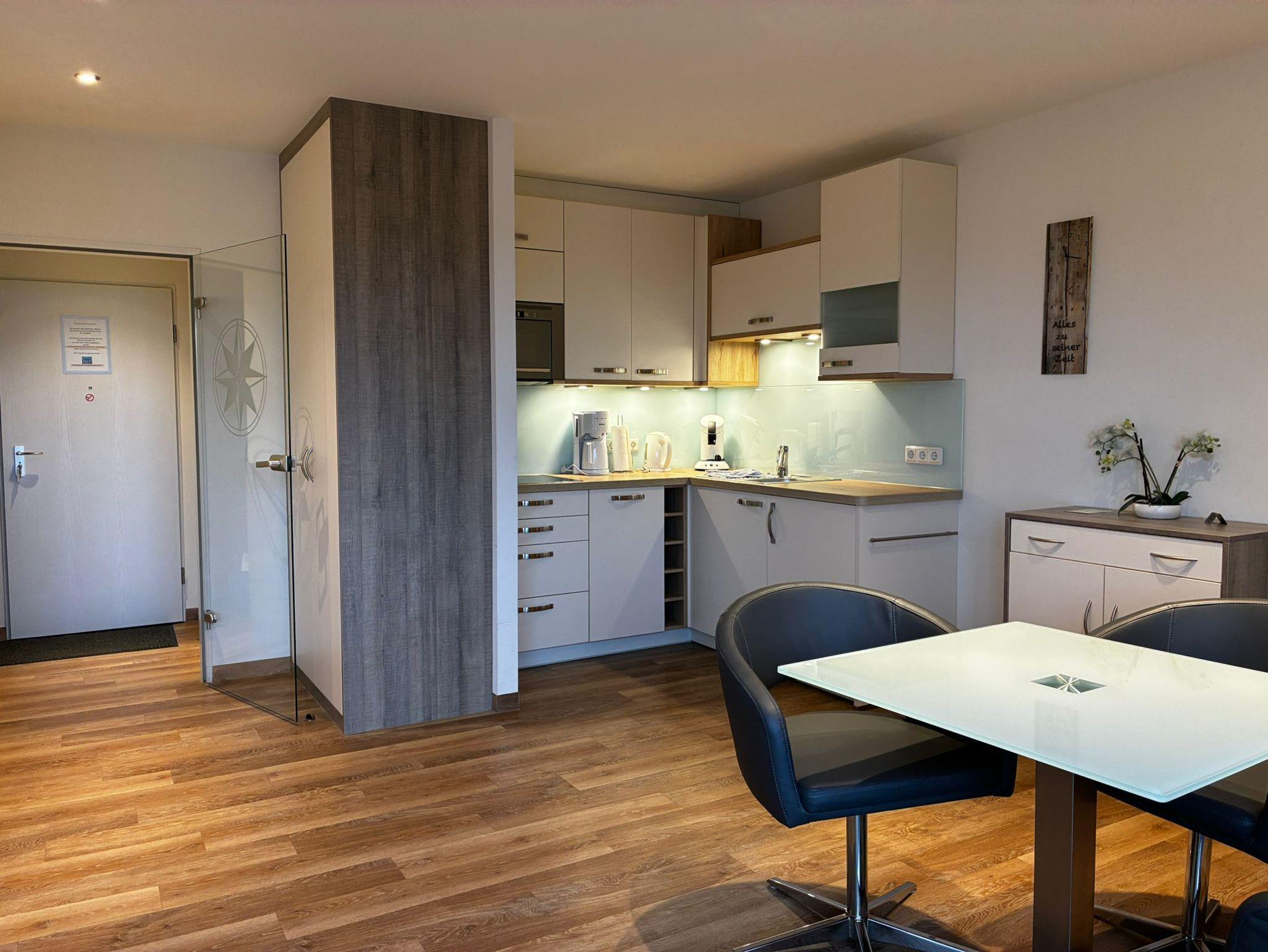 1-Zimmer-Appartement für bis zu 2 Personen, ca. 47 m². Wohn-/Schlafraum mit Schlafnische / Raumteiler und Doppelbett, separater Essplatz und voll ausgestatteter Küchenbereich mit Geschirrspüler und Mikrowelle, Dusche / WC, Balkon, Kabel-LED-TV. Blu-ray Player, PKW-Stellplatz in der Tiefgarage, WLAN-Nutzung, Benutzung des Schwimmbades und der Saunen.