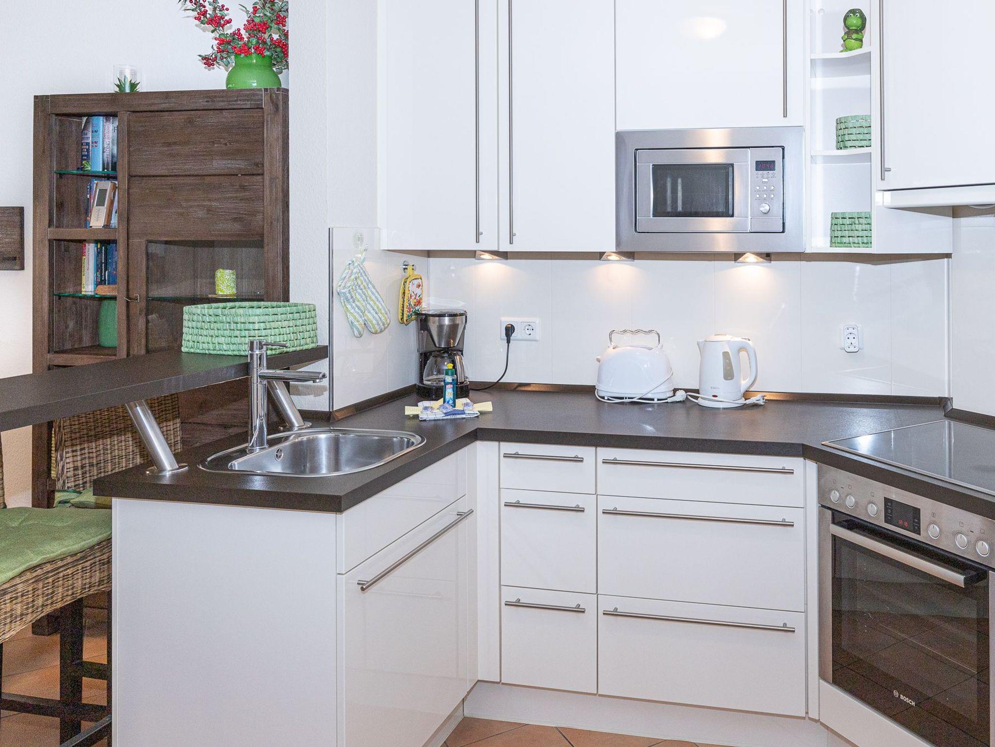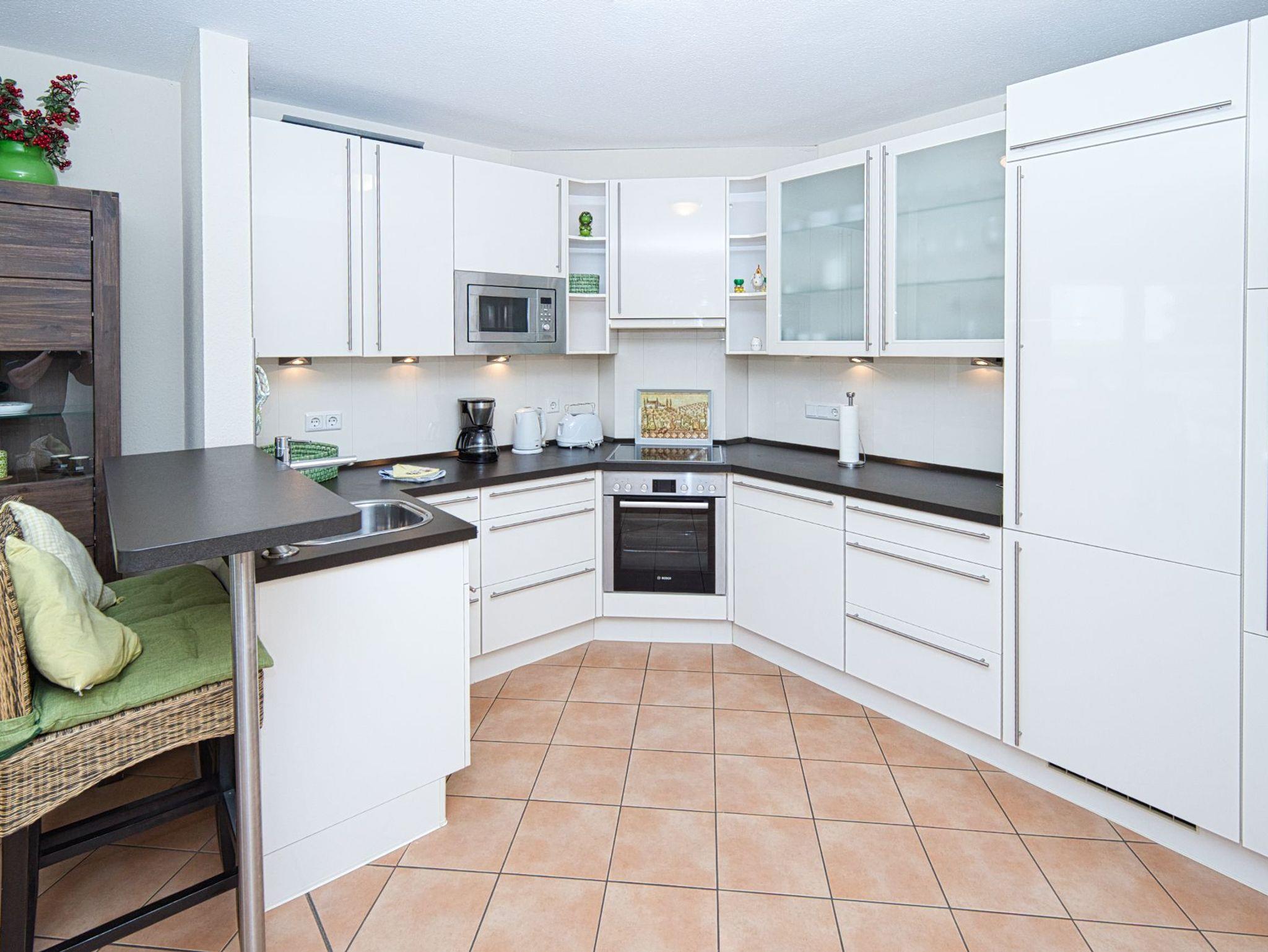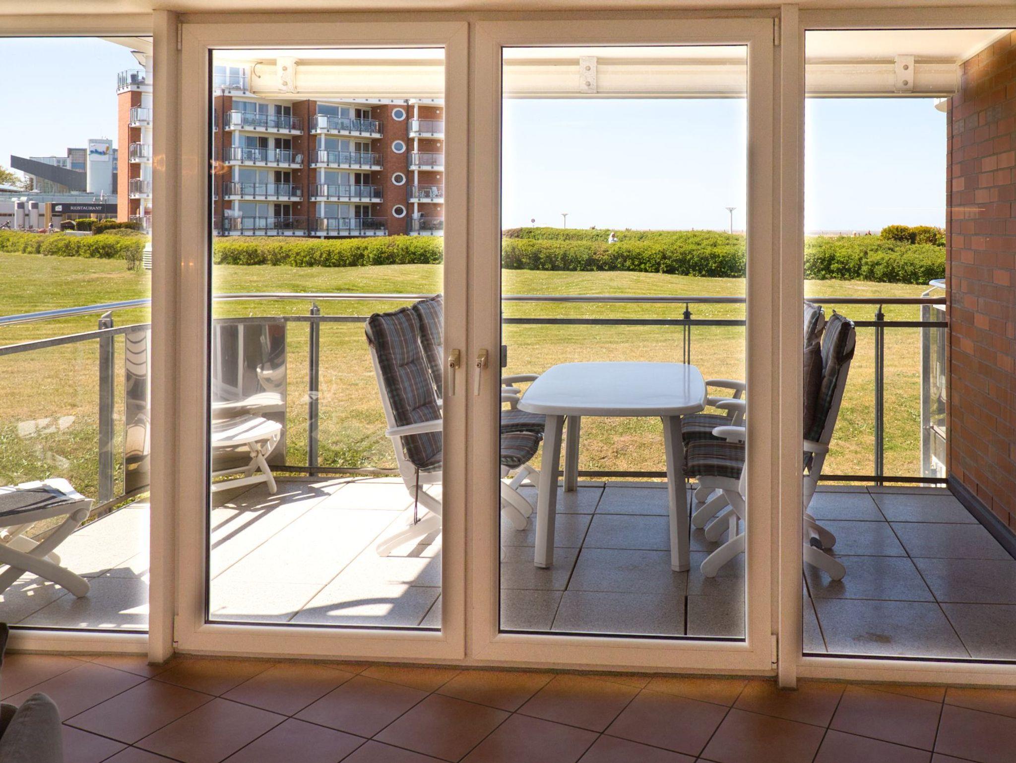 Der großzügige Wohn- und Essbereich lädt mit seiner hochwertigen Einrichtung und Fußbodenheizung zum Wohlfühlen ein. Die offene, komplett ausgestattete Einbauküche mit Tresen ist ideal, um einen Espresso zwischendurch zu genießen. Am Esstisch oder auf der gemütlichen Sofaecke lässt es sich entspannt frühstücken oder den Tag bei einem Gesellschaftsspiel ausklingen ? stets mit herrlichem Blick auf die Nordsee. Der Wohnbereich bietet direkten Zugang zum Balkon, auf dem Sie die frische Meeresbrise und den Blick auf die Strandpromenade genießen können.