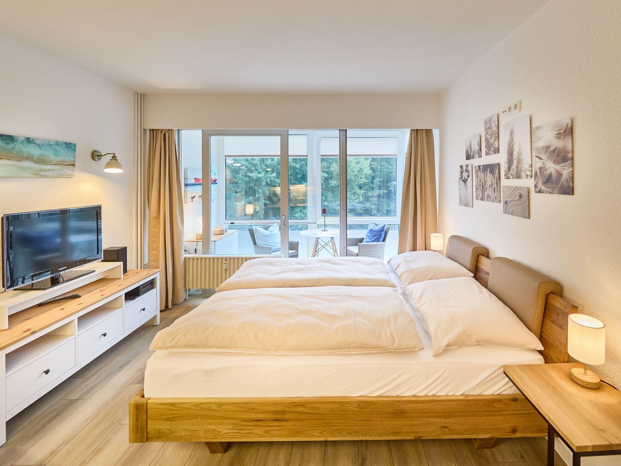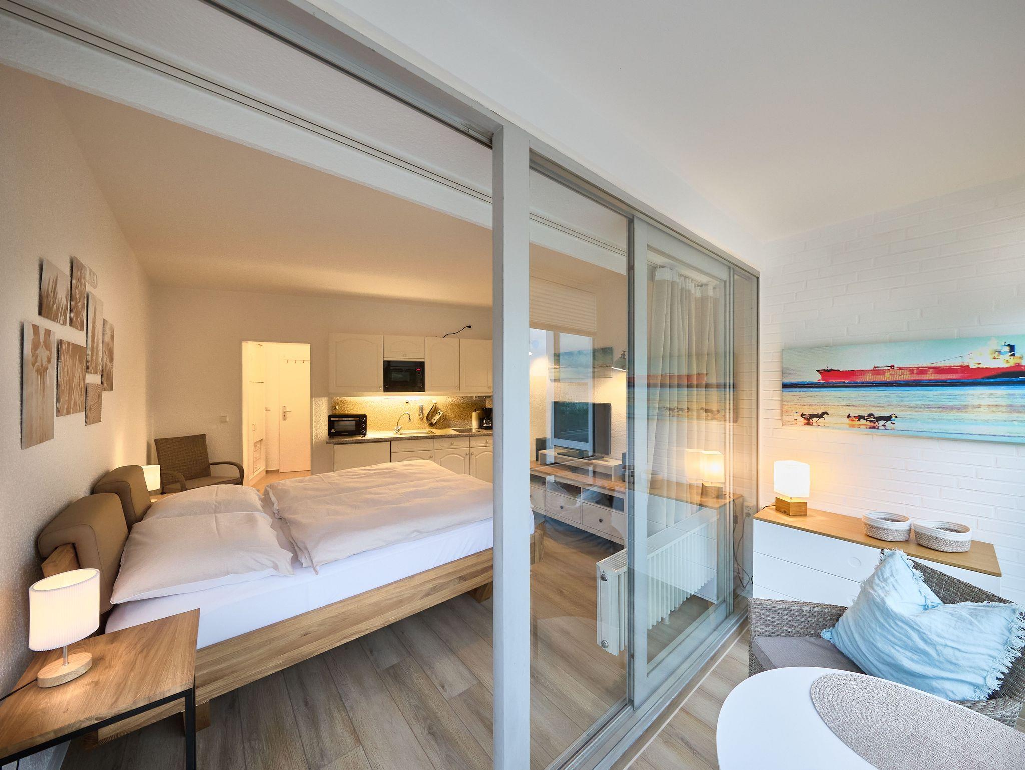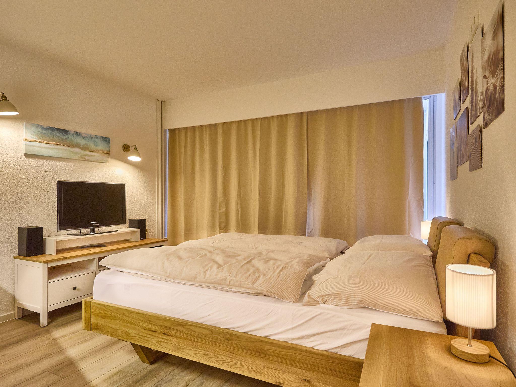 Der Schlafbereich ist mit einem bequemen Doppelbett und Nachtschränken, sowie Radio und TV ausgestattet, sodass Sie sich nach einem langen Tag am Strand bestens erholen können. Der Kleiderschrank befindet sich dafür im Eingangsbereich. Das Appartement liegt unmittelbar am Strand und bietet Ihnen eine ruhige Lage am Dünenweg. Die Duhner Heide ist nicht weit entfernt, und auch das Duhner Zentrum mit dem malerischen Dorfbrunnen erreichen Sie in wenigen Minuten.