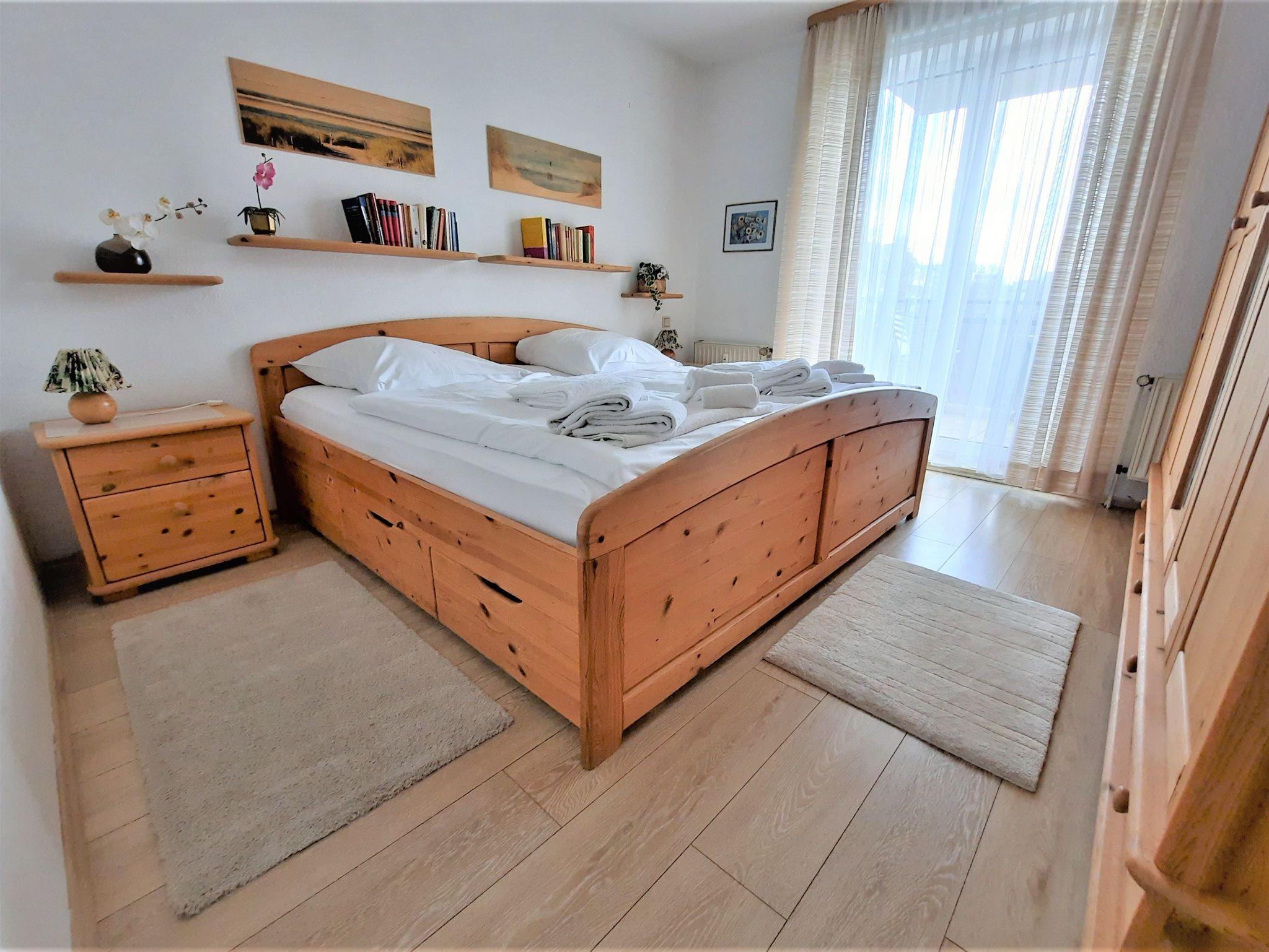 Sie wohnen in einem 2-Zimmer-Appartement für bis zu 2 Personen auf 46 m² Wohnfläche im 2. Obergeschoss. Ein Schlafzimmer mit Doppelbett, Wohnraum, separater Essplatz mit Seeblick, voll ausgestatteter Küchenbereich mit Geschirrspüler und Mikrowelle, Dusche/WC, SAT-TV, Balkon. PKW-Stellplatz im Aussenbereich.