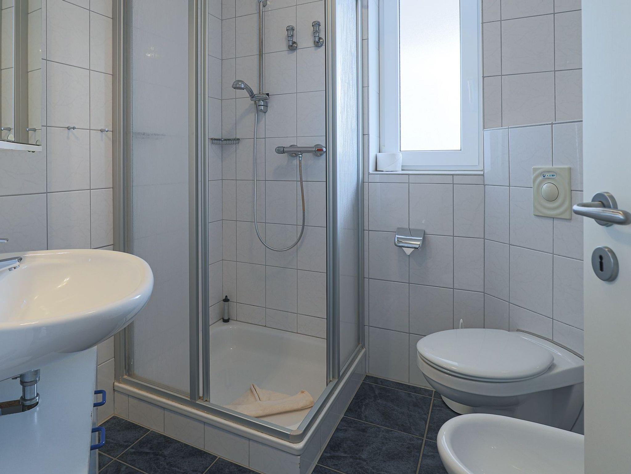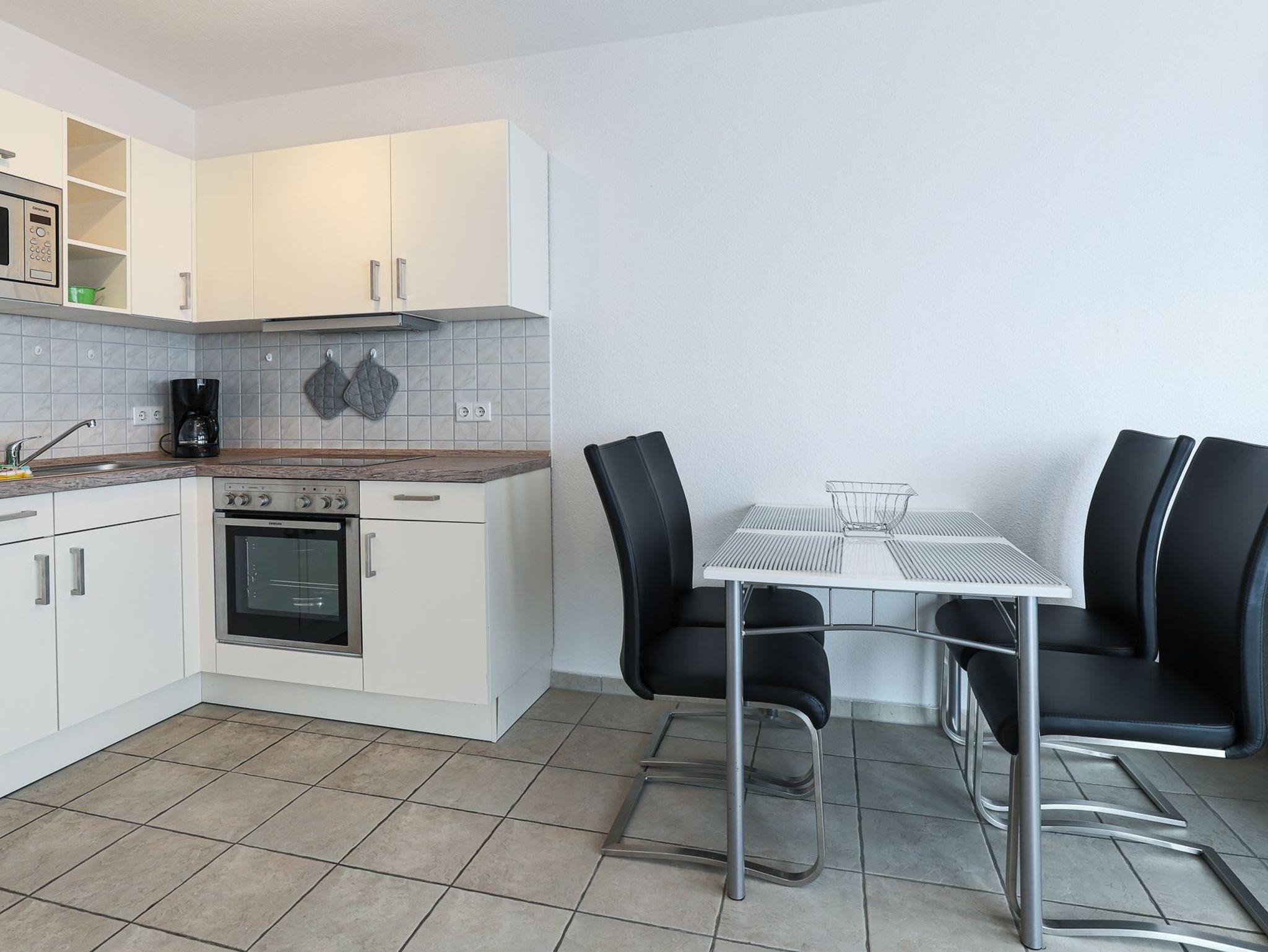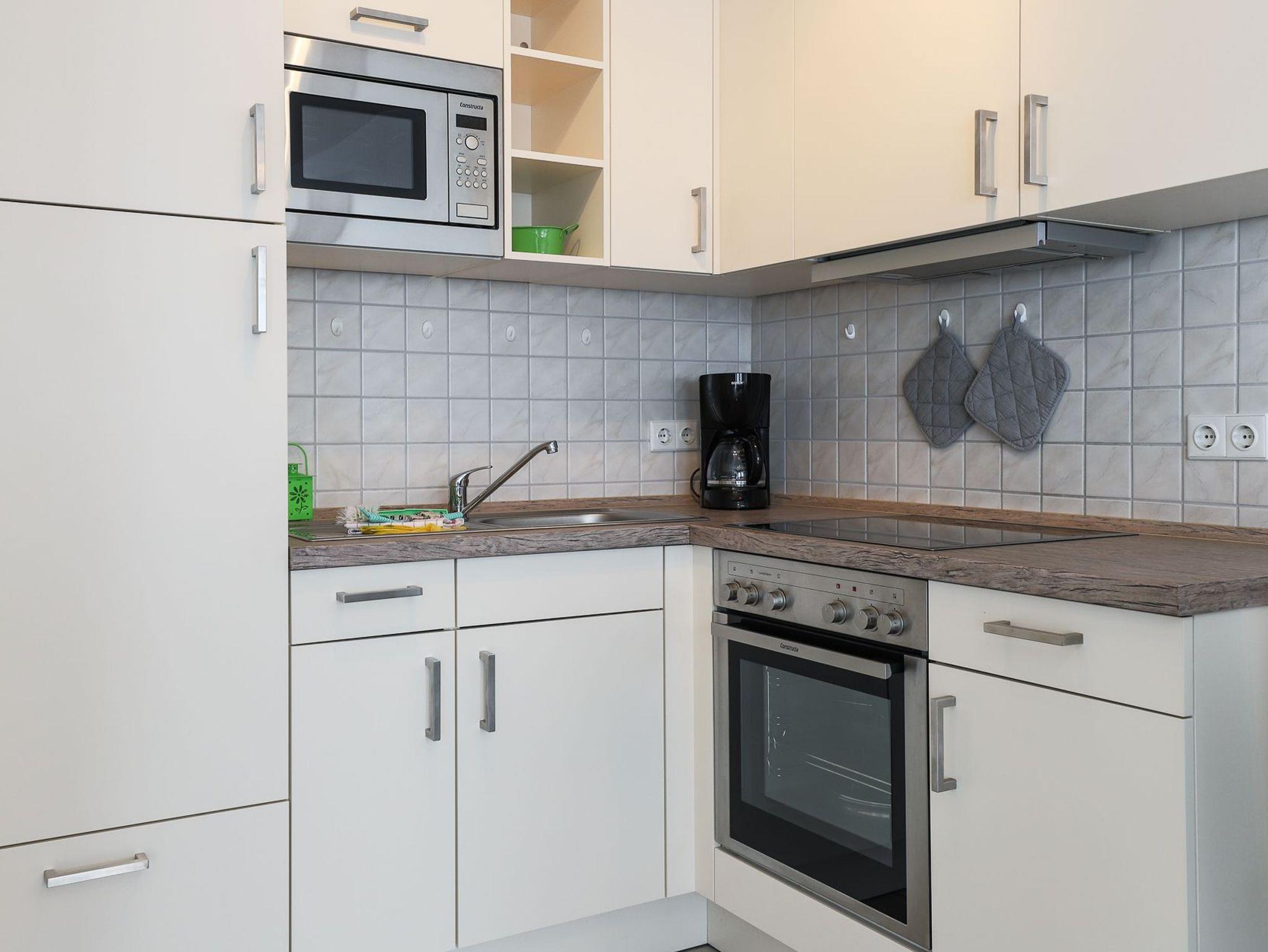 Die ca. 50 m² große, liebevoll eingerichtete 2-Raum-Wohnung im Hochparterre bietet Platz für bis zu drei Personen. Sie verfügt über einen einladenden Wohn- und Essbereich mit komfortabler Einbauküche, ein separates Schlafzimmer mit Kleiderschrank sowie ein modernes Duschbad (Dusche/WC) und einen Abstellraum. Alle Räume (außer Schlafzimmer) sind hell gefliest. Für die dritte Person steht im Wohnbereich ein bequemes Schlafsofa mit eigener Matratze zur Verfügung. Der großzügige Balkon in Ost-/Südausrichtung ist ideal, um in der Morgensonne zu frühstücken oder am frühen Nachmittag in der Sonne zu entspannen mit Blick ins Grüne und frischer Nordseeluft.