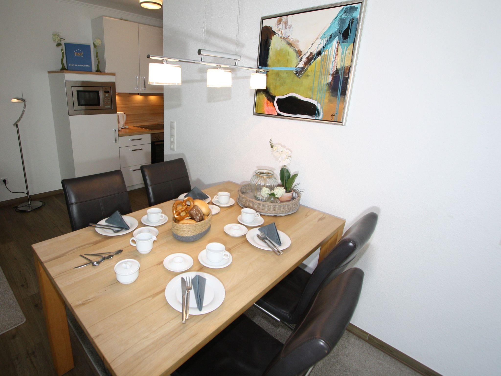Separater Essplatz, voll ausgestatteter Küchenbereich mit Geschirrspüler und Mikrowelle, möblierter