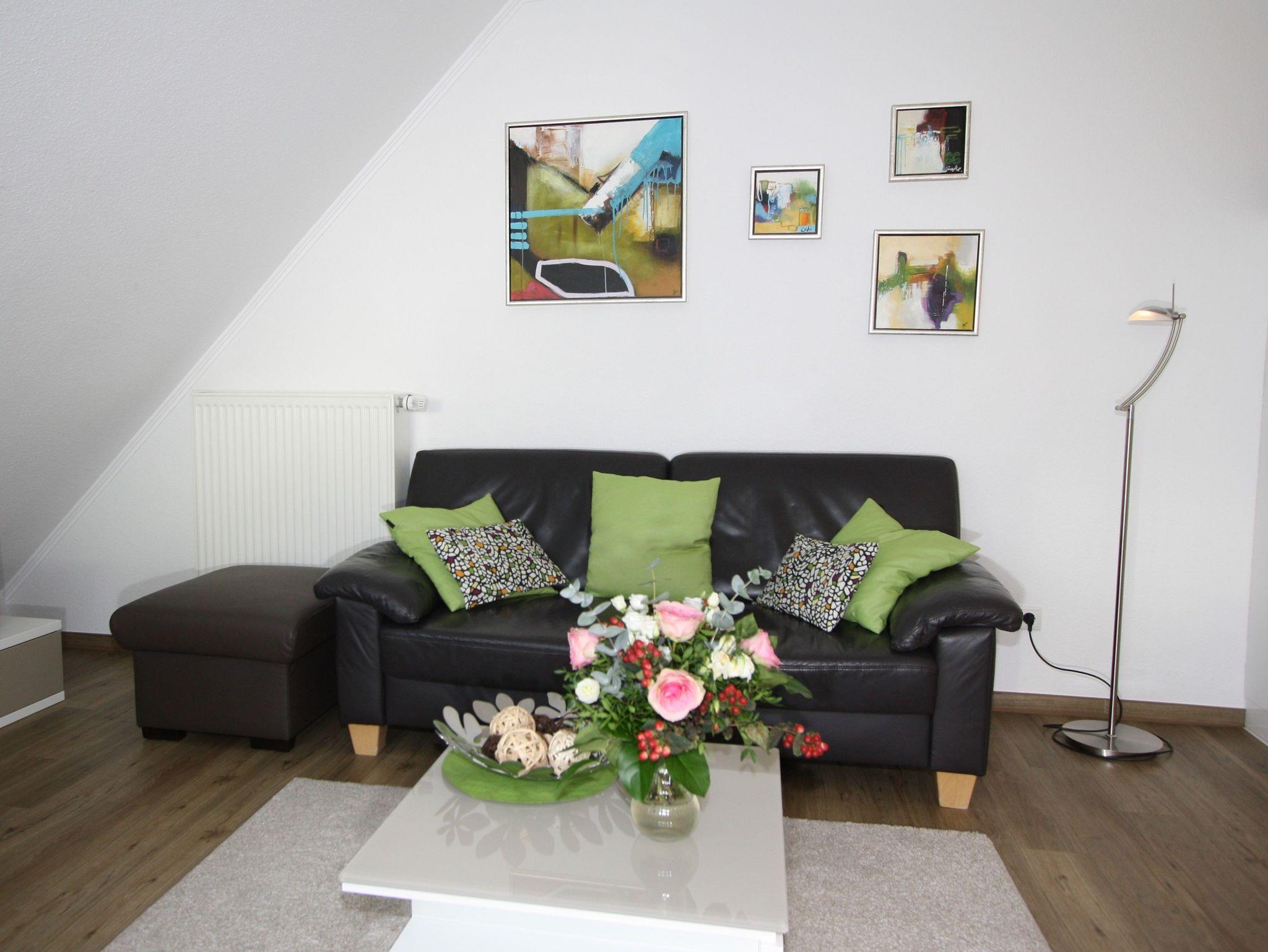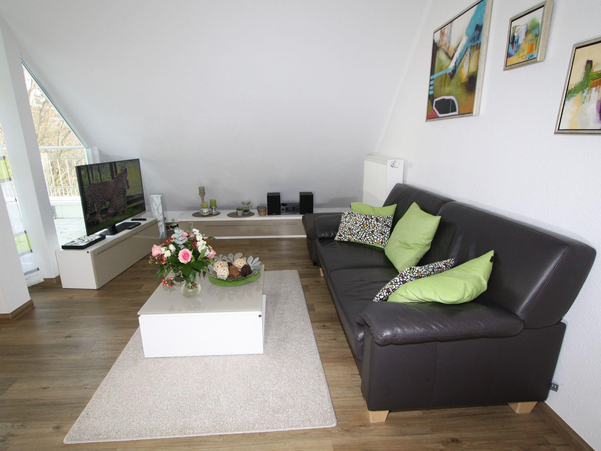 Im 3. Obergeschoss großer heller Wohnraum mit bequemer Couch, SAT-TV und Mini-HiFi-Anlage mit DVDPlayer.