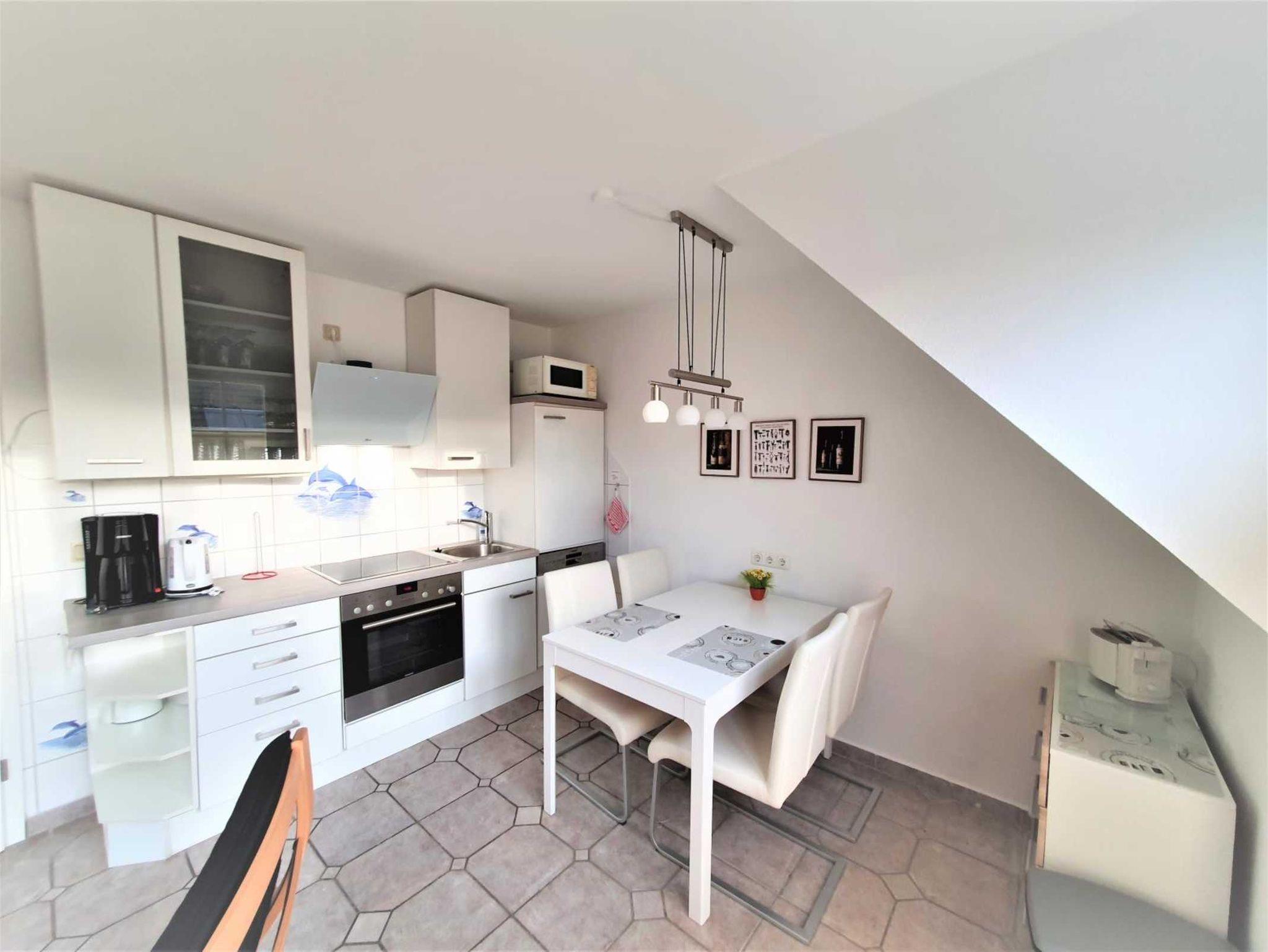 In der offenen Küchen stehen Ihnen ein Umluftherd mit Ceranfeld, ein Geschirrspüler, ein Kühlschrank, eine Mikrowelle sowie diverse Küchenkleingeräte wie z.B. Wasserkocher, Kaffeemaschine, Toaster zur Verfügung. Geschirr und Gläser sind in ausreichendem Maß vorhanden.