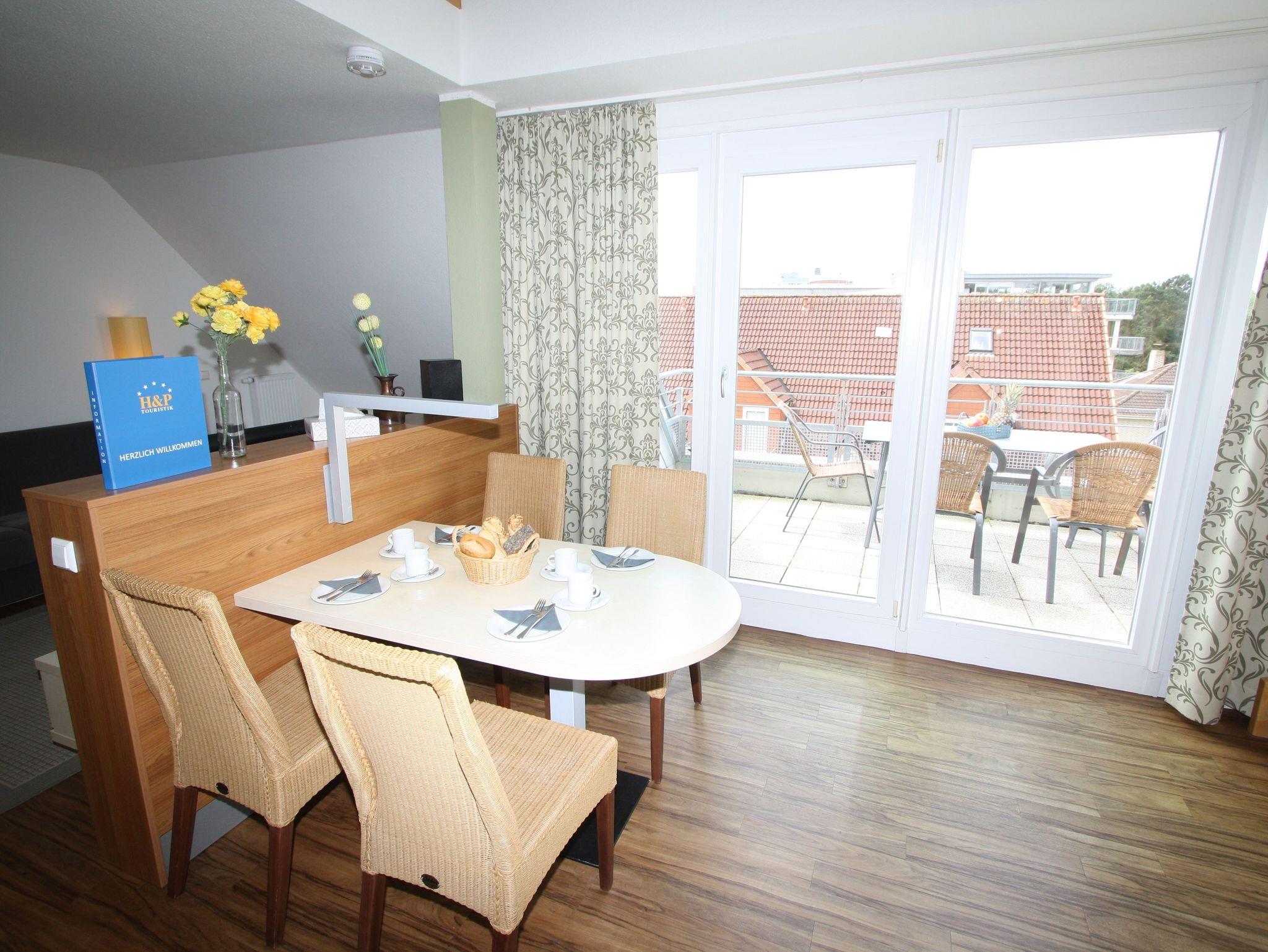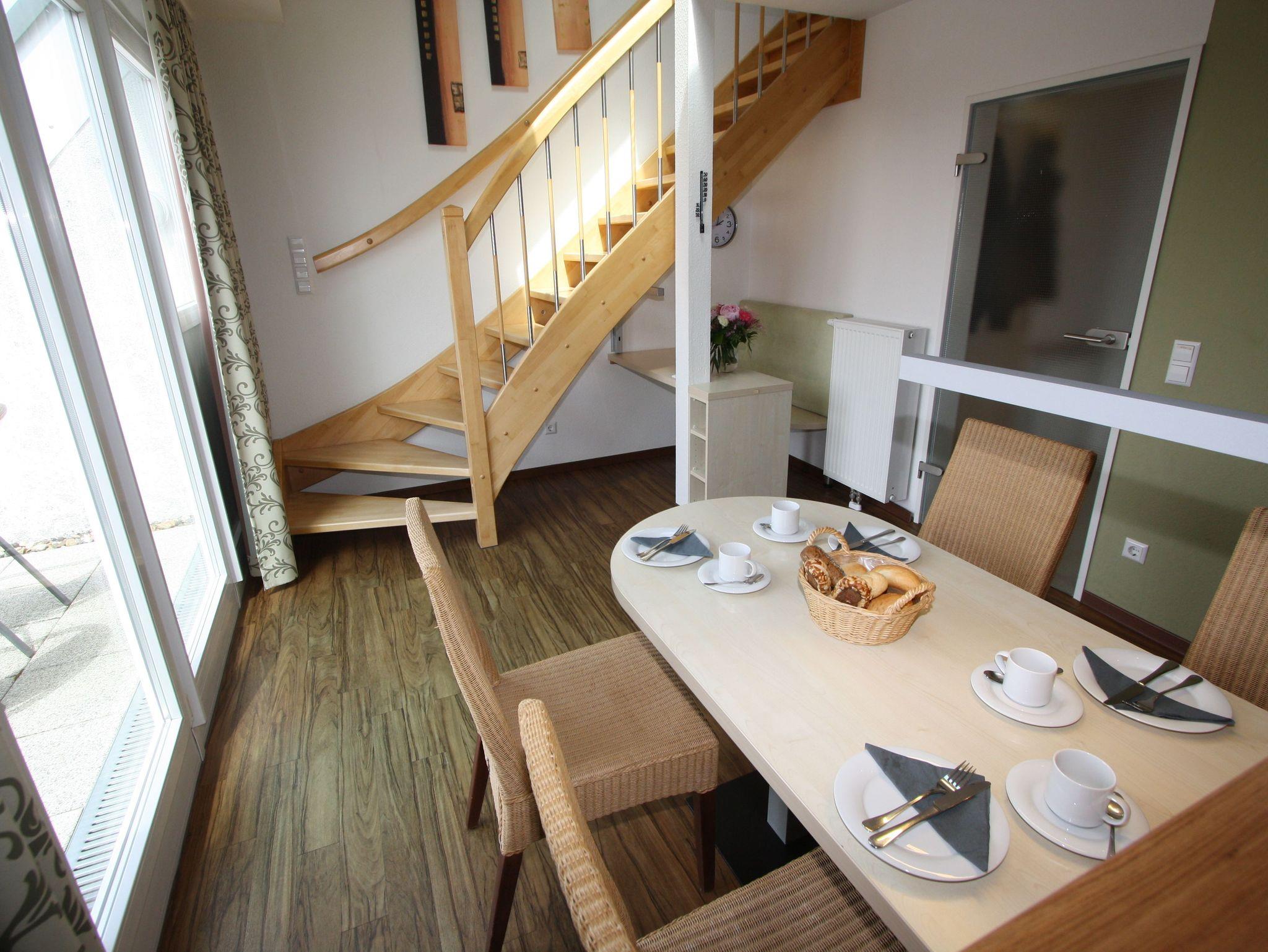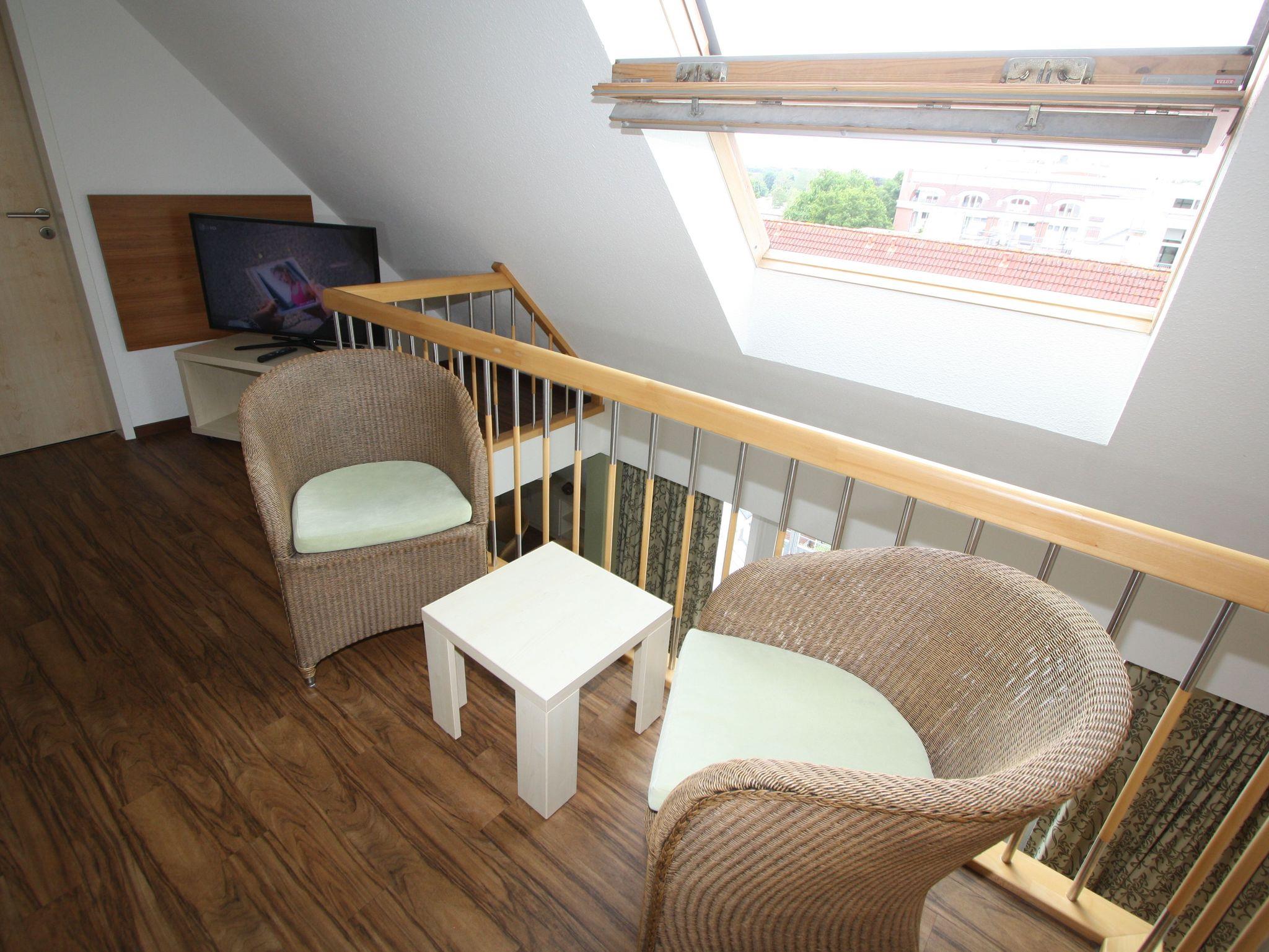 Sie wohnen in einem 2-Zimmer-Maisonette-Appartement für bis zu 4 Personen auf 62 m² Wohnfläche. Im 3. Obergeschoss großer heller Wohn-/Schlafraum mit bequemer Doppelbettcouch, SAT-TV (Flachbildschirm). separater Essplatz, voll ausgestatteter Küchenbereich mit Geschirrspüler und Mikrowelle, große möblierte Dachterrasse, separates Gäste-WC und Abstellraum. Im offenen Galeriegeschoss ein Schlafzimmer mit Doppelbett und Zweitfernseher (Flachbildschirm), Tageslichtbad mit großer Dusche.