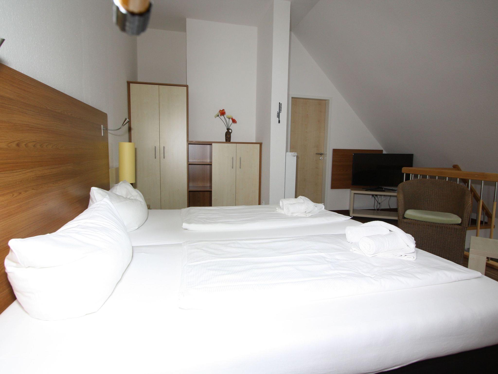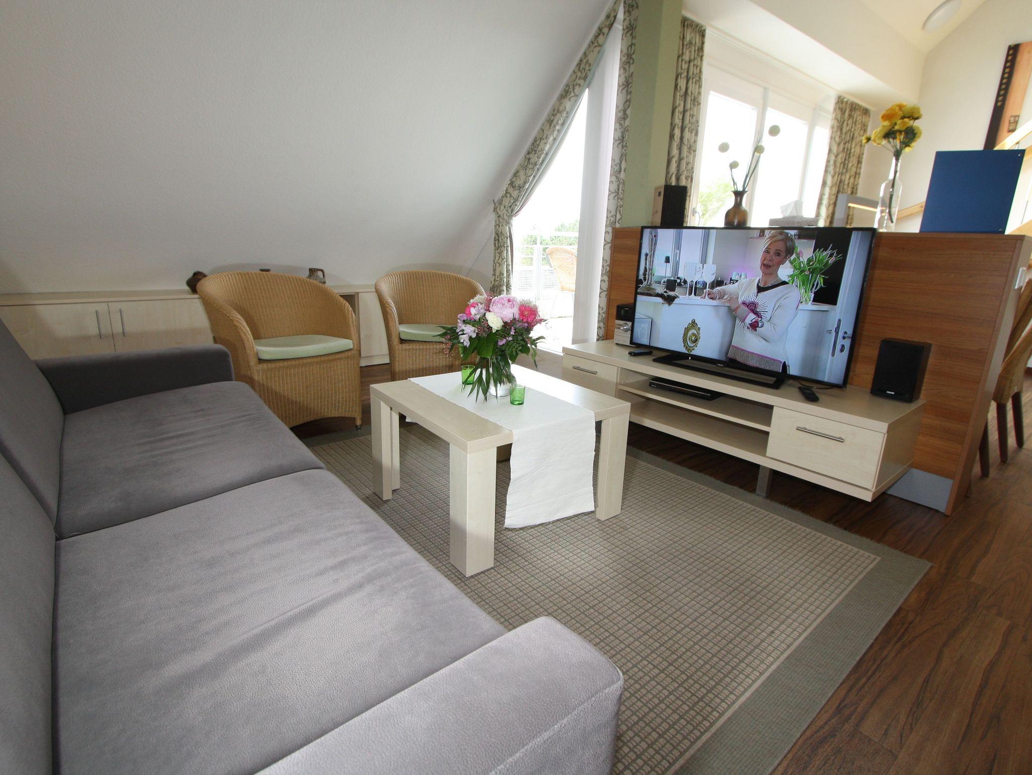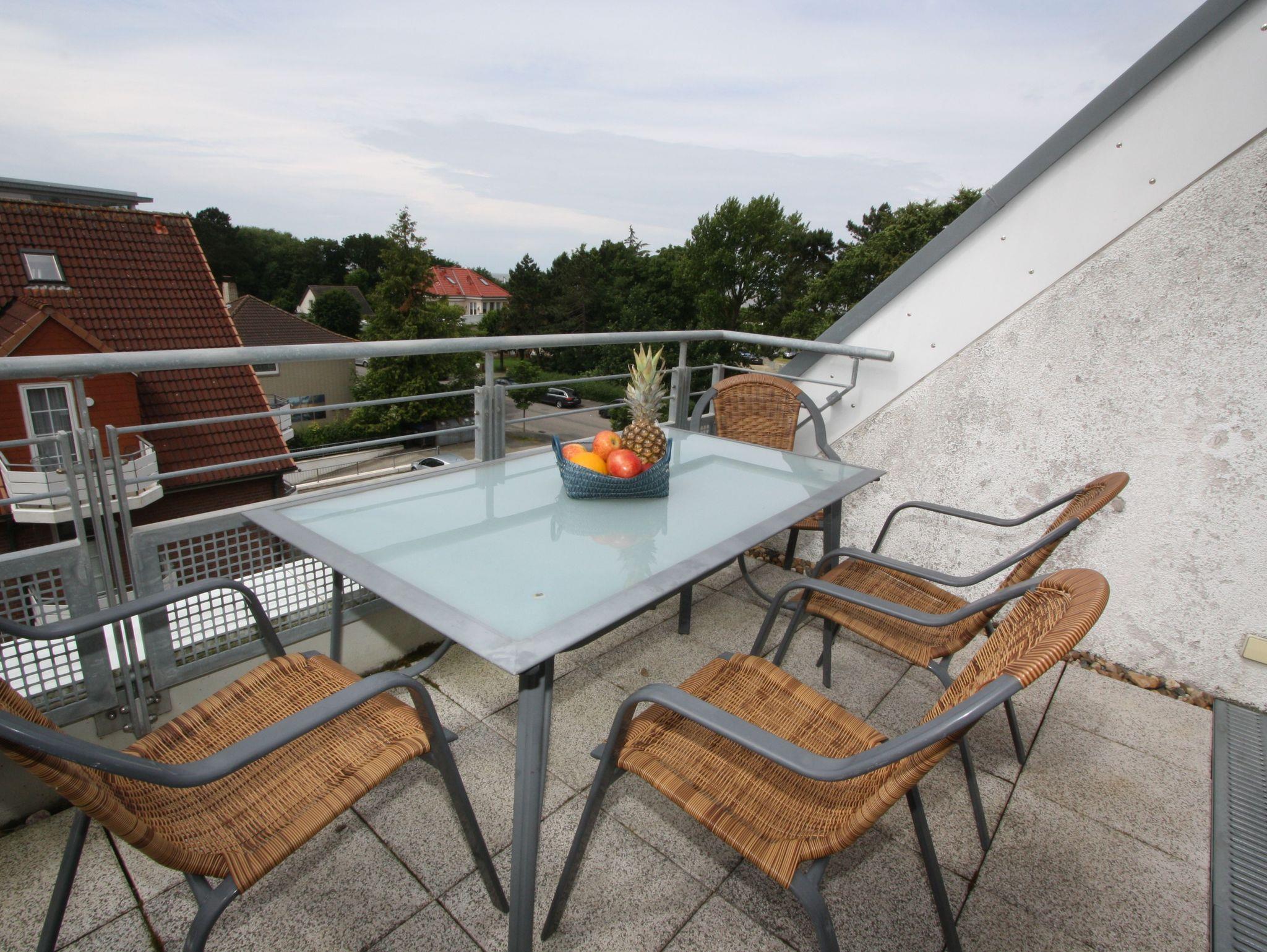 Sie wohnen in einem 2-Zimmer-Maisonette-Appartement für bis zu 4 Personen auf 62 m² Wohnfläche. Im 3. Obergeschoss großer heller Wohn-/Schlafraum mit bequemer Doppelbettcouch, SAT-TV (Flachbildschirm). separater Essplatz, voll ausgestatteter Küchenbereich mit Geschirrspüler und Mikrowelle, große möblierte Dachterrasse, separates Gäste-WC und Abstellraum. Im offenen Galeriegeschoss ein Schlafzimmer mit Doppelbett und Zweitfernseher (Flachbildschirm), Tageslichtbad mit großer Dusche.