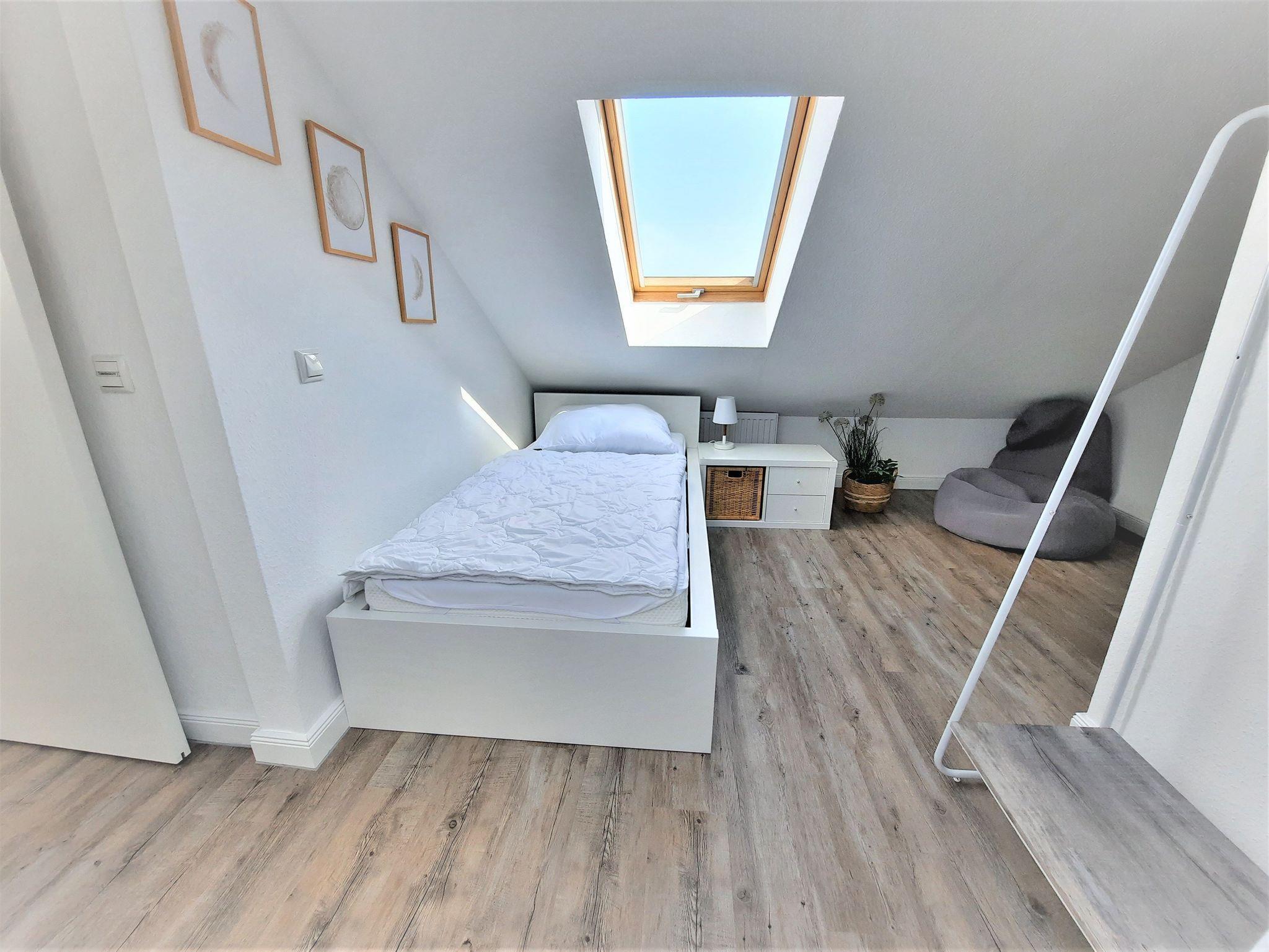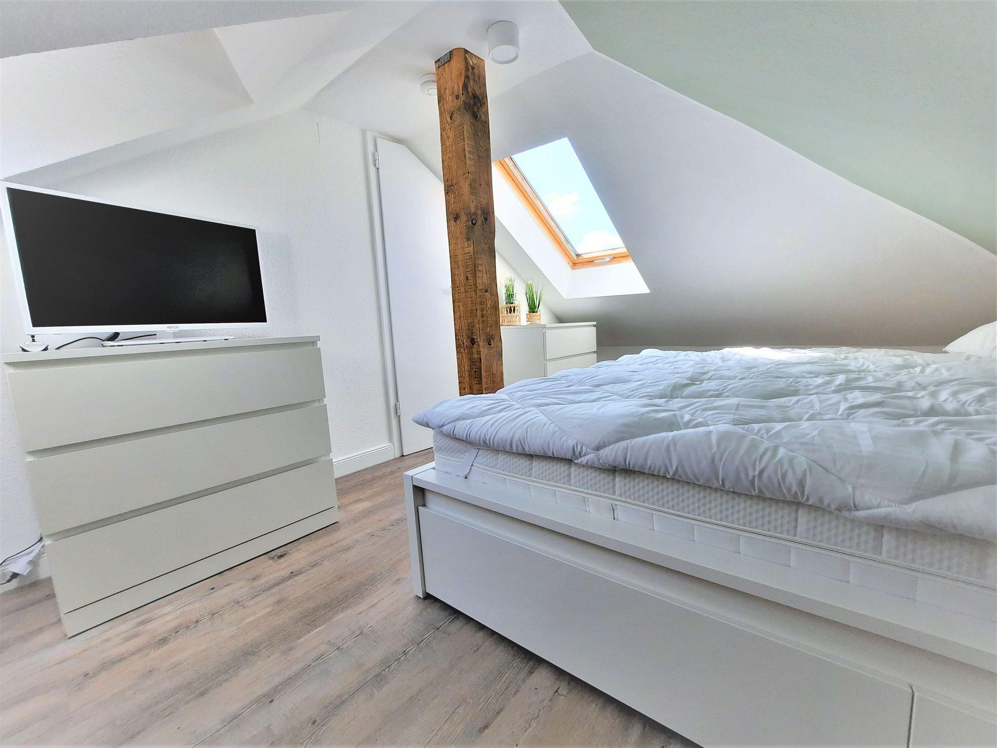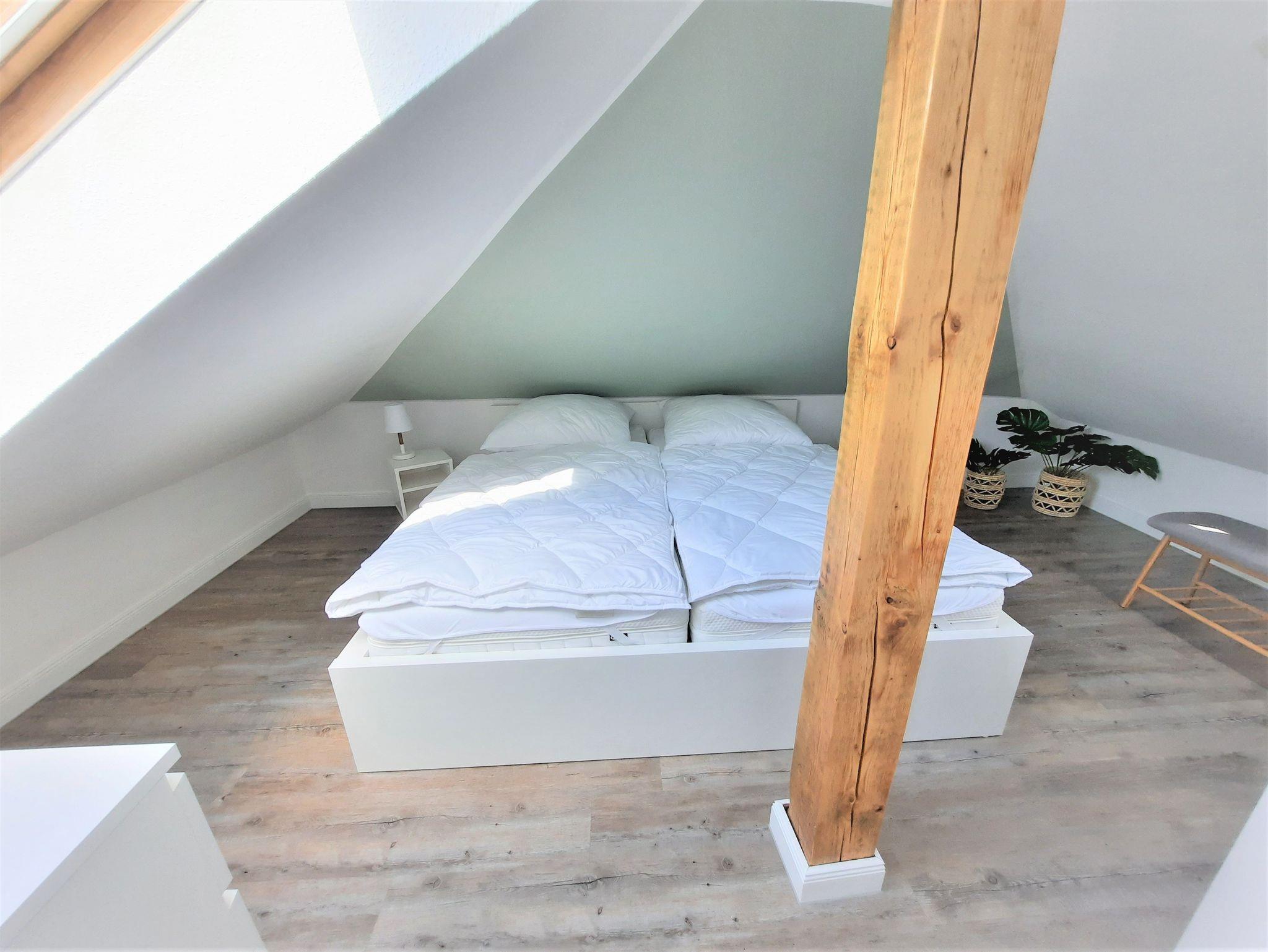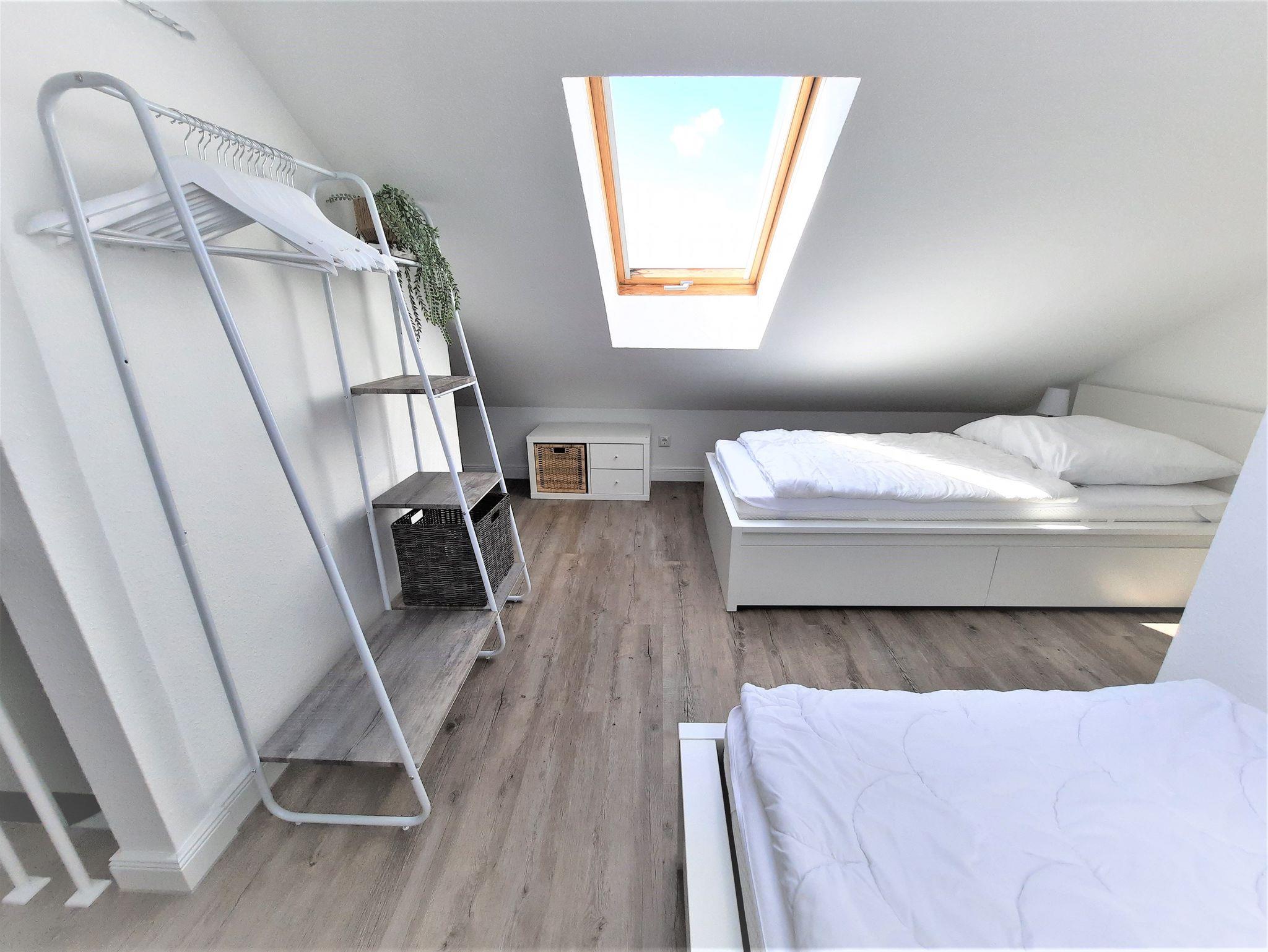 Sie wohnen in einem modernen 2,5-Zimmer-Appartement für bis zu 4 Personen auf 40 m² Wohnfläche im 2. OG. Ein Schlafzimmer mit Doppelbett, ein Schlafzimmer mit zwei Einzelbetten (2. Schlafzimmer ist ein Durchgangszimmer zum Elternschlafzimmer und offen zum Wohnzimmer - aber mit Kindersicherung vor dem Treppenabgang), beide Schlafräume befinden sich im Dachbereich, haben eine geringe Deckenhöhe und sind über eine halb gewendelte Treppe vom Wohnraum aus zu erreichen, ein zusätzliches WC ist im Dachbereich vorhanden. Wohnraum, separater Essplatz und voll ausgestatteter Küchenbereich mit Geschirrspüler und Mikrowelle, Dusche/WC, Balkon, TV, Stereoanlage und WLAN. Ein Kinderreisebett und ein Kinderhochstuhl wird kostenfrei gestellt.