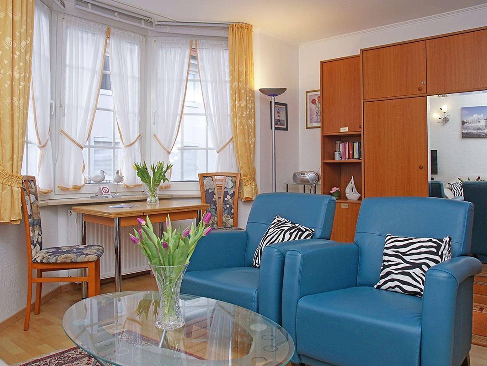 Die Ferienwohnung (Hochparterre) mit einer Größe von ca. 32 m² Wohnfläche ist komplett bis zu 2 Personen ausgestattet. 1 Wohnzimmer mit Essplatz, Erker, 1 Flachbildfernseher mit Soundsystem, Sofa und Sessel, Küche mit Mikrowelle, Mini Backofen, Kühlschrank, Cerankochfeld, Kaffeemaschine, Wasserkocher und Toaster, Schlafzimmer mit Doppelbett (160x200cm), Teilblick vom Schlafzimmer auf die Nordsee und Kleiderschrank, Flur, Bad mit Dusche und WC, Nichtraucherwohnung, keine Haustiere, PKW-Stellplatz am Haus.