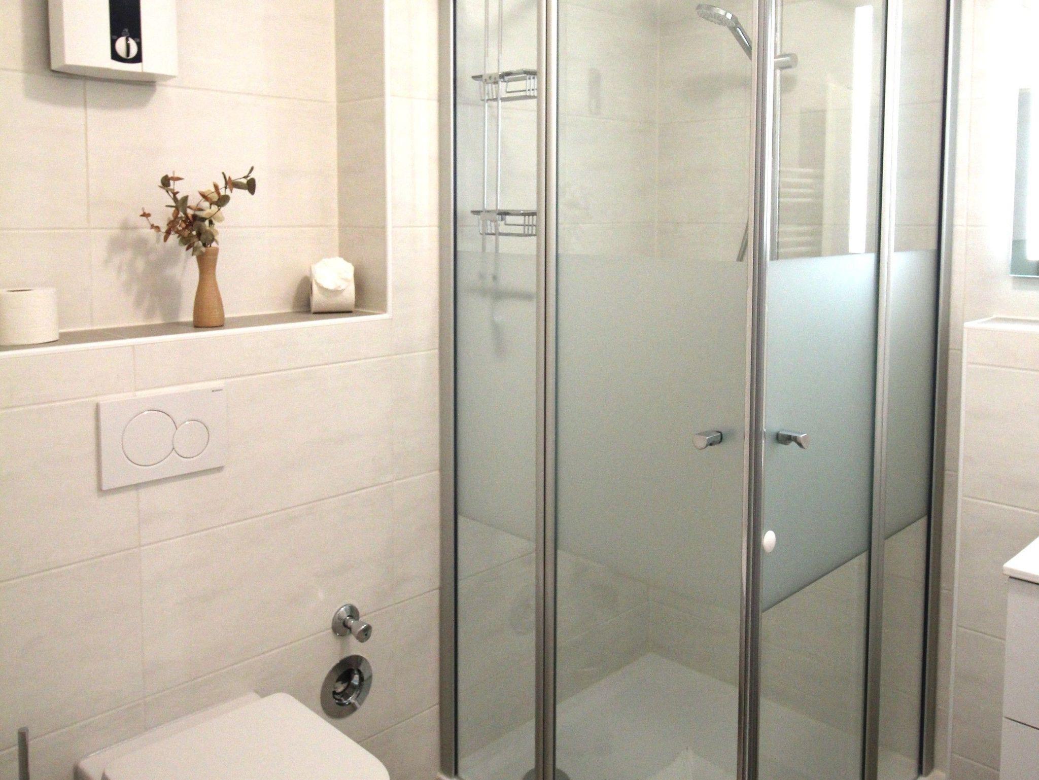 - geräumig mit Dusche (sehr niedrige Duschtasse), WC, Föhn, Badhocker