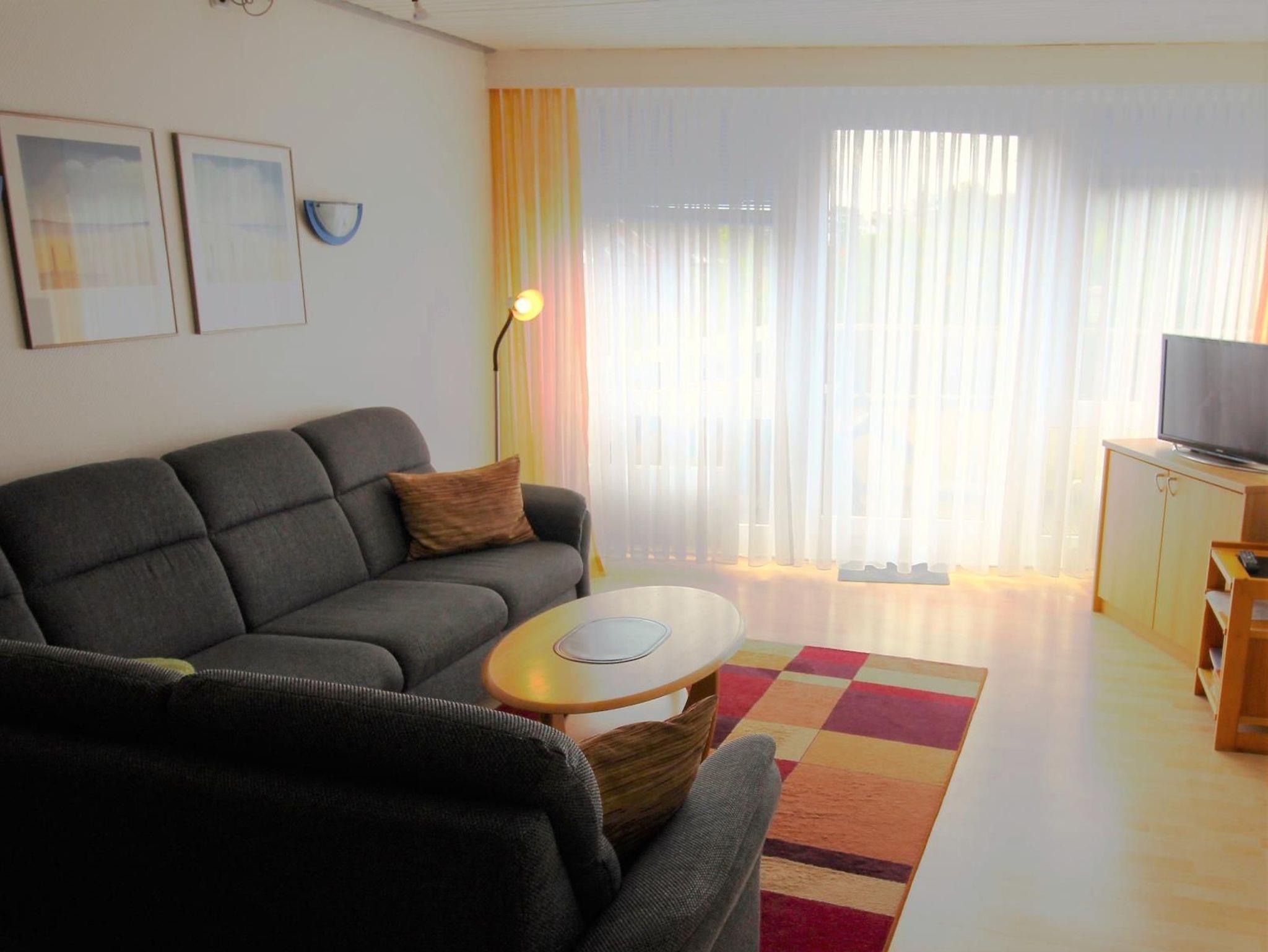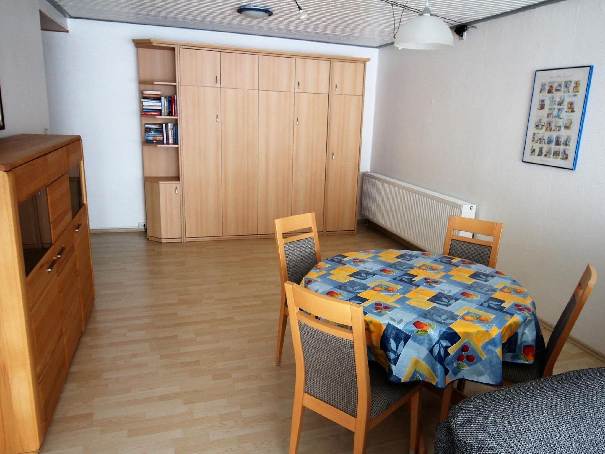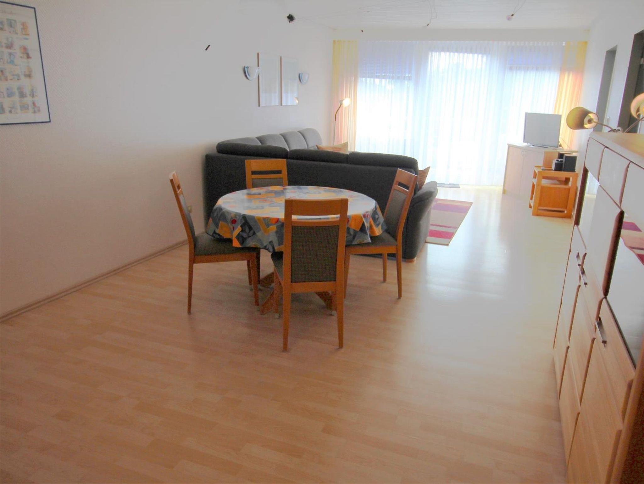 Sie wohnen in einer 2-Zimmer-Ferienwohnung mit Wohnraum und offener, voll ausgestatteter Kuche und einem Schrankbett fur bis zu 2 Personen, einem Schlafzimmer mit Doppelbett, Badezimmer und Balkon.