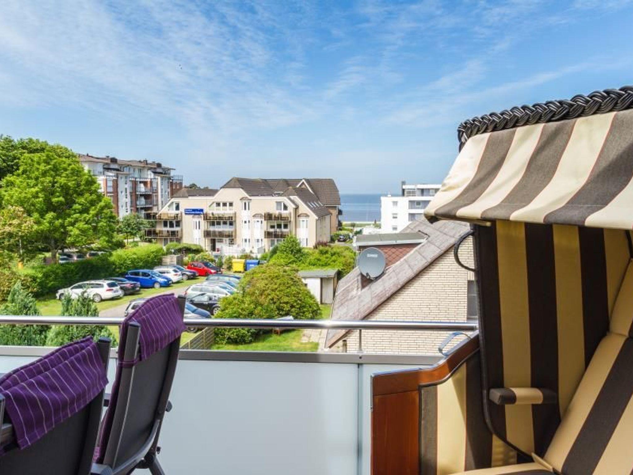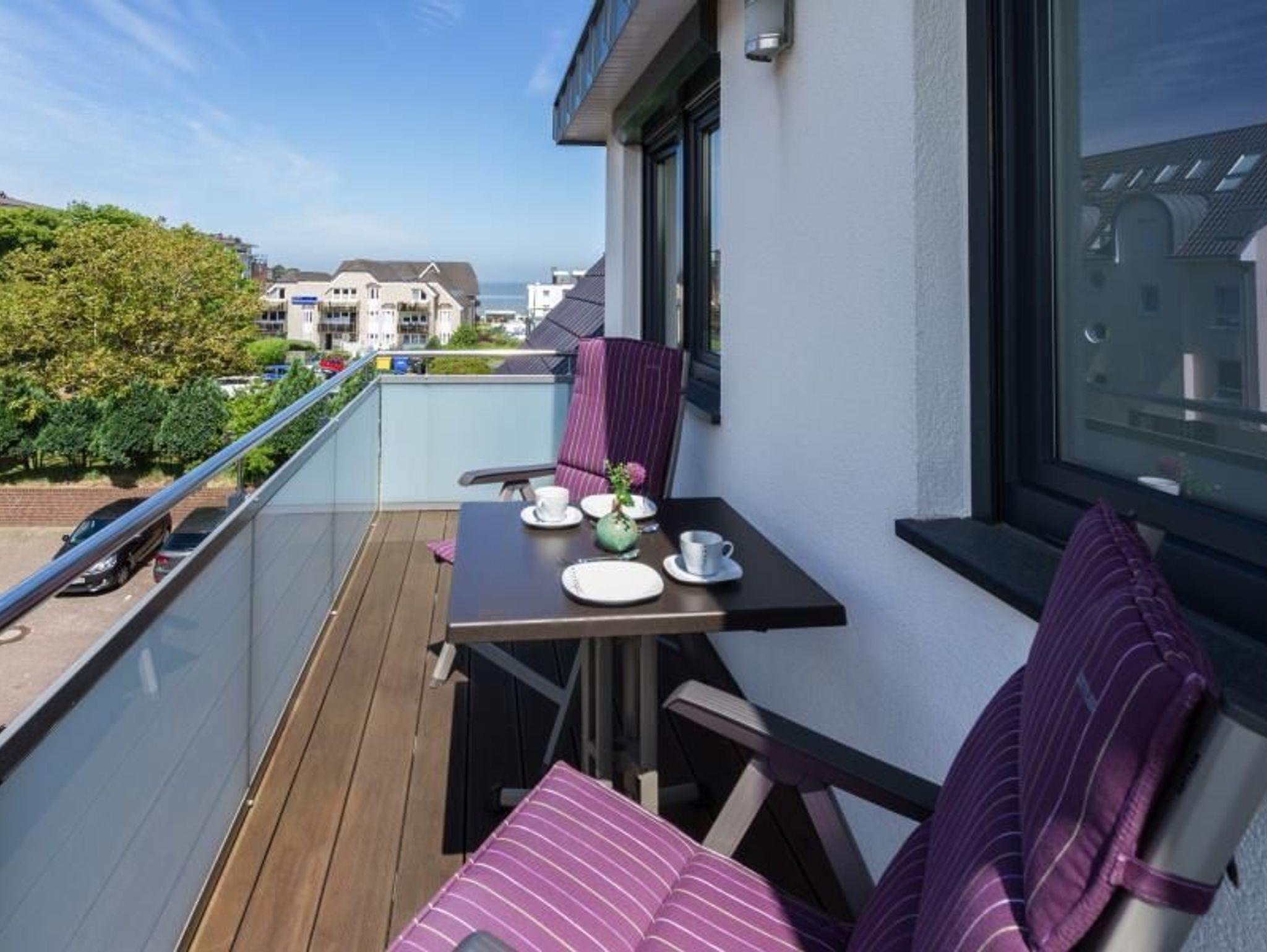 Von Ihrem Wohnzimmer aus gelangen Sie direkt zu den beiden möblierten Balkonen, die nach Westen und Nordwesten ausgerichtet sind. Auf einem der Balkone erwartet Sie ein komfortabler Strandkorb, von dem aus Sie den Blick auf das Meer genießen können. Das Badezimmer mit Fenster und WC beeindruckt mit einer großzügigen bodentiefen Dusche, einem Handtuchwärmer, einem Bidet und zwei Waschbecken. Ein separates Gäste-WC mit Waschtisch ergänzt die sanitären Annehmlichkeiten.