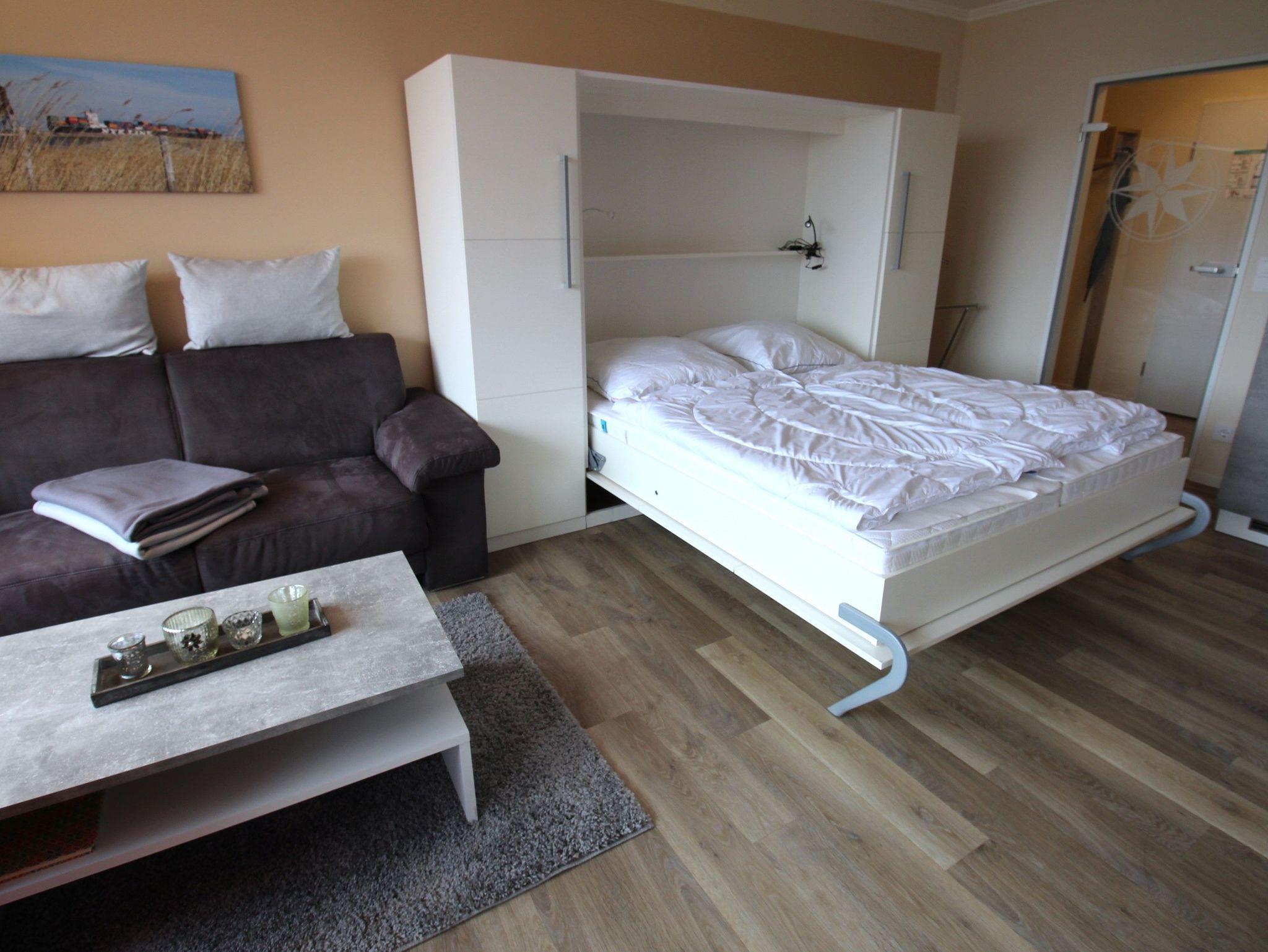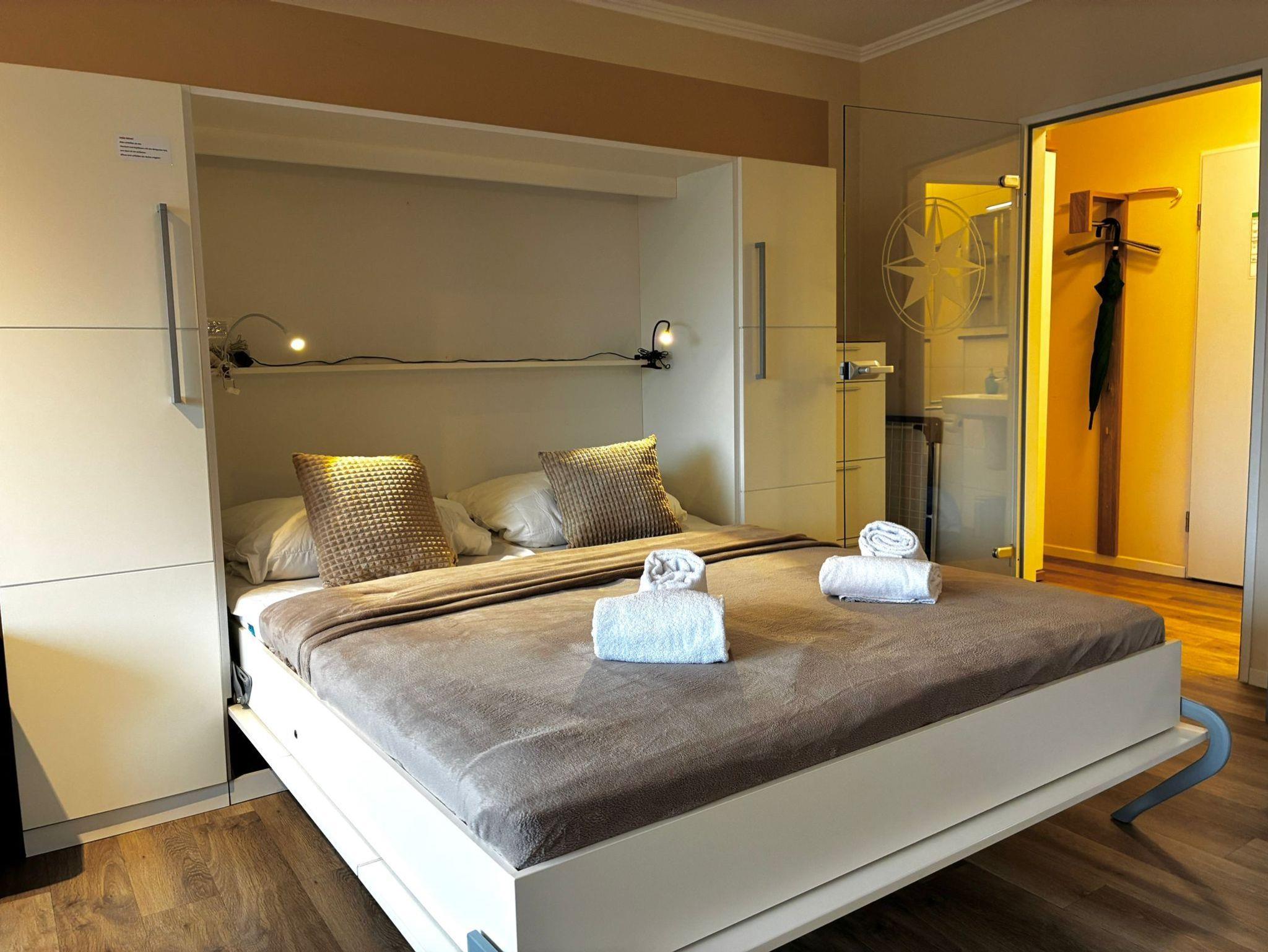 Des Weiteren ist ein Nehl-Schrankbett (160 cm x 205 cm) vorhanden. Auch ein Bügeleisen und Bügelbrett finden Sie vor.