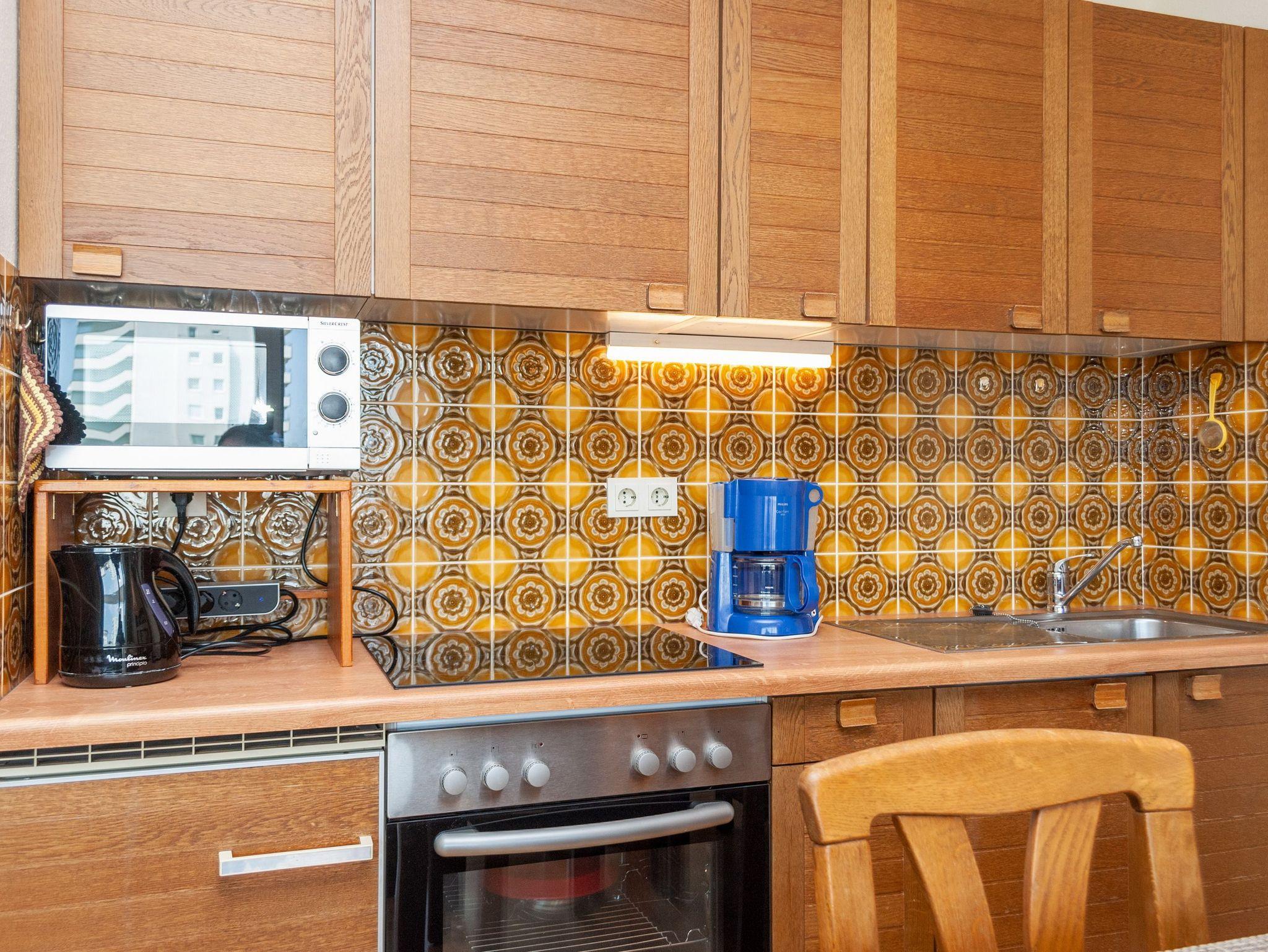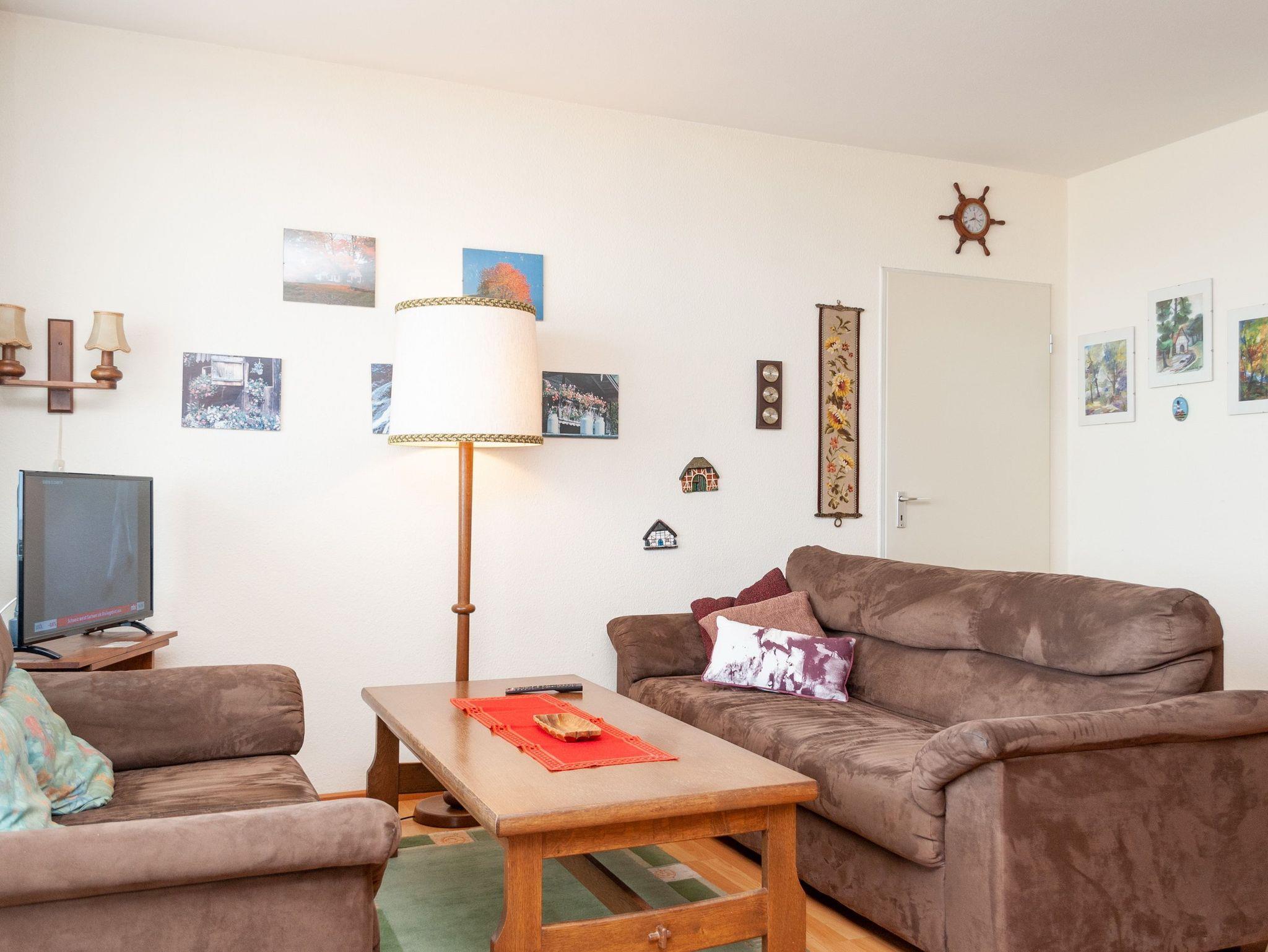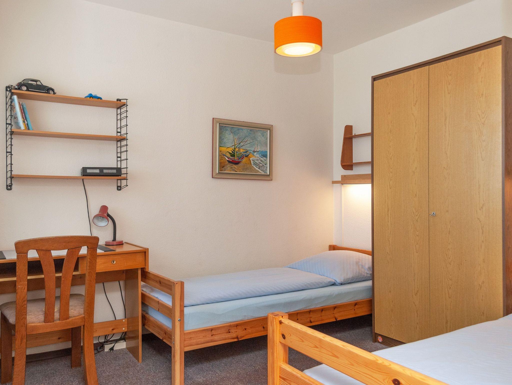 Das Apartment besteht aus einem Schlafzimmer mit 2 Einzelbetten, einem Wohnbereich mit zusätzlichem Schrankbett für 1 Person, einem Etagenbett für 1 Peson in einer Nische im Flur und einem Badezimmer mit Dusche sowie WC. Die Ferienwohnung beinhaltet eine gut ausgestattete offene Küche.