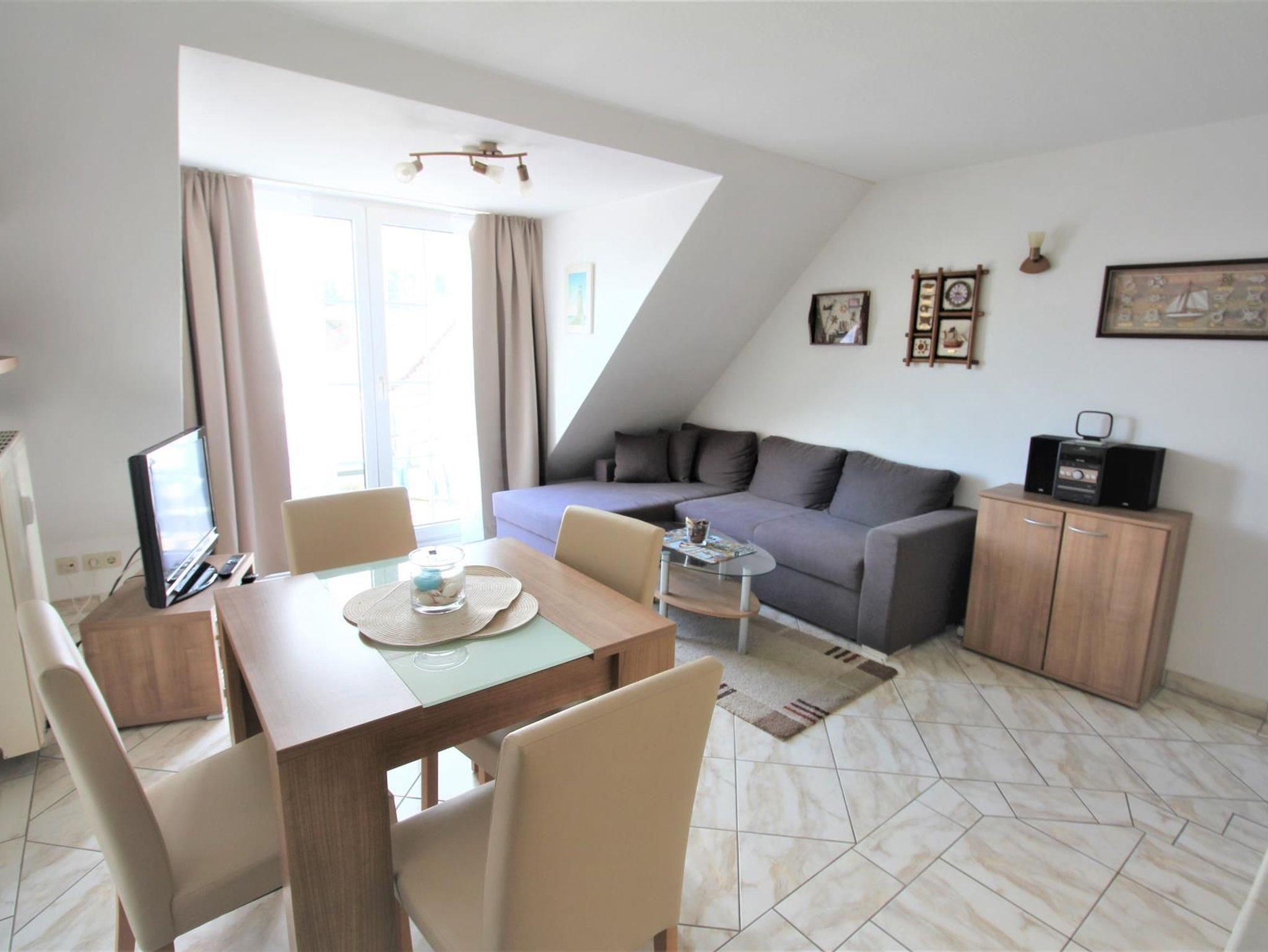 2-Zimmer-Appartement für bis zu 4 Personen auf ca. 40-45 m². Schlafzimmer mit Balkon und Doppelbett, Wohn-Schlafraum mit Balkon und bequemer Doppelbettcouch, TV, separatem Essplatz im Erker und voll ausgestattetem Küchenbereich. Bad mit Dusche/WC. WLAN und PKW-Stellplatz vorhanden.