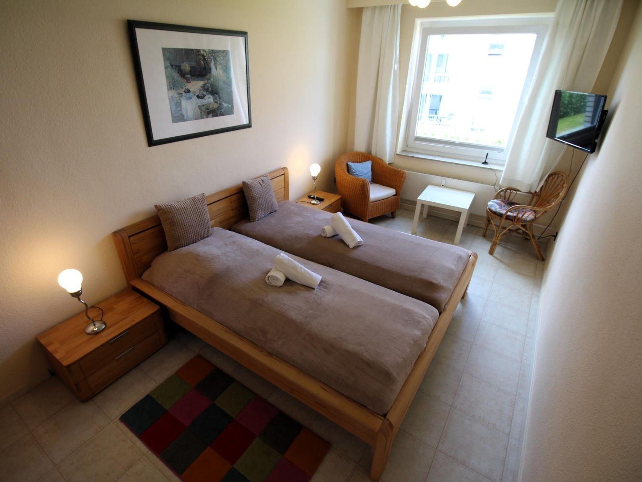 Die beiden Schlafzimmer sind über einen kleinen Flur erreichbar, das größere mit Doppelbett (180 cm x 200 cm), großem Kleiderschrank und internetfähigem Fernseher, das kleinere mit zwei Einzelbetten (90 cm x 200 cm), Schreibtisch und Kleiderschrank.
