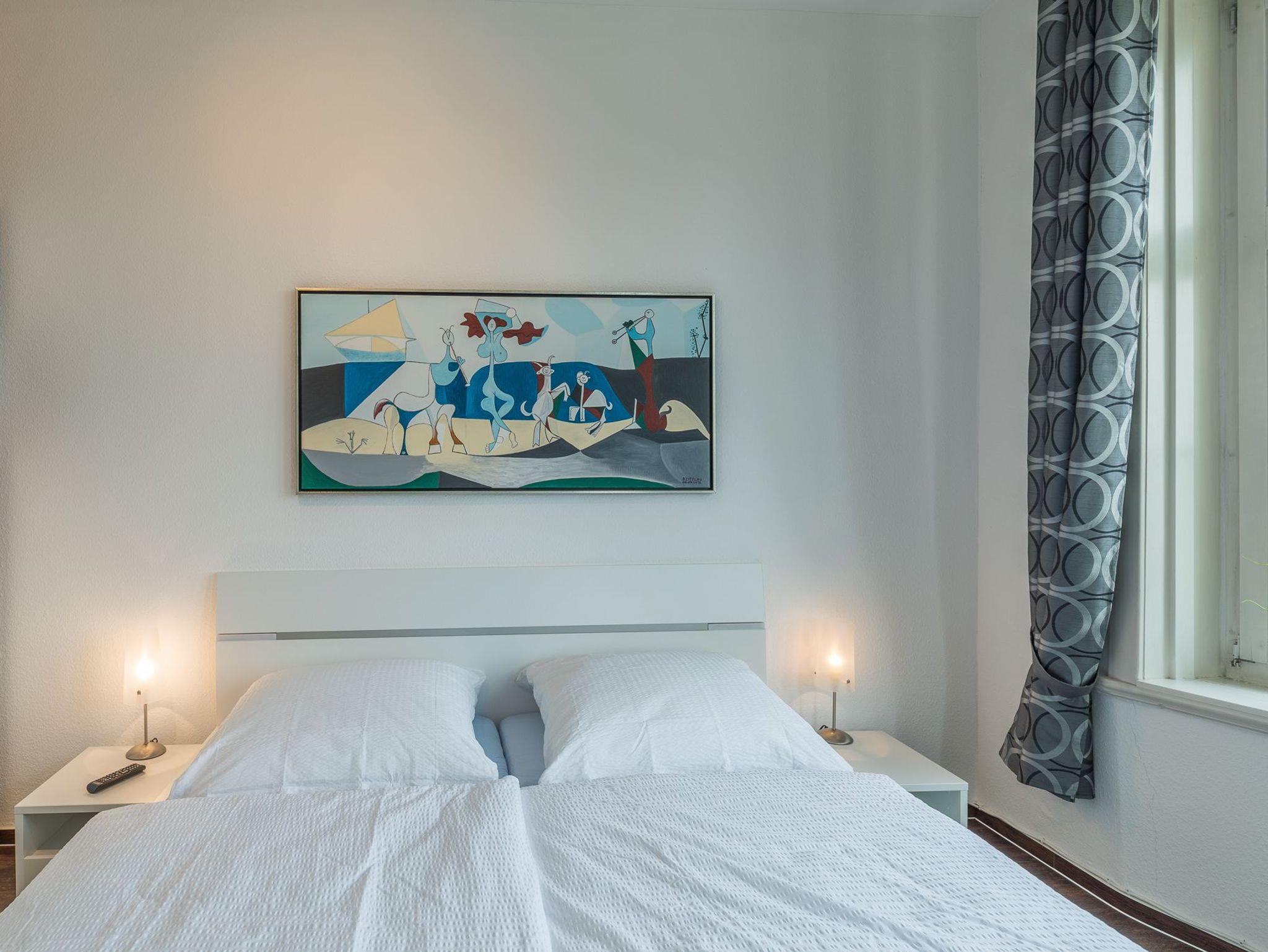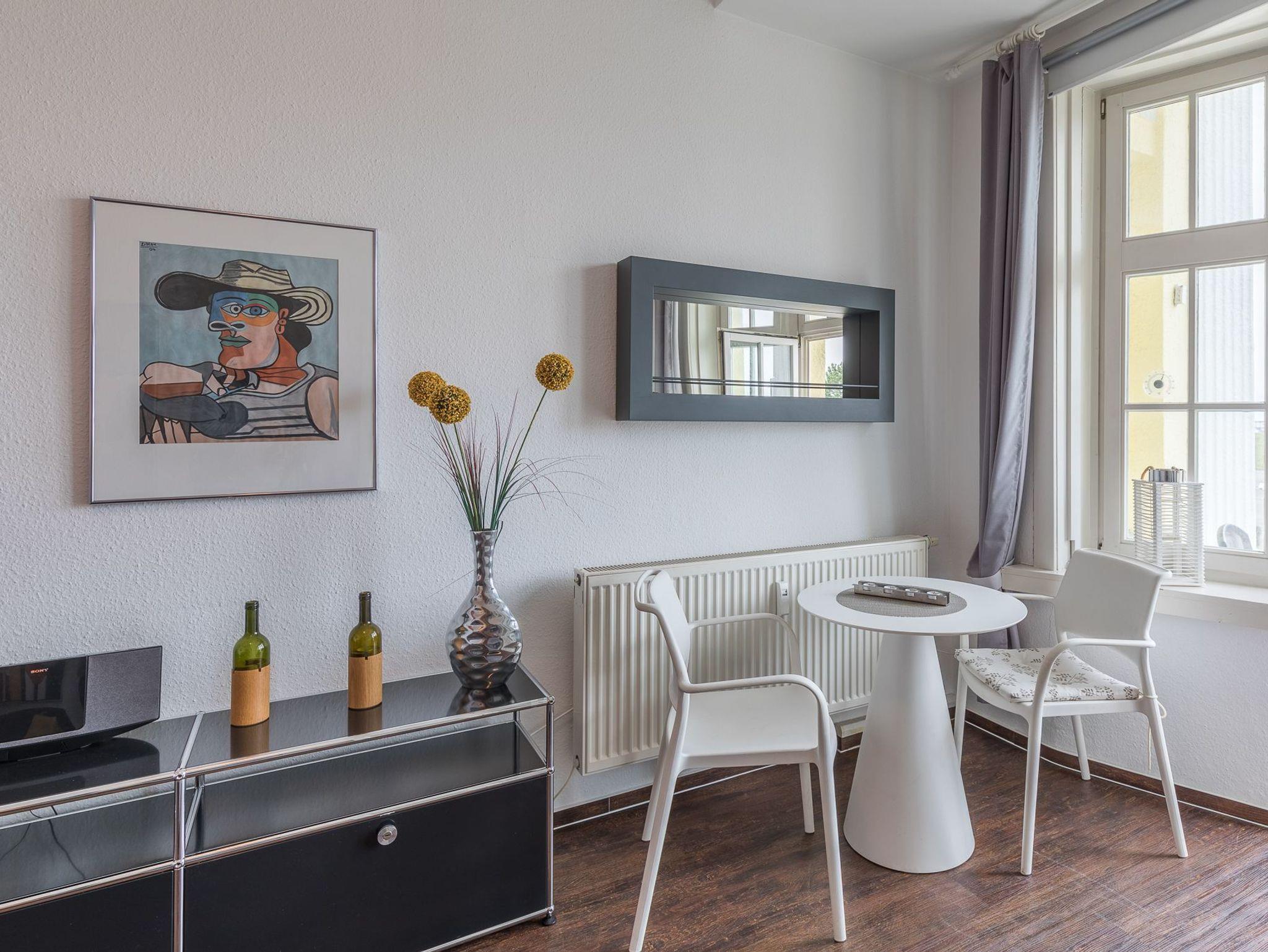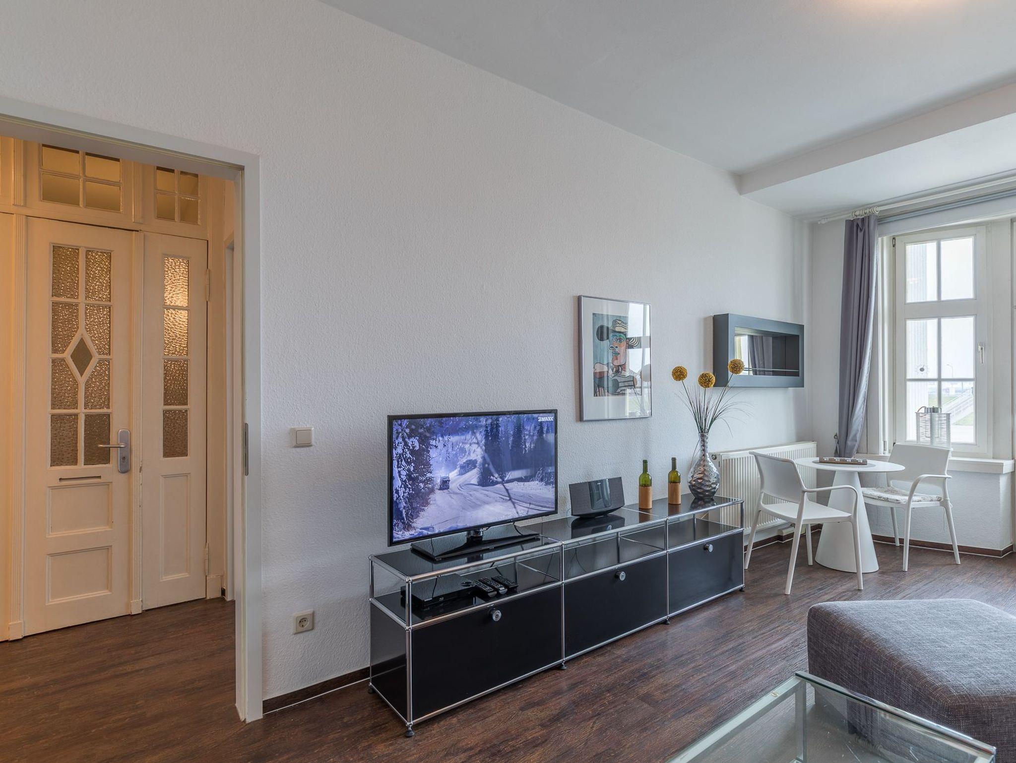 Die modern eingerichtete 3-Raum Wohnung (mit Teilseesicht und kleinem Balkon) mit einer Größe von ca. 80 m² Wohnfläche ist komplett bis zu 4 Personen ausgestattet. 1 Wohnzimmer[nbsp][nbsp]mit Essplatz, gemütlichem Sofa, TV, Stereoanlage und Zugang zum kleinen Balkon zur Seeseite, 1 Schlafzimmer mit Doppelbett und TV, 1 Schlafzimmer mit 2 Einzelbetten, separate große Küche (Cerankochfeld, Backofen, Mikrowelle, Kaffeemaschine und Wasserkocher) mit Essplatz, 1 Bad mit Badewanne und WC, Nichtraucherwohnung, keine Haustiere, PKW-Stellplatz direkt am Haus.