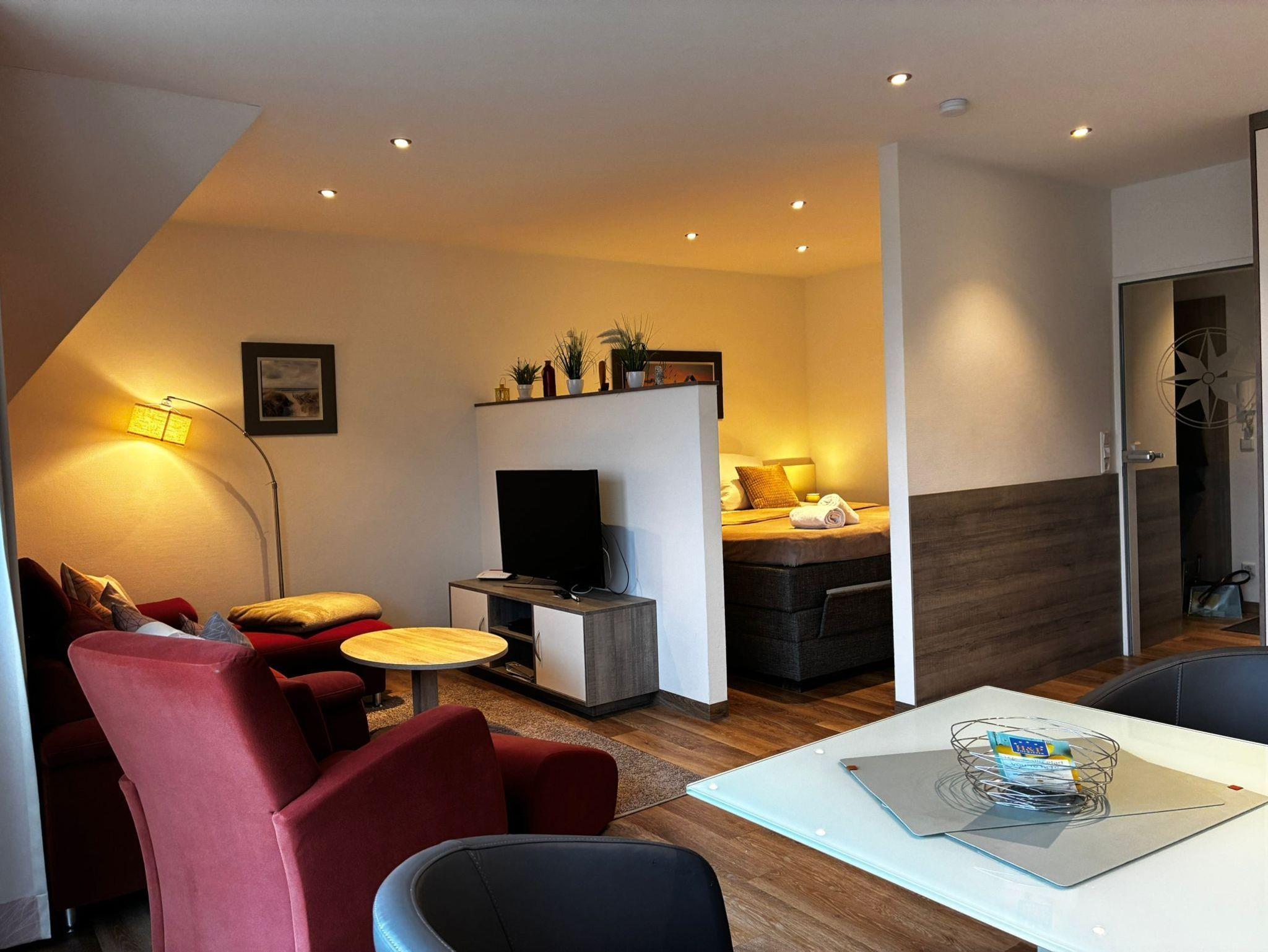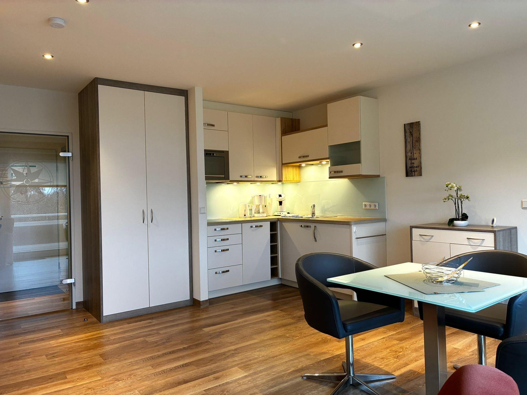1-Zimmer-Appartement für bis zu 2 Personen, ca. 47 m². Wohn-/Schlafraum mit Schlafnische / Raumteiler und Doppelbett, separater Essplatz und voll ausgestatteter Küchenbereich mit Geschirrspüler und Mikrowelle, Dusche / WC, Balkon, Kabel-LED-TV. Blu-ray-Player, PKW-Stellplatz in der Tiefgarage, WLAN-Nutzung, Benutzung des Schwimmbades und der Saunen.
