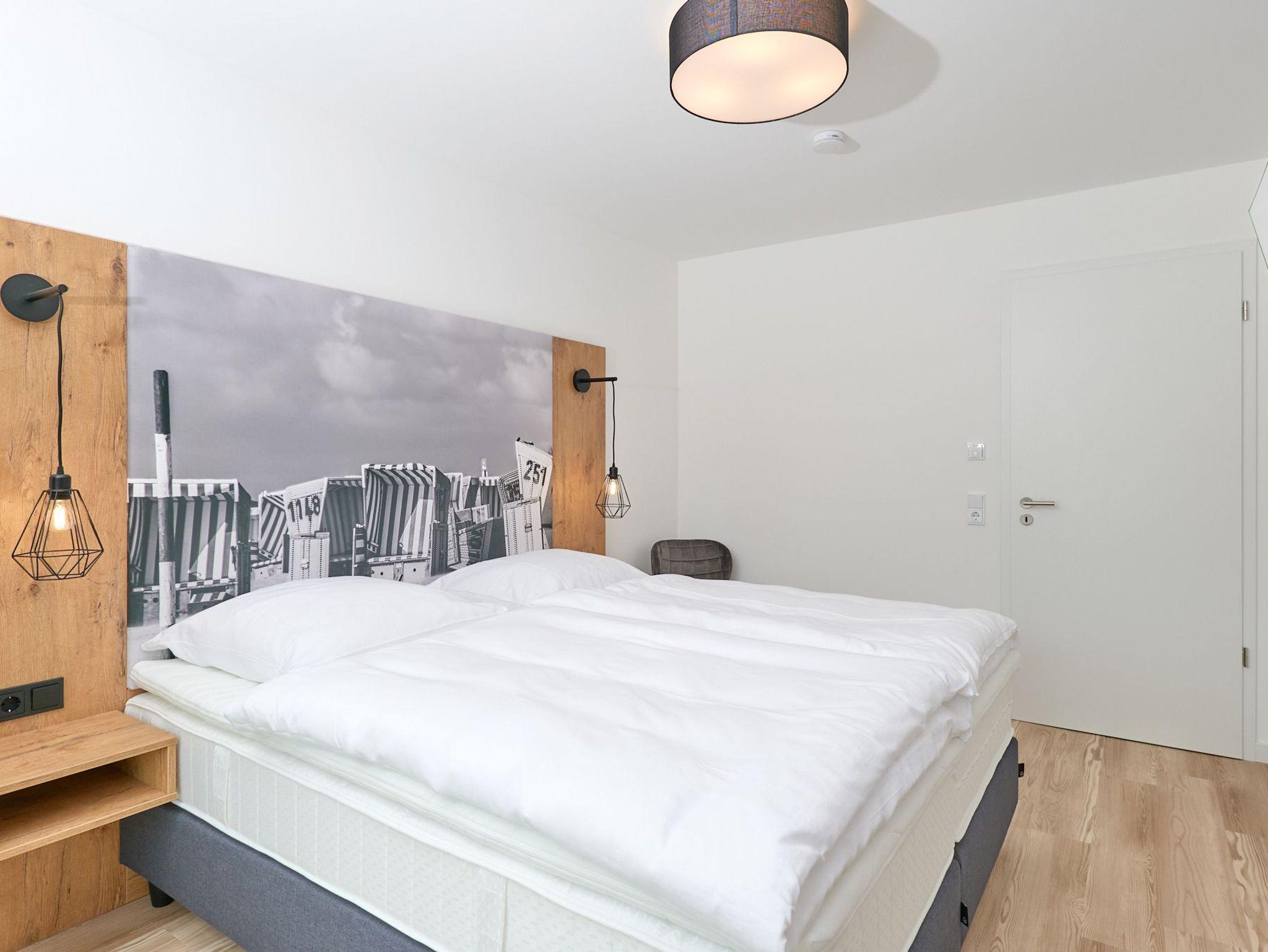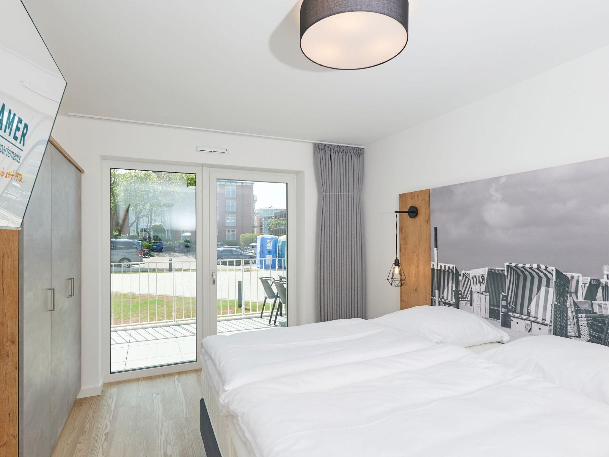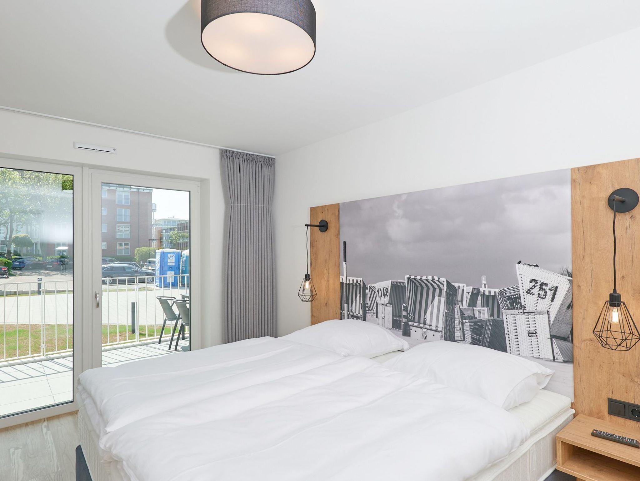 Neubau Mai 2023! Sehr schöne, moderne 3-Raum-Wohnung bis 4 Pers. voll ausgestattet auf ca. 99 m² in der 1.Etage gelegen, 2 Schlafzimmer mit komfortablen Doppelbetten (Bettwäsche inkl.) und Außenjalousien an allen Fenstern, ebenerdige Dusche/WC, Wohnzimmer mit großer Küchenzeile (Backofen, Geschirrspüler, Mikrowelle) 3x Kabel-TV, Radio, kostenfreies W-LAN-Internet, großer Balkon (west) mit Teilseesicht, Personenaufzug, reservierter Pkw-Stellplatz in der Tiefgarage inkl., es sind keine Haustiere erlaubt und natürlich Nichtraucher. Durchfahrtshöhe Tiefgarage: 2,05m.