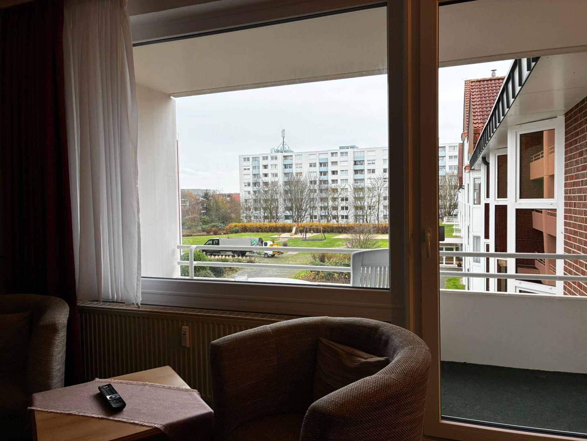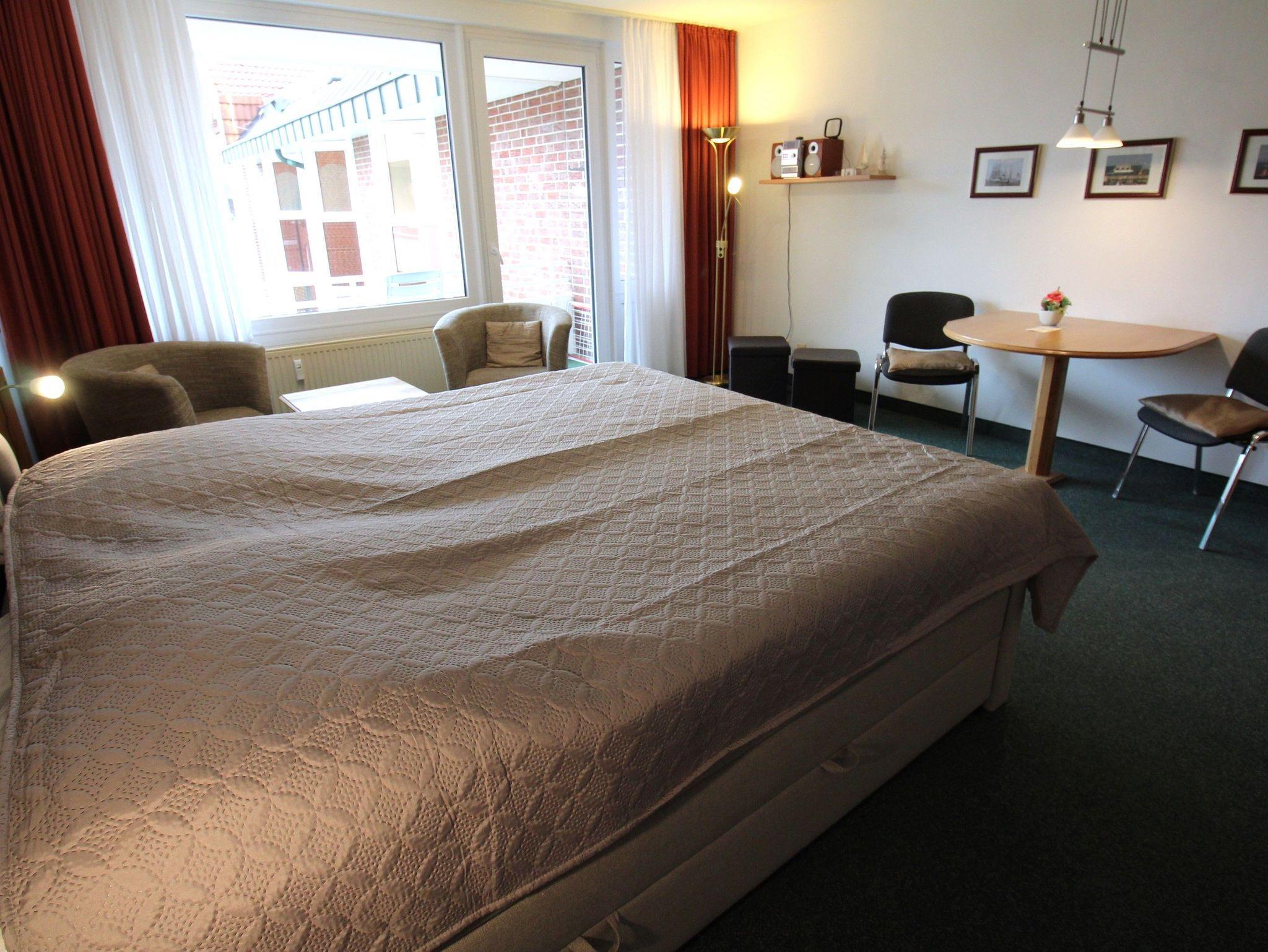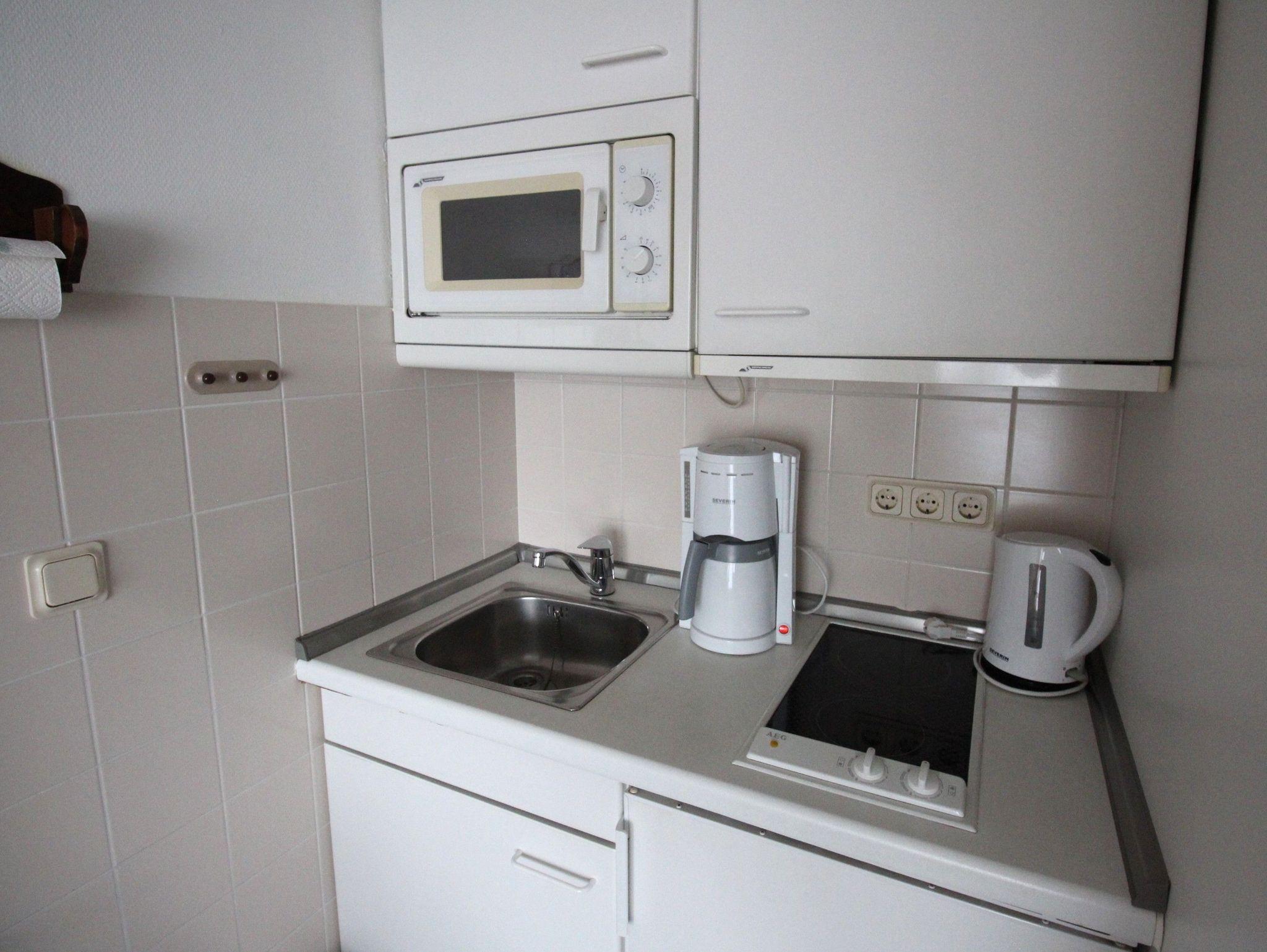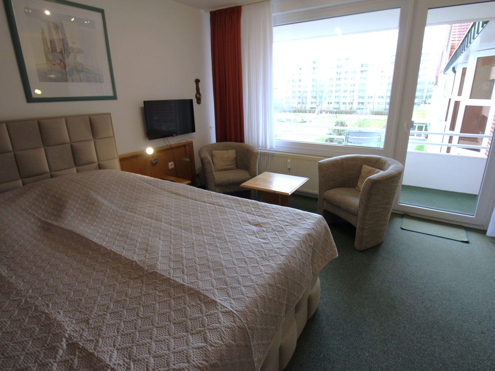 Sie wohnen in einem 1-Zimmer-Appartement für bis zu 2 Personen im 2. OG auf ca.34 m² Wohnfläche. Ein Wohn-/Schlafraum mit Doppelbett (210 cm), separater Essplatz und voll ausgestattete Pantryküche: 2-Platten-Ceranfeld, Mikrowelle, Dusche/WC, Kabel-TV, Hifi-CD-Stereoanlage, Ostbalkon (Morgensonne), ruhige Innenhofanlage, WLAN kostenlos, großer Garten mit Spielplatz, Strandkörben, Sitzbänken, Kegelbahn,Tiefgarageneinstellplatz.