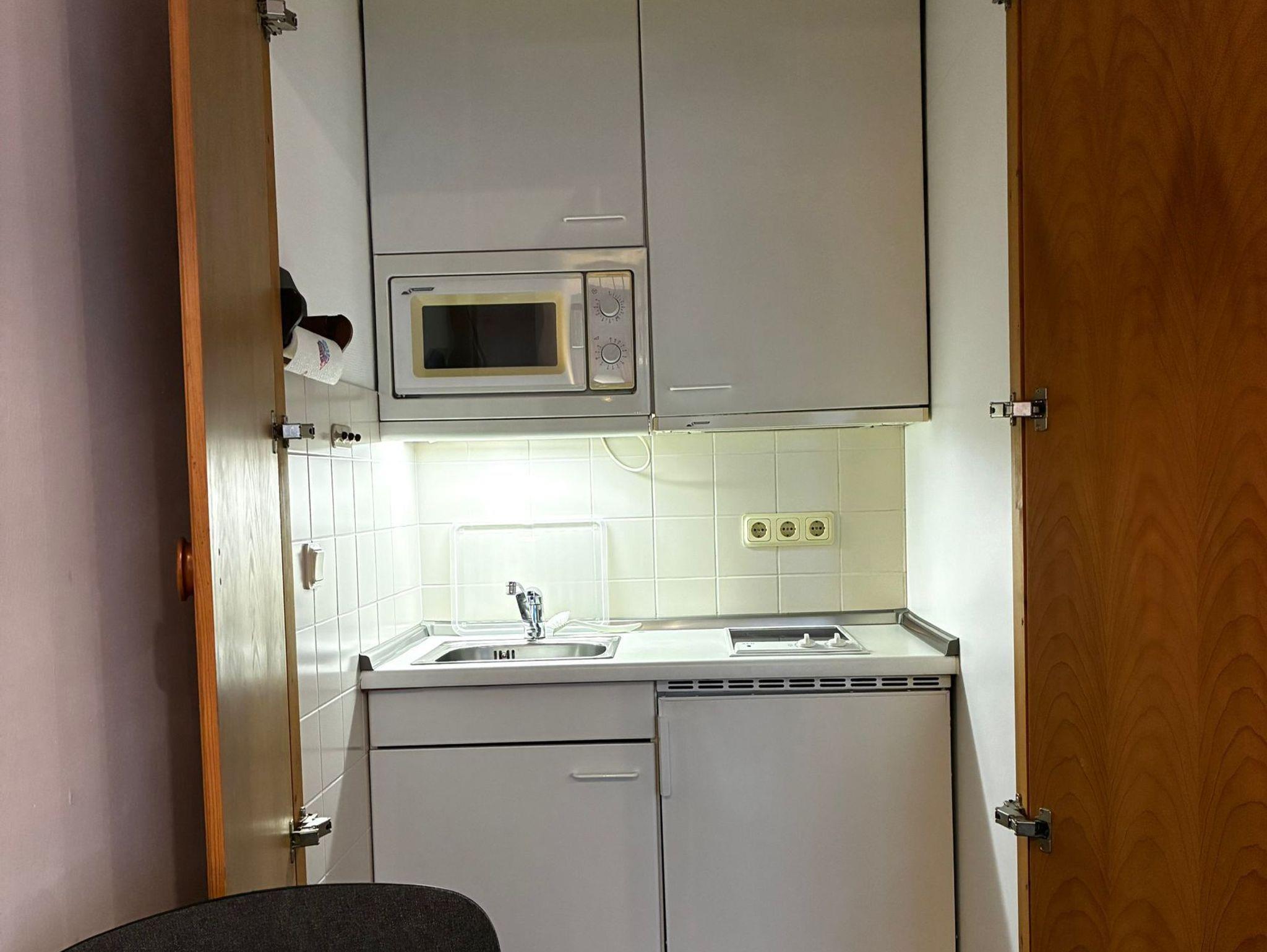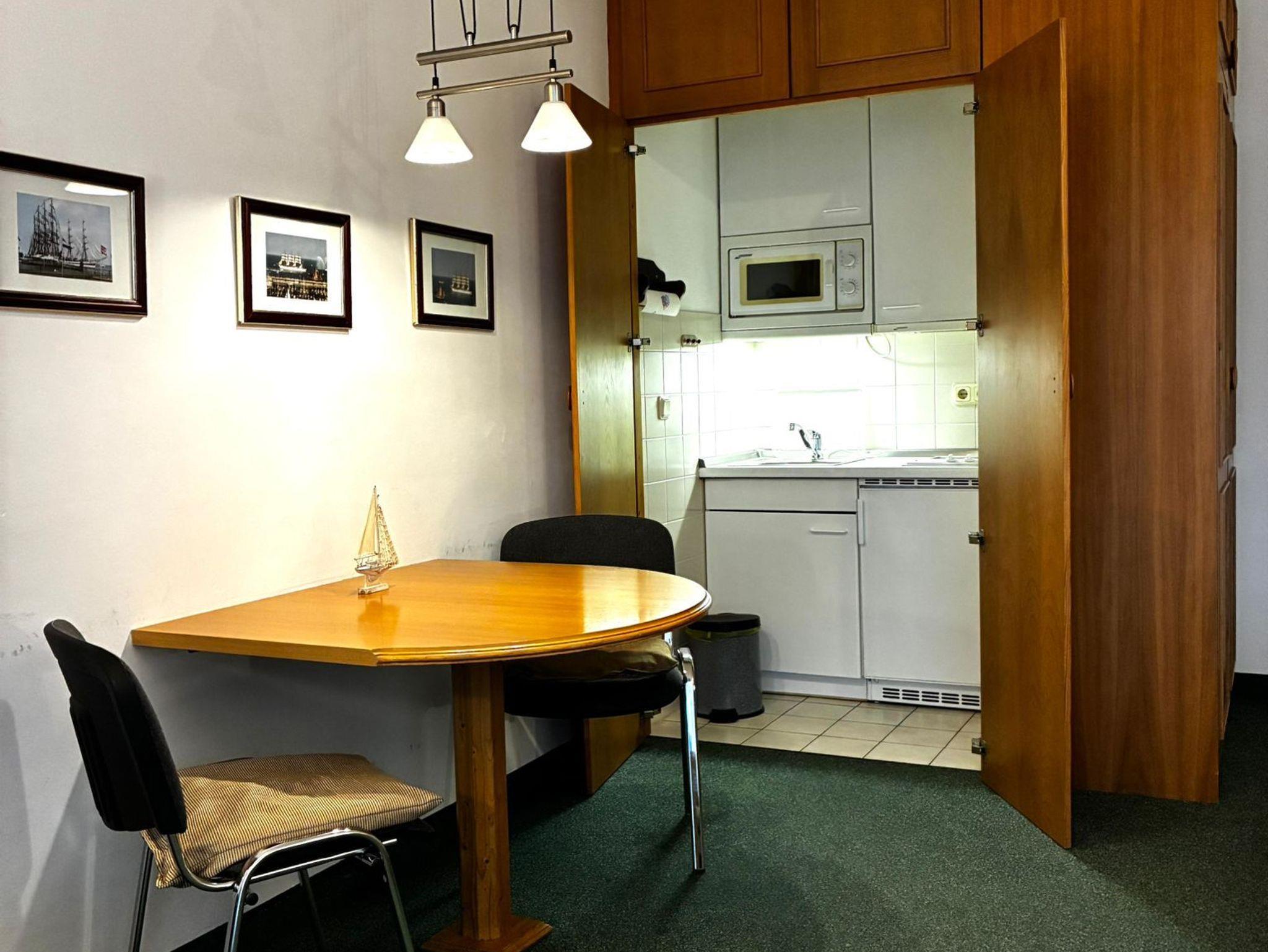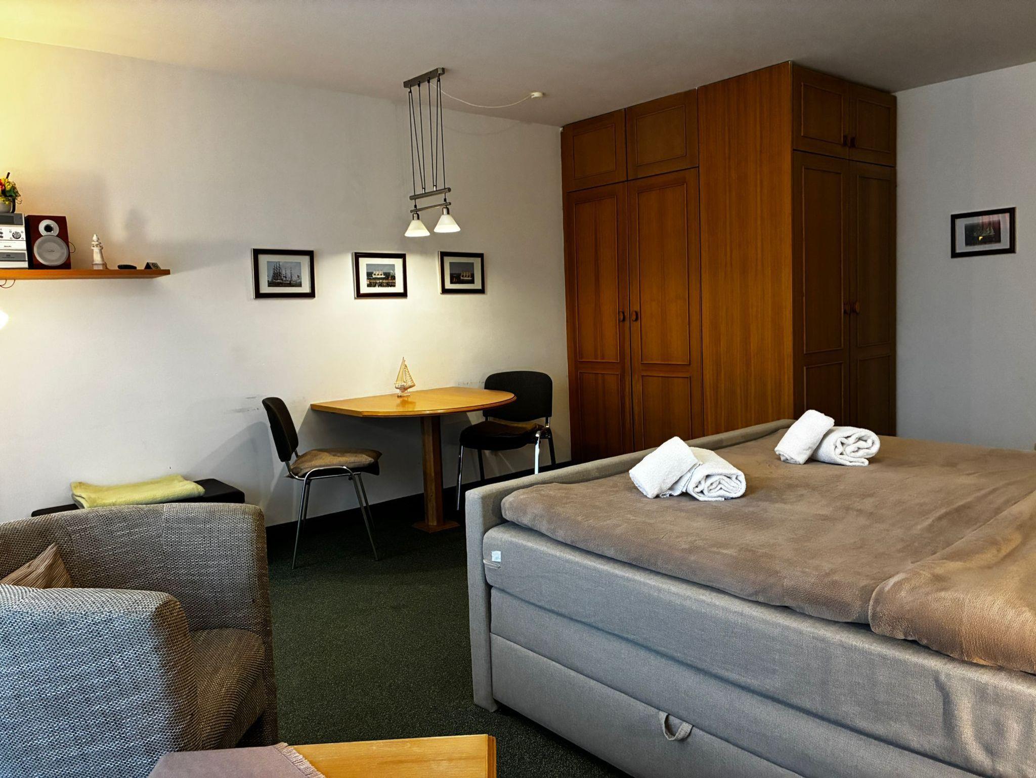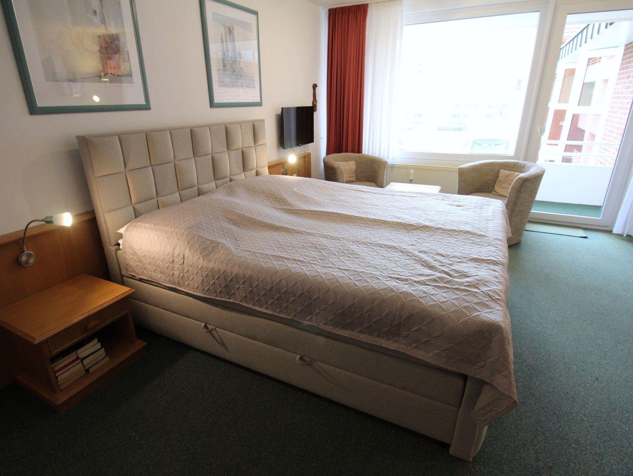 Sie wohnen in einem 1-Zimmer-Appartement für bis zu 2 Personen im 2. OG auf ca.34 m² Wohnfläche. Ein Wohn-/Schlafraum mit Doppelbett (210 cm), separater Essplatz und voll ausgestattete Pantryküche: 2-Platten-Ceranfeld, Mikrowelle, Dusche/WC, Kabel-TV, Hifi-CD-Stereoanlage, Ostbalkon (Morgensonne), ruhige Innenhofanlage, WLAN kostenlos, großer Garten mit Spielplatz, Strandkörben, Sitzbänken, Kegelbahn,Tiefgarageneinstellplatz.