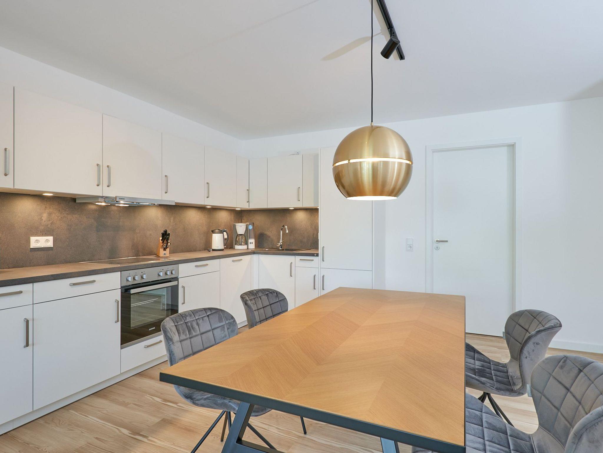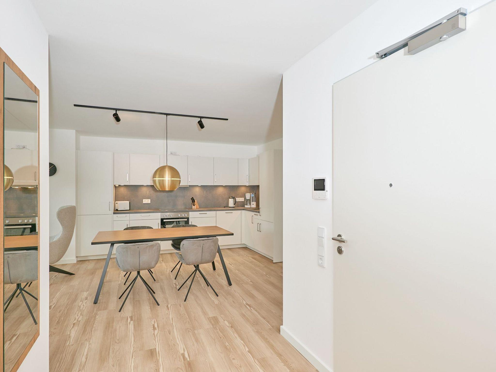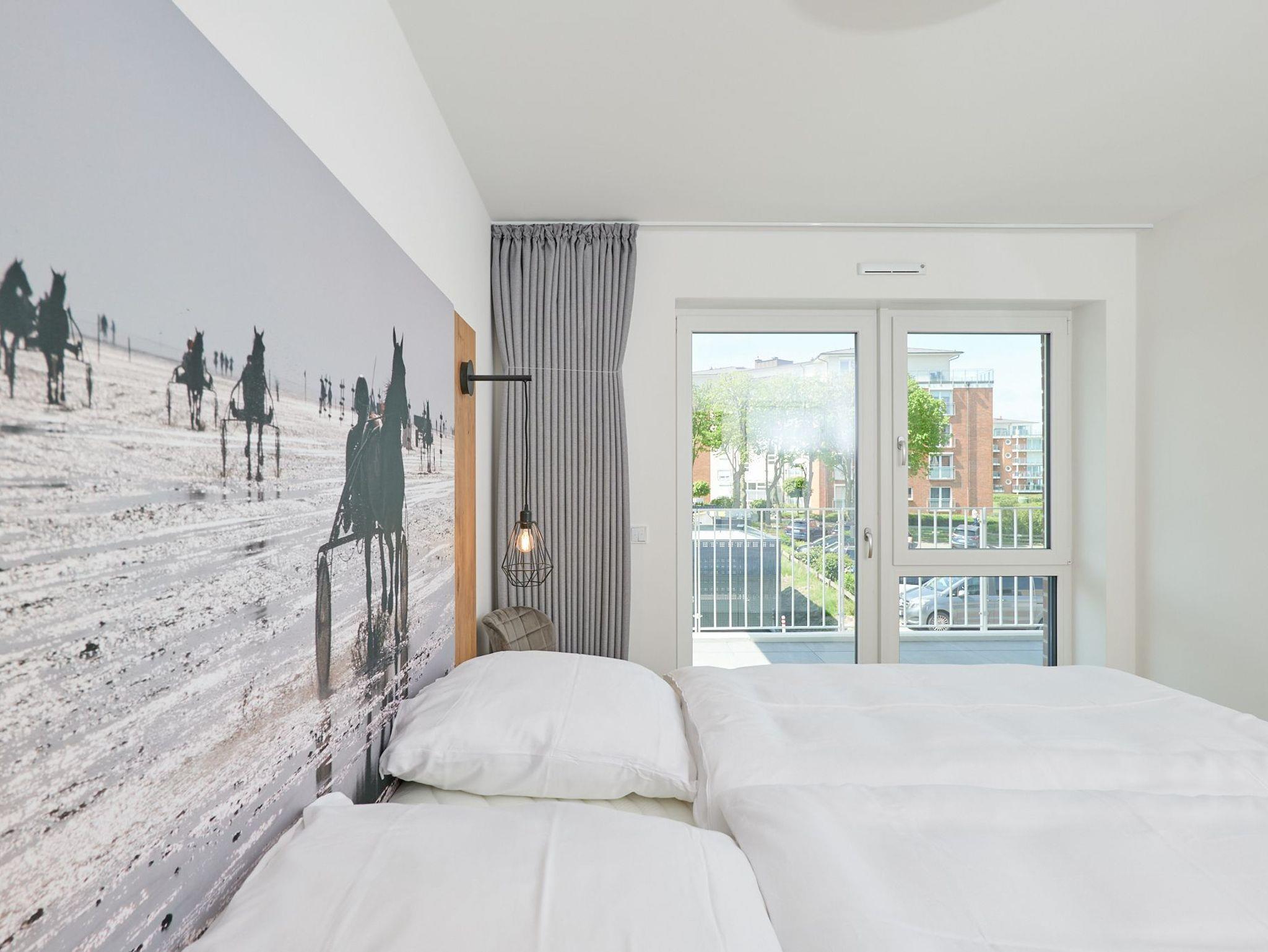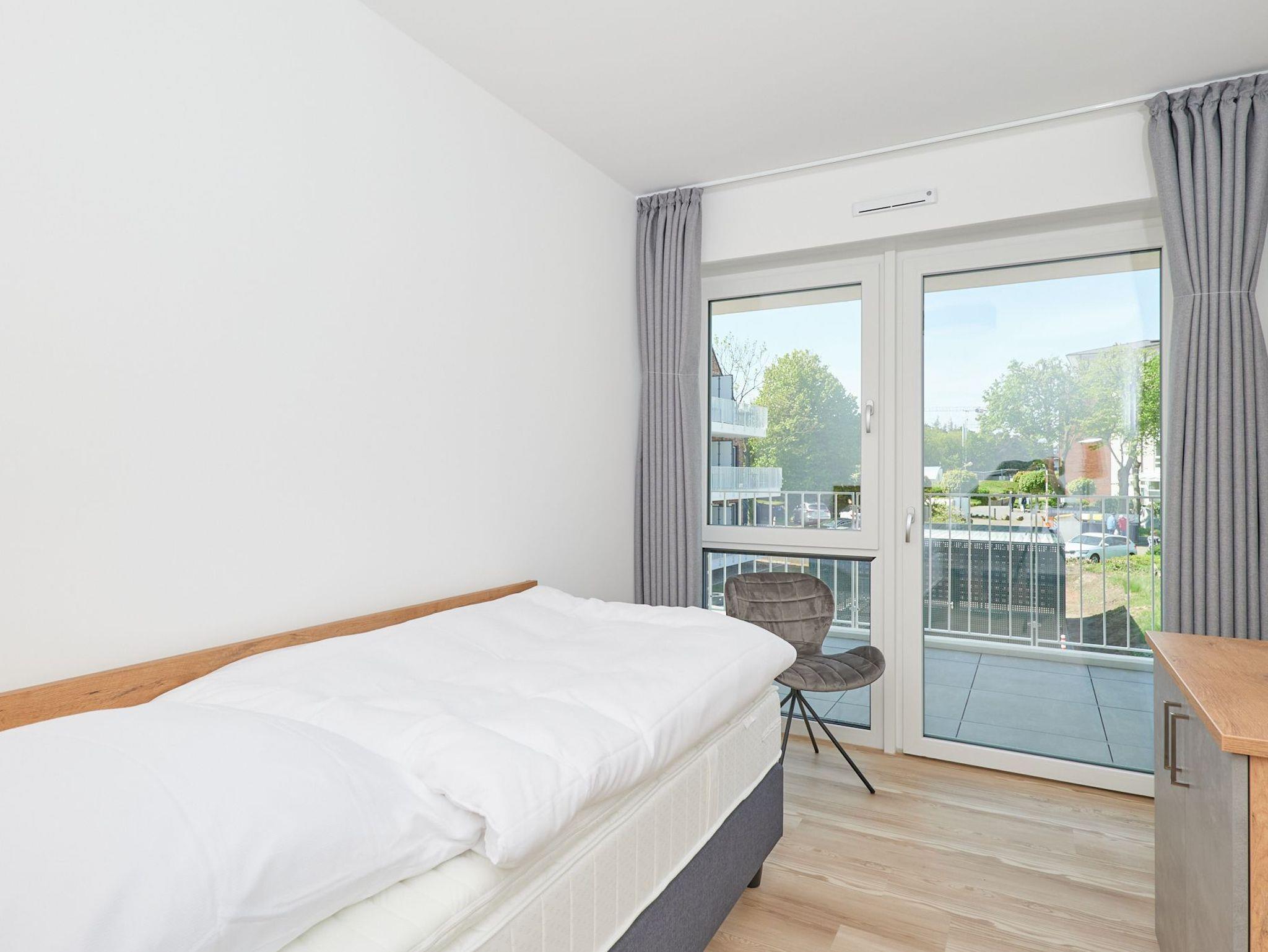 Neubau Mai 2023! Sehr schöne, moderne 3-Raum-Wohnung bis 4 Pers. voll ausgestattet auf ca. 89 m² in der 2.Etage gelegen, 2 Schlafzimmer (1x Doppelbett, 1x 2 Einzelbetten) und Außenjalousien an allen Fenstern, ebenerdige Dusche/WC, Wohnzimmer mit großer Küchenzeile (Backofen, Geschirrspüler, Mikrowelle), 2x Kabel-TV, Radio, kostenfreies W-LAN-Internet, großer Balkon (west) mit Teilseesicht, Personenaufzug, reservierter Pkw-Stellplatz in der Tiefgarage inkl., es sind keine Haustiere erlaubt und natürlich Nichtraucher. Durchfahrtshöhe Tiefgarage: 2,05m.
