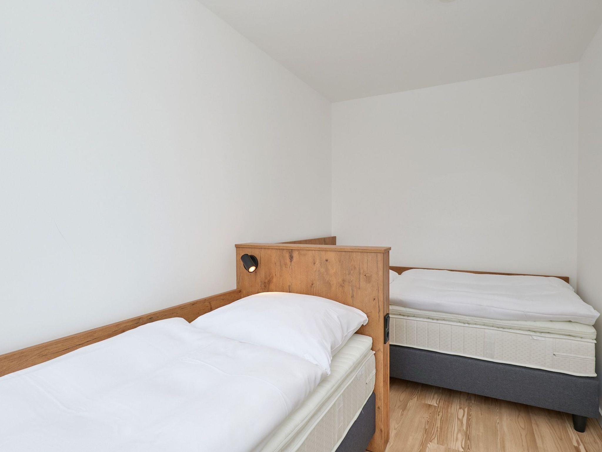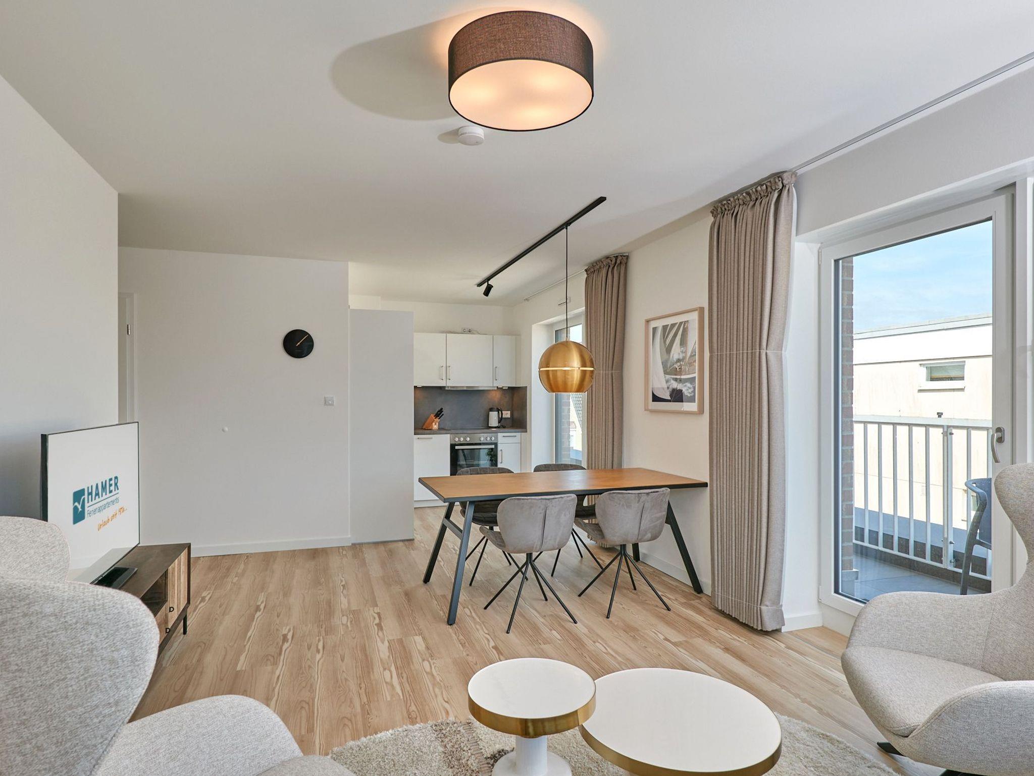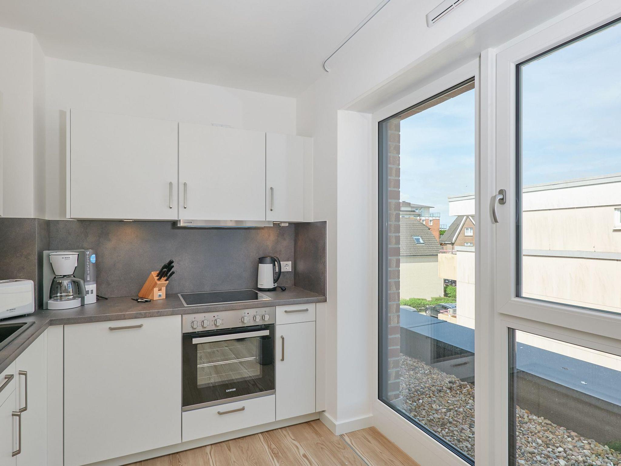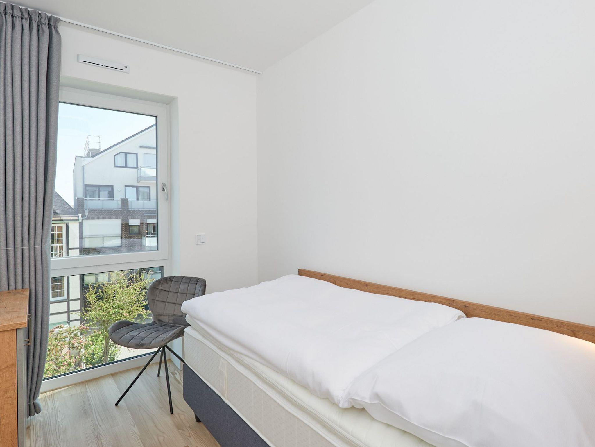 Neubau Mai 2023! Sehr schöne, moderne 3-Raum-Wohnung bis 4 Pers. voll ausgestattet auf ca. 80 m² in der 3.Etage gelegen, 2 Schlafzimmer (1x Doppelbett, 1x 2 Einzelbetten) und Außenjalousien an allen Fenstern, ebenerdige Dusche/WC, Wohnzimmer mit großer Küchenzeile (Backofen, Geschirrspüler, Mikrowelle) u. Teilseesicht, 2x Kabel-TV, Radio, kostenfreies W-LAN-Internet, kleiner Balkon (nord) mit Teilseesicht, Personenaufzug, reservierter Pkw-Stellplatz in der Tiefgarage inkl., es sind keine Haustiere erlaubt und natürlich Nichtraucher. Durchfahrtshöhe Tiefgarage: 2,05m.