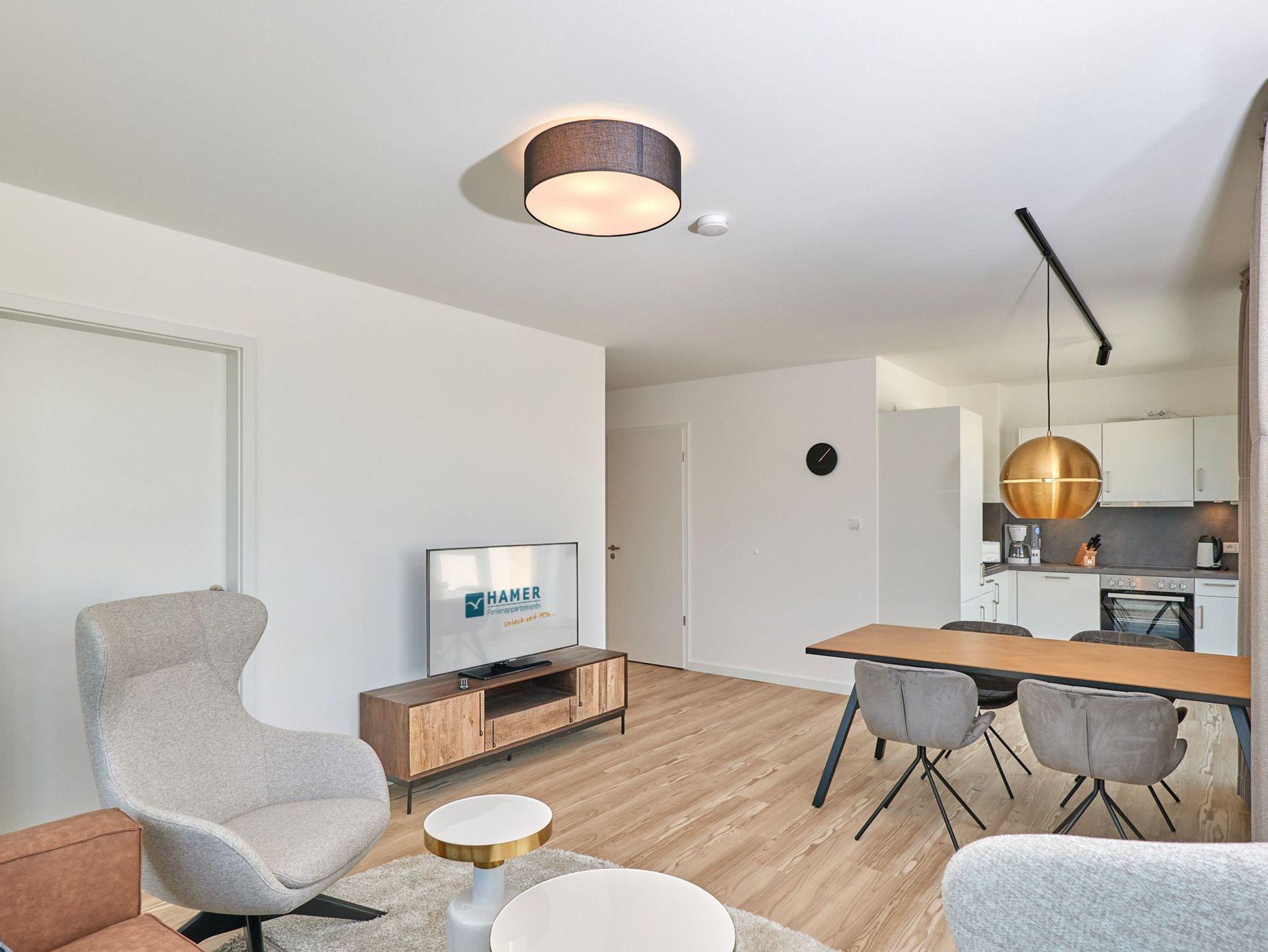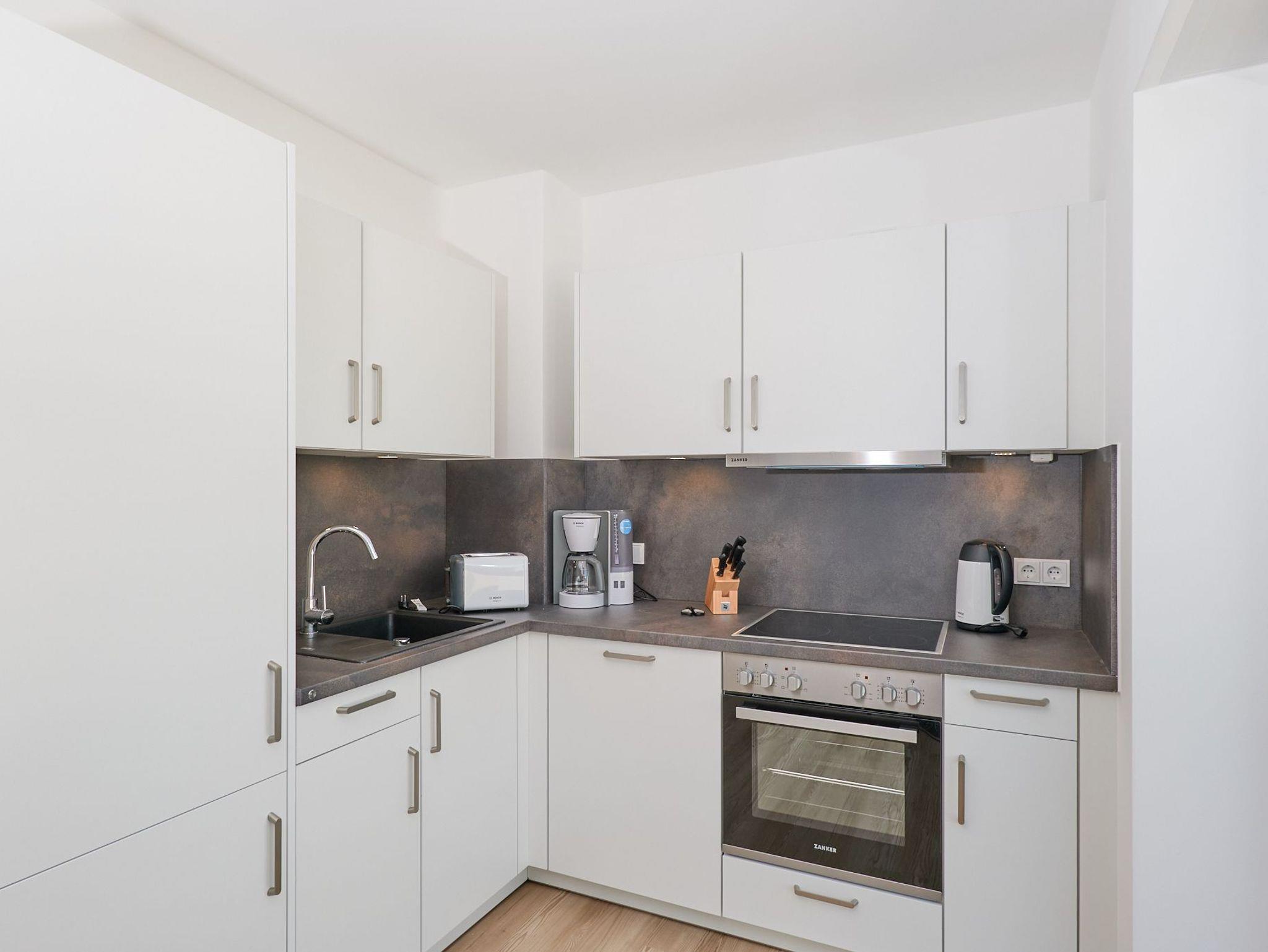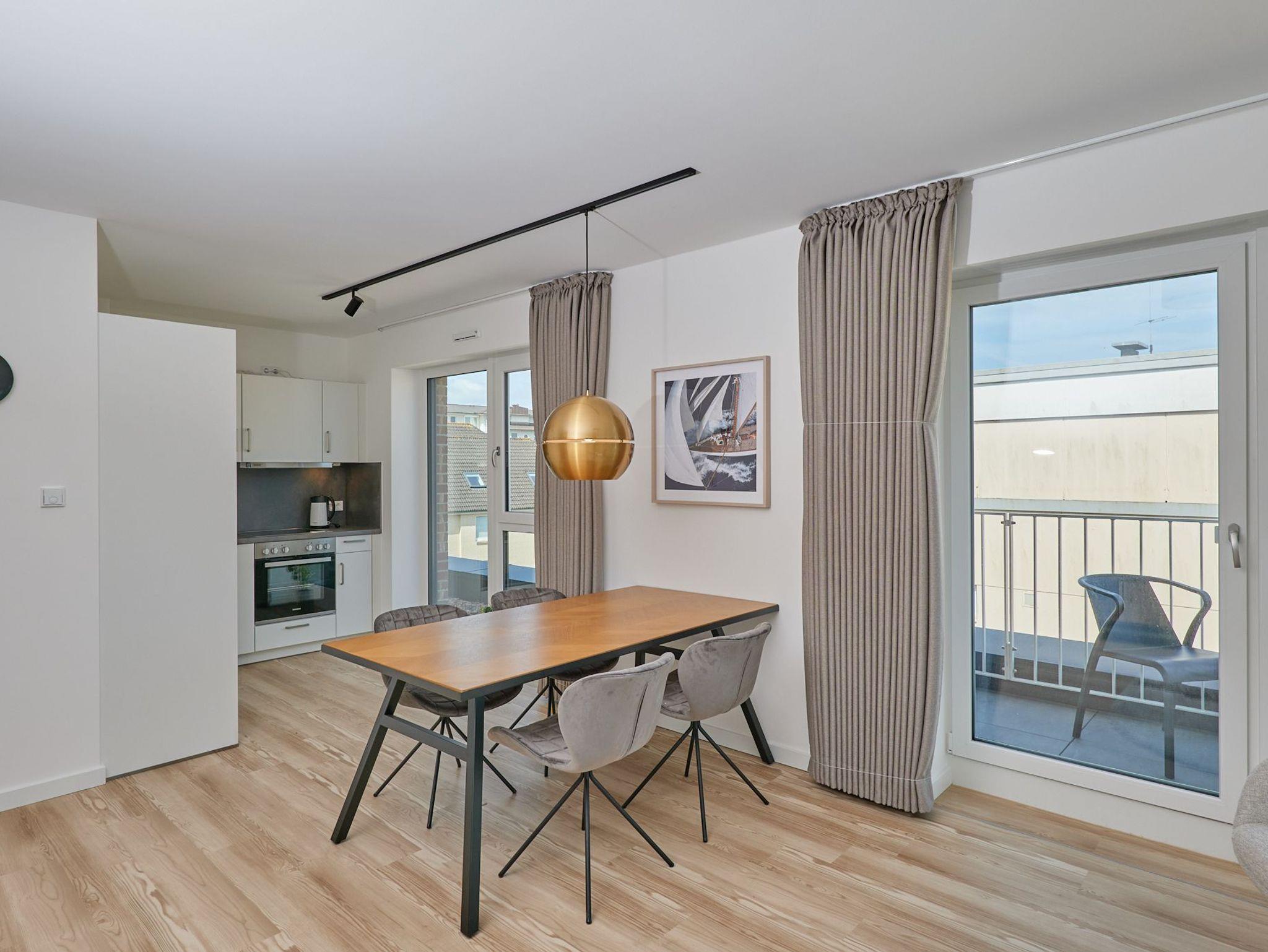 Neubau Mai 2023! Sehr schöne, moderne 3-Raum-Wohnung bis 4 Pers. voll ausgestattet auf ca. 80 m² in der 3.Etage gelegen, 2 Schlafzimmer (1x Doppelbett, 1x 2 Einzelbetten) und Außenjalousien an allen Fenstern, ebenerdige Dusche/WC, Wohnzimmer mit großer Küchenzeile (Backofen, Geschirrspüler, Mikrowelle) u. Teilseesicht, 2x Kabel-TV, Radio, kostenfreies W-LAN-Internet, kleiner Balkon (nord) mit Teilseesicht, Personenaufzug, reservierter Pkw-Stellplatz in der Tiefgarage inkl., es sind keine Haustiere erlaubt und natürlich Nichtraucher. Durchfahrtshöhe Tiefgarage: 2,05m.