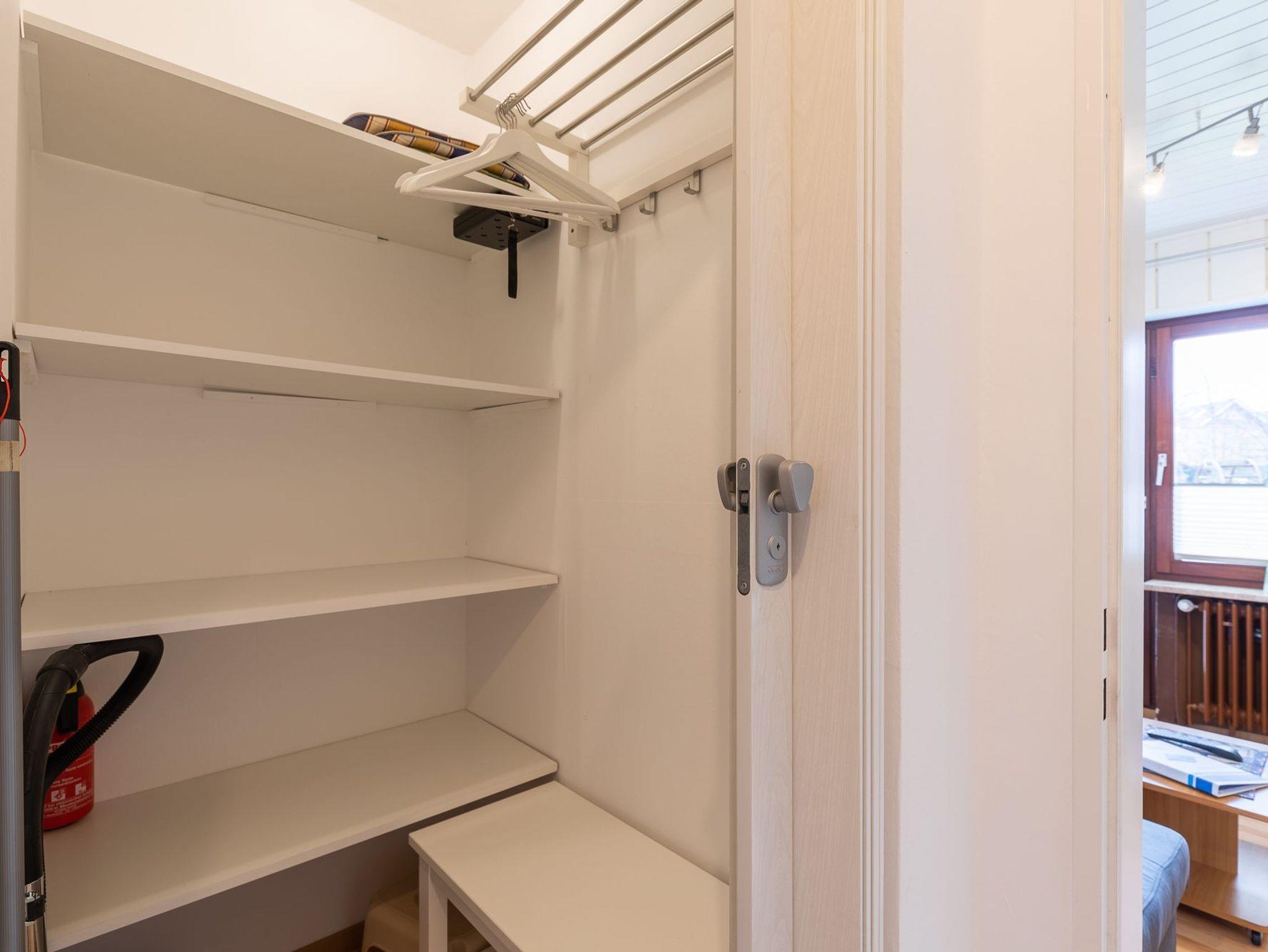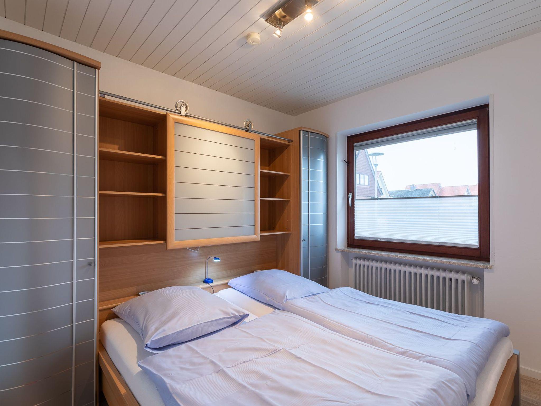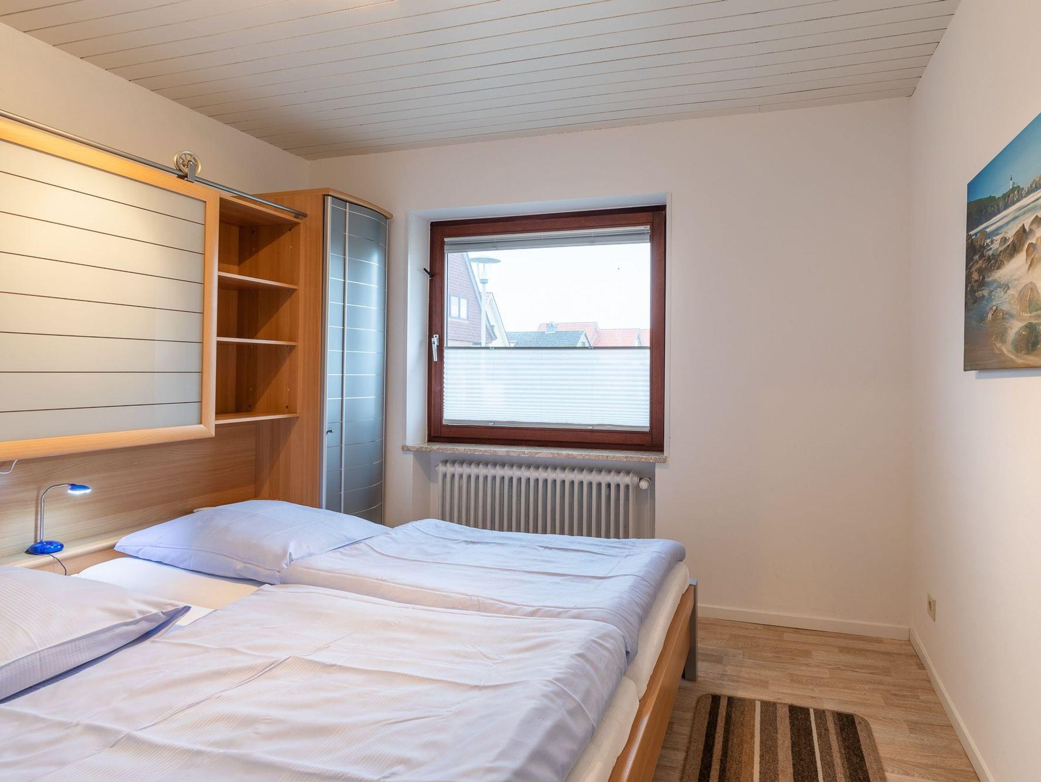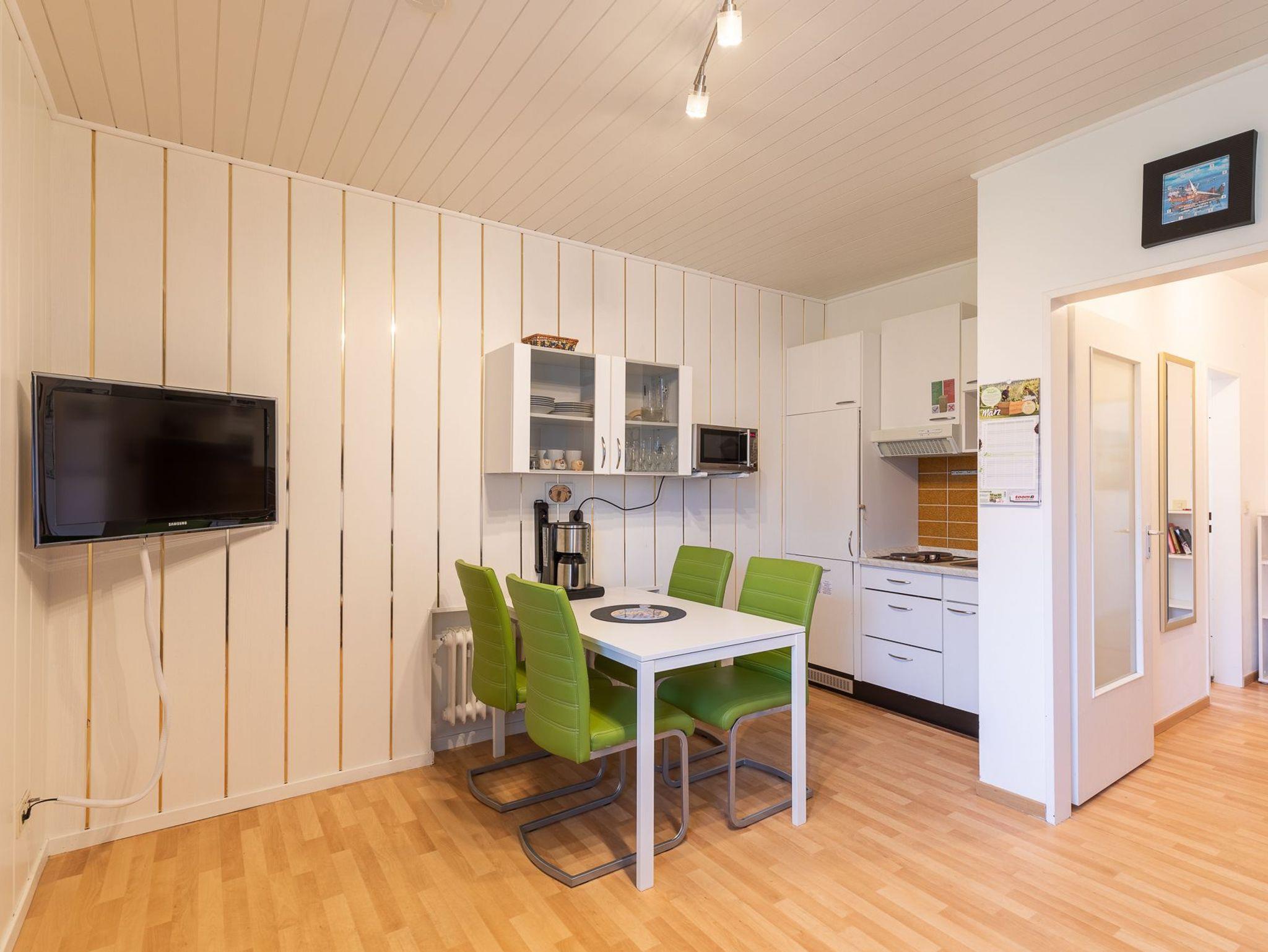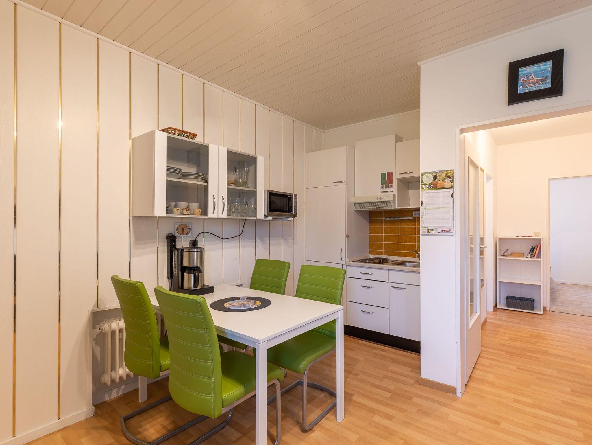 Ein Schlafzimmer mit Doppelbett (180 *200) und seitlichen Kleiderschränken. Ein geräumiges Wohnzimmer mit Küchenzeile (Kaffee- und Pad-Maschine, Heißwasser- und Eierkocher, Heißluft/Grill-Mikrowelle, Kühlschrank mit Gefrierfach, Geschirrspülmaschine, 2 Kochplatten), Essplatz, Schlaf-Sofa, Sat TV. Langer Balkon mit Sitzmöbel. Bad mit niedriger Duschwanne + Föhn. Begehbarer Kleiderschrank im Flur, Wäscheständer, Staubsauger. Gegensprechanlage/Türöffner. Nichtraucherhaus, keine Haustiere, kostenloser PKW-Stellplatz direkt am Haus, Fahrradunterstand hinterm Haus.