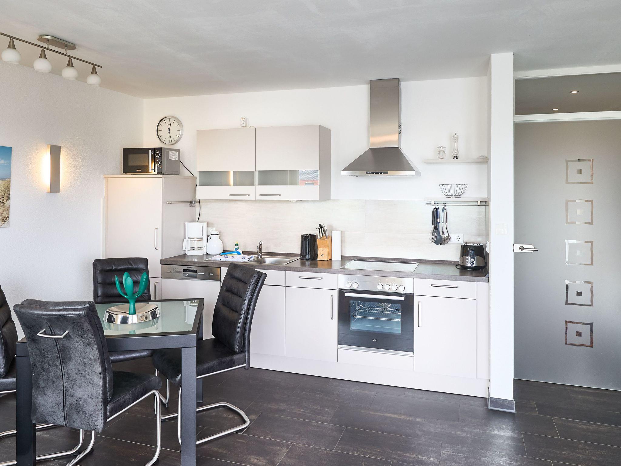 Die Wohnung präsentiert sich modern und komfortabel gestaltet. Der helle Wohn- und Essbereich lädt zum Verweilen ein, die gut ausgestattete Küche ermöglicht Ihnen die Zubereitung köstlicher Mahlzeiten. Der Balkon, vom Wohnbereich aus begehbar ist mit teilweisem Blick auf den Pferdehof der Wattenpost und die Nordsee (Teil-Seesicht von Oktober bis Mai, wenn die Bäume nicht zu üppig belaubt sind), ist überdachte und lädt zum entspannten Frühstück an der frischen Nordseeluft ein. Das Duschbad mit WC ist modern und funktional gestaltet. Im Schlafzimmer erwartet Sie ein komfortables Boxspringbett, sowie ein großer Kleiderschrank. Ein angrenzender Ruhebereich verfügt über ein einfaches Schlafsofa und raumhohe Fenster mit Blick Richtung Westen, so können Sie hier auch als kleine Familie urlauben und z.B. mit 3 Personen die Wohnung bewohnen.
