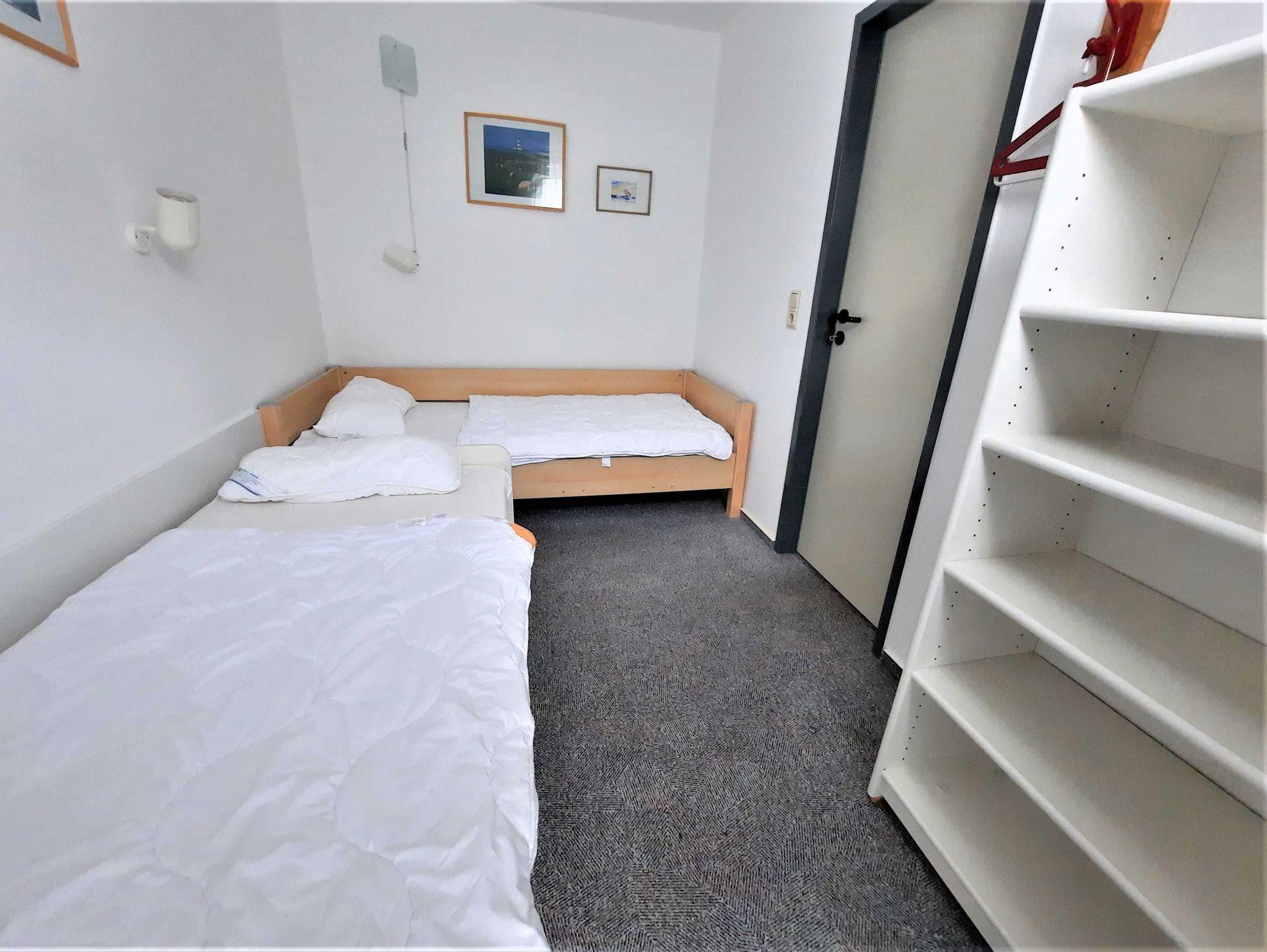Es gibt ein freundliches, separates Schlafzimmer mitFenster sowie zwei getrennten Einzelbetten. So haben Sie eine Rückzugsmöglichkeit, wenn Sie im Urlaub „kurz mal online ins Büro müssen“.