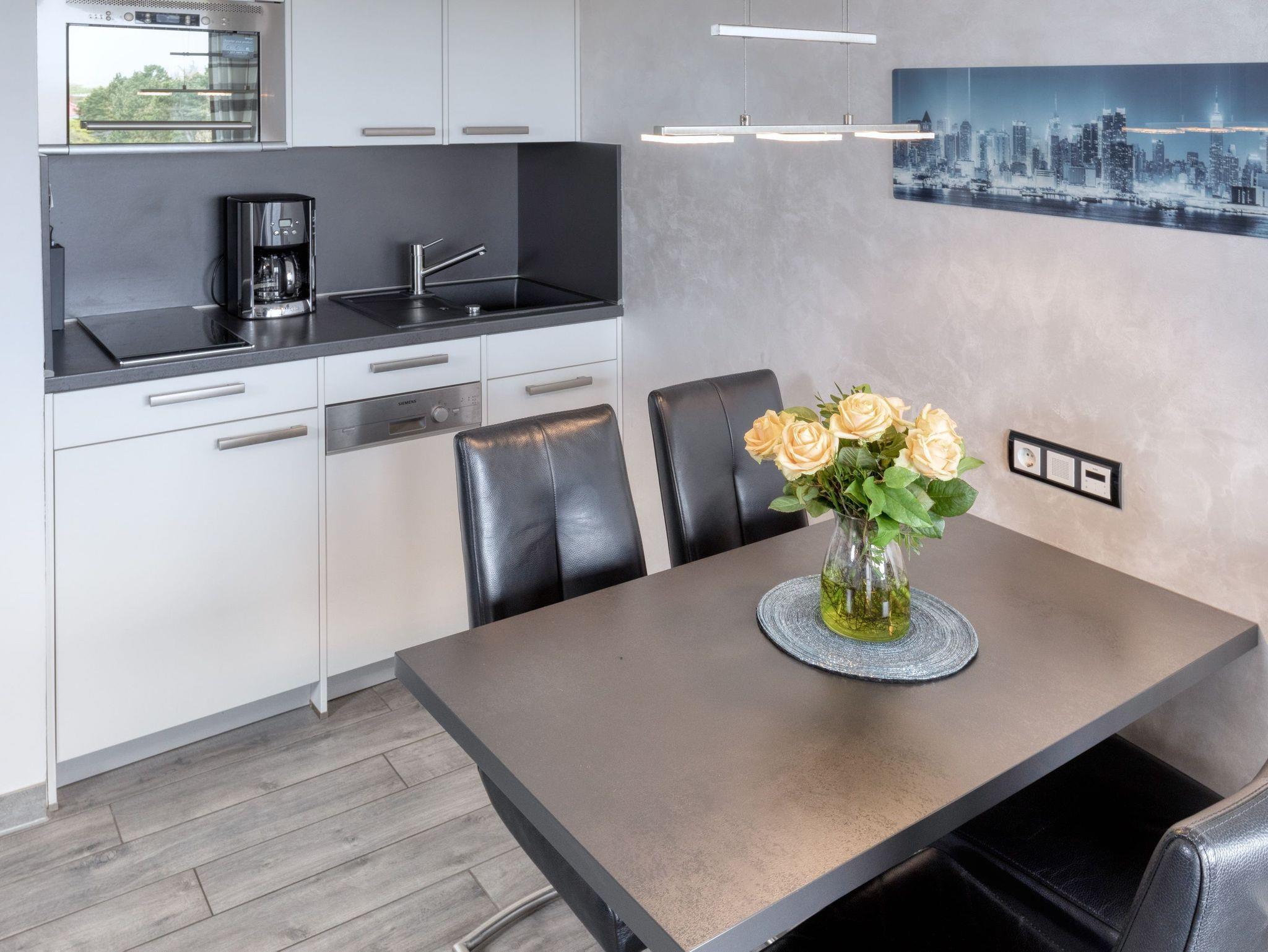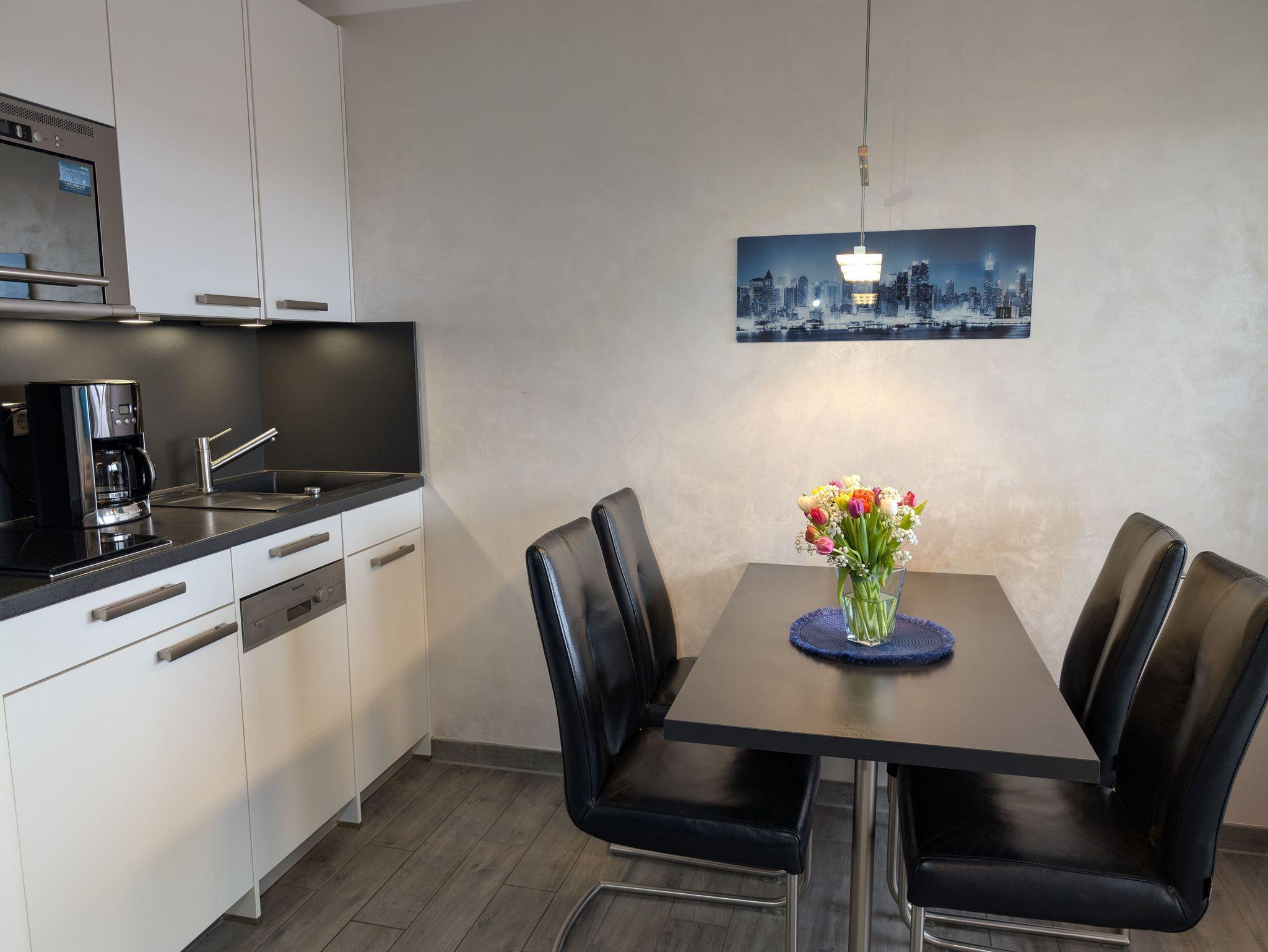 Das Appartement 81 ist ein 2-Raum-Apartment im 6. Obergeschoss für bis zu 3 Personen mit 34 qm. Der möblierte Ostbalkon bietet morgens Sonne und nachmittags Schatten.