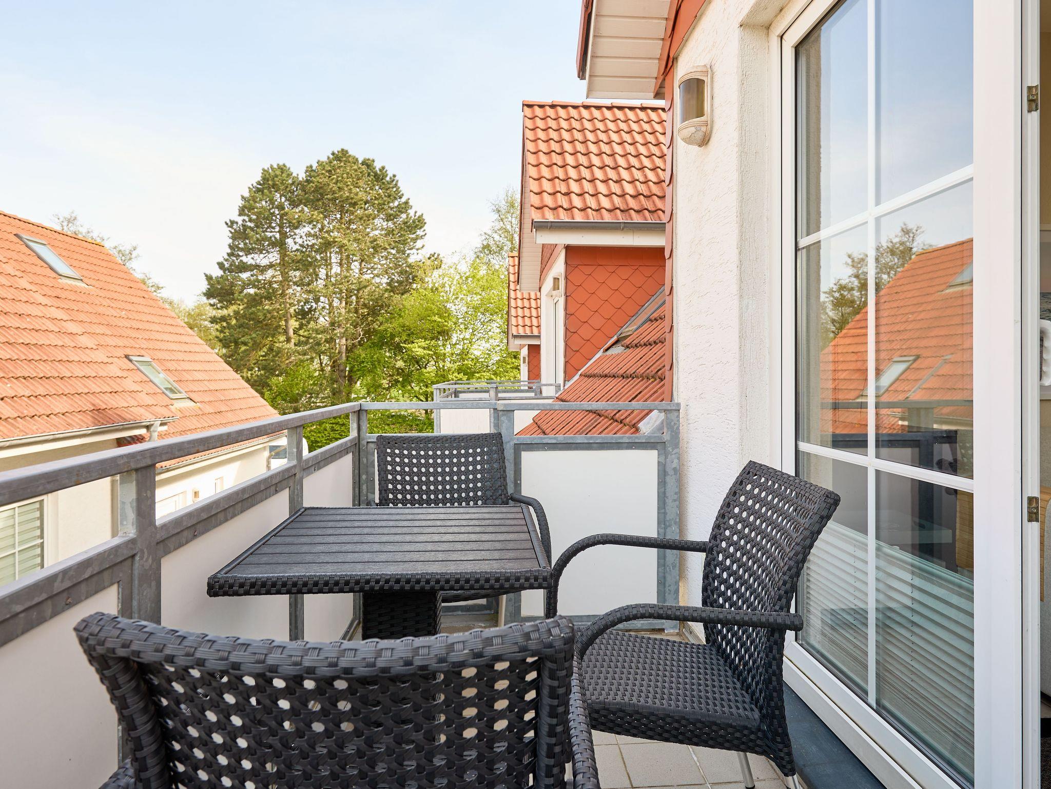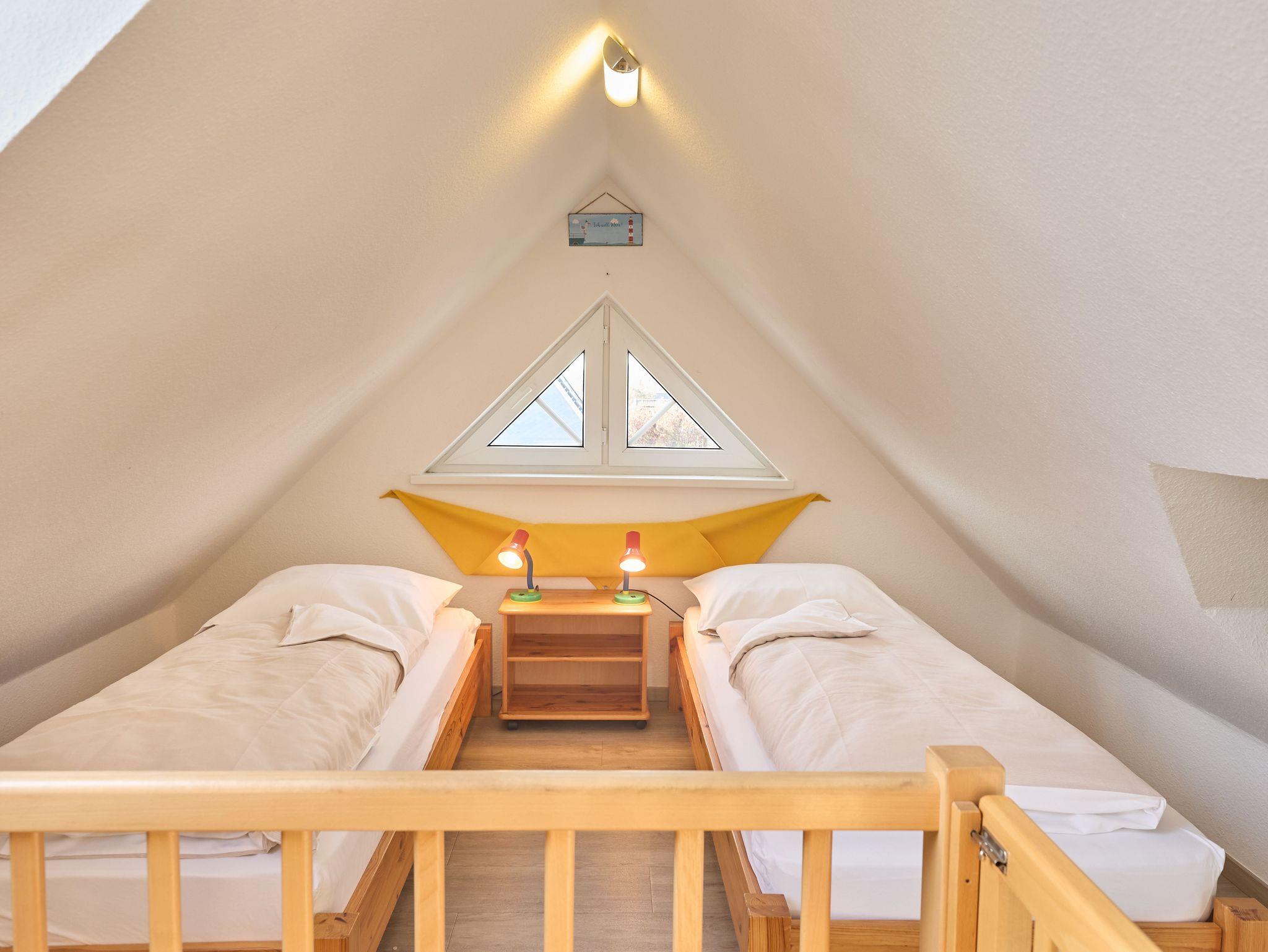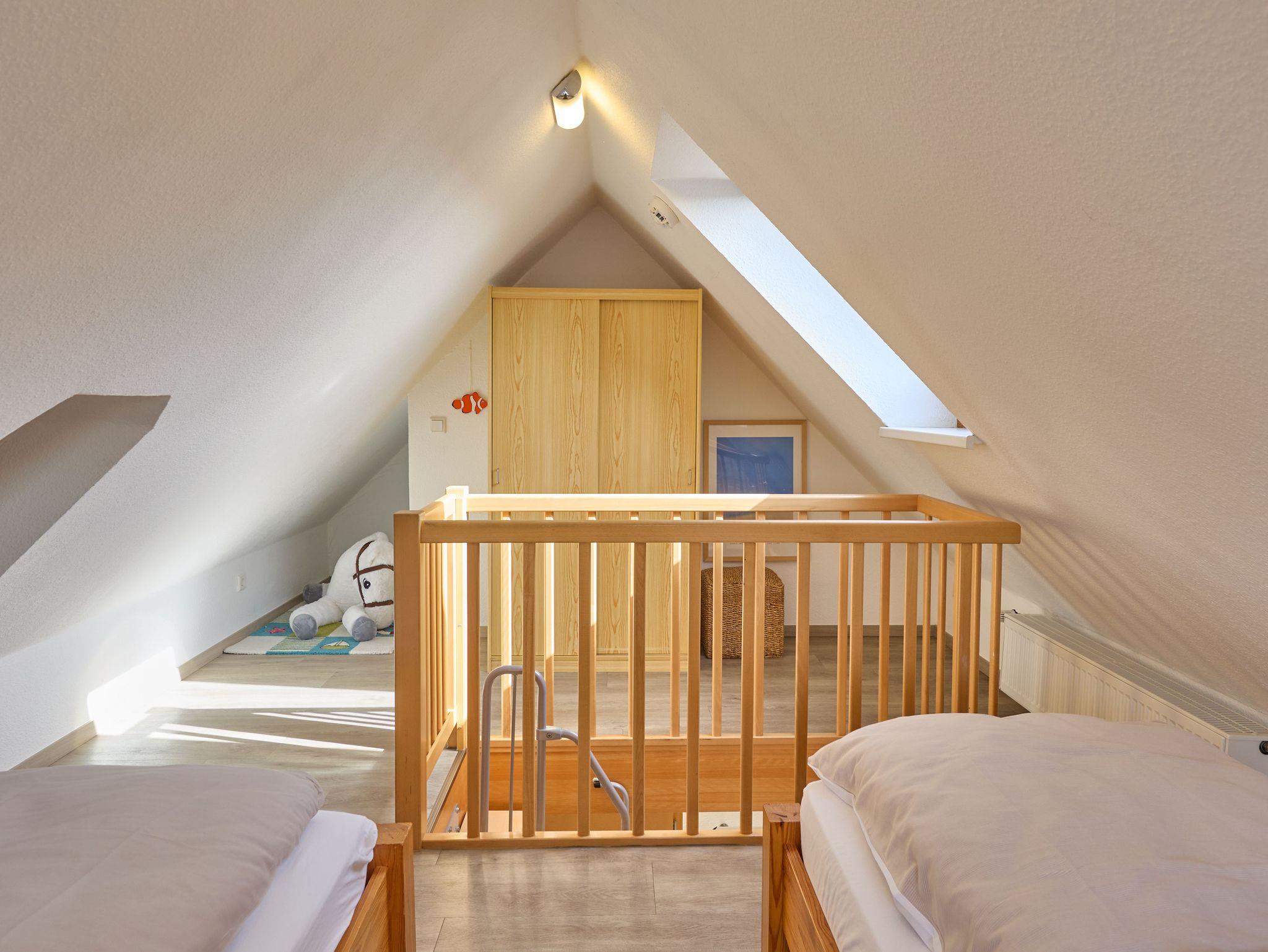 Neptun 12, Whg. 4, 3-Raum, 1.OG + DG, ca. 64m², bis zu 4 Personen, Kleiner Spielbereich für die Kleinen im Dachgeschoss. Die Ferienwohnung ist für bis zu 4 Personen geeignet und ist aufgeteilt mit einem separaten Schlafzimmer, mit einem Doppelbett (im 1.OG), einem Kinderzimmer (auch für Große) mit 2 Einzelbetten und einem Spielbereich für die Kleinen (im ausgebauten Dachgeschoss, ein fest eingebautes Treppenschutzgitter ist oberhalb der Treppe vorhanden), einem hellen Duschbad/WC, dem Wohnbereich mit Zugang zum Balkon und dem Essbereich mit der komfortablen Einbauküche. Der gemütliche und sonnige Balkon, mit Balkonmöbeln lädt zum urlauben ein.