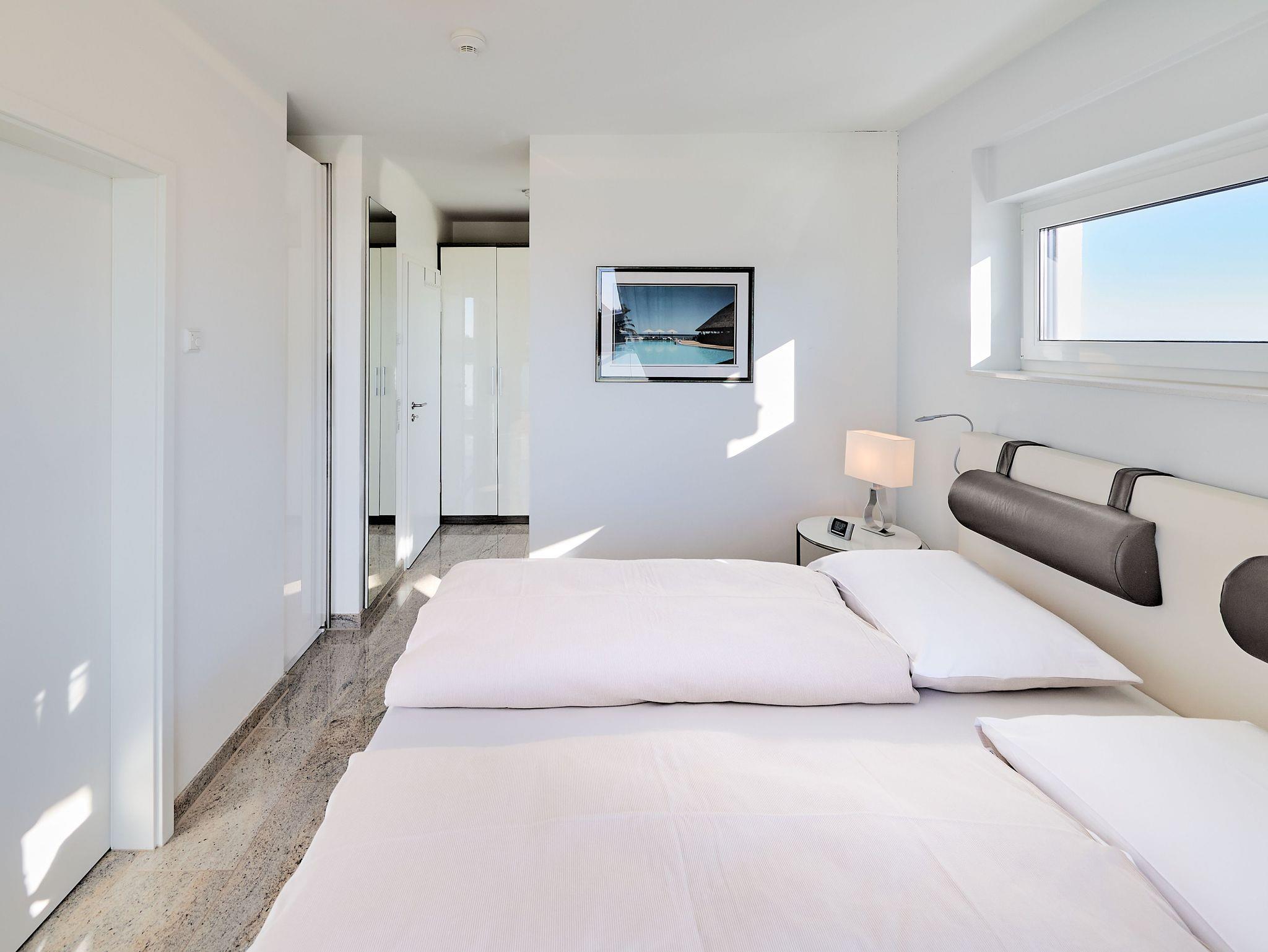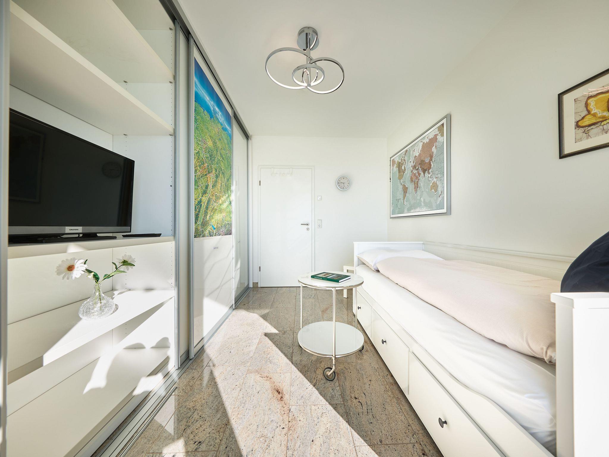 Das Appartement verfügt über zwei geschmackvoll eingerichtete Schlafbereiche. Der Hauptschlafbereich mit direktem Zugang zum Balkon bietet ein großzügiges Ankleidezimmer mit viel Stauraum und ein modernes Masterbad mit Dusche, die mit einem klappbaren Duschsitz ausgestattet ist, sowie ein WC ? perfekt für einen längeren Aufenthalt. Das zweite Schlafzimmer ist ideal für Kinder oder weitere Gäste. Es ist mit einem Hemnes-Ausziehbett ausgestattet, das sich von 80x200 cm auf 160x200 cm erweitern lässt. Auch steht Ihnen hier genügend Staufläche und ein TV zur Verfügung.