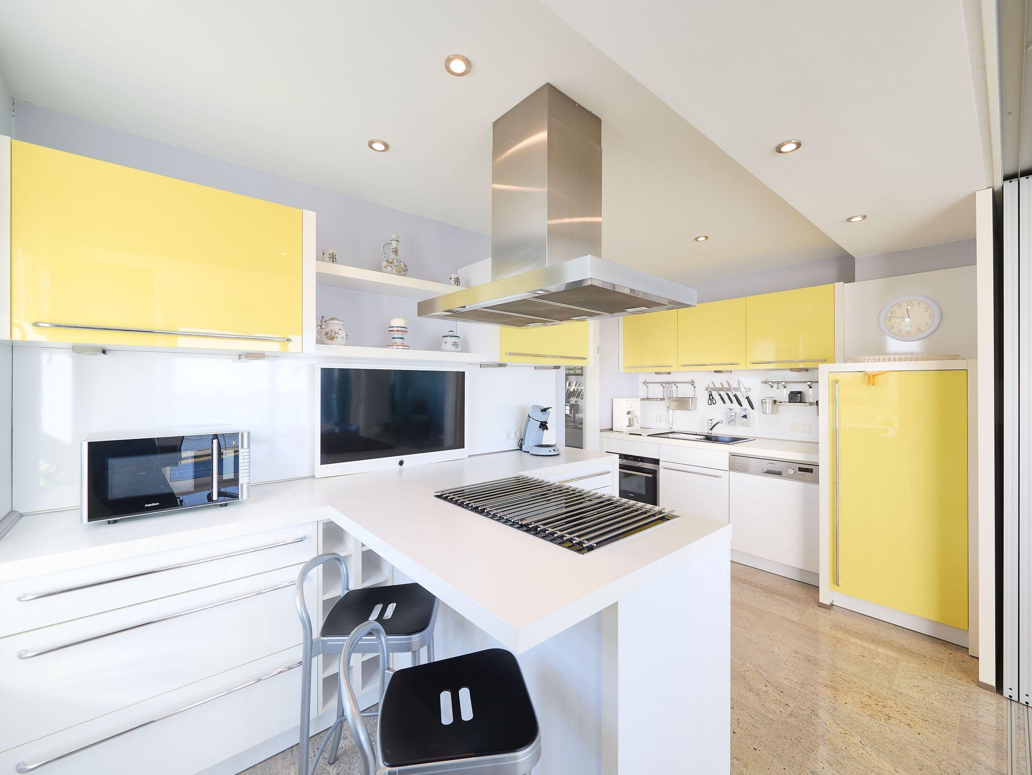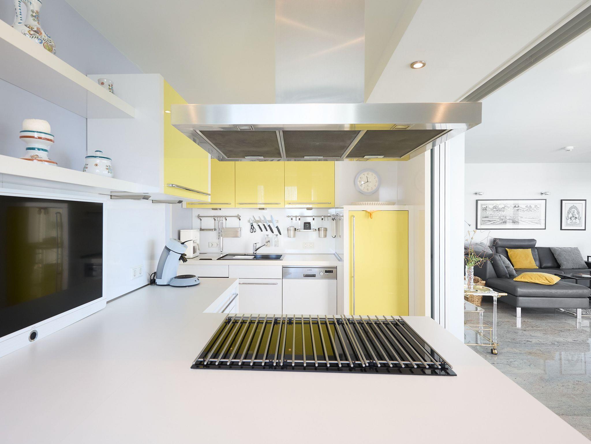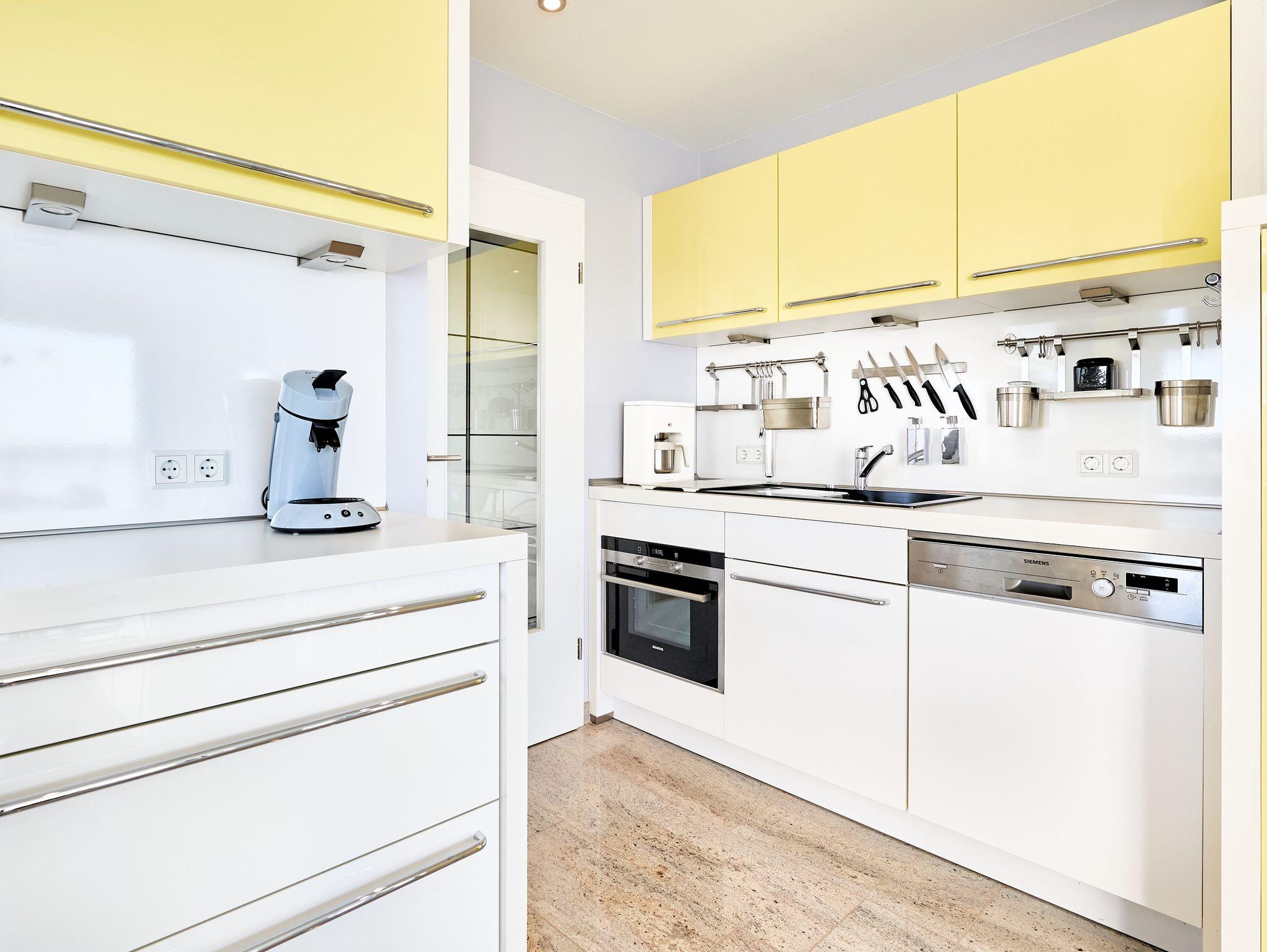 Die offene Einbauküche, die von 2 Seiten begehbar ist, ist ein Paradies für Hobbyköche und bietet alles, was Sie brauchen: einen Geschirrspüler, ein Cerankochfeld, einen Kühlschrank mit Gefrierfach sowie ein Weinregal. Ein zusätzlicher Fernseher sorgt dafür, dass Sie auch vom Essbereich aus bequem fernsehen können. Am Küchentresen mit zwei Stühlen können Sie entspannt frühstücken und sich aus der zusätzlichen Kaffeepadmaschine ein Kaffee zubereiten, bevor Sie gemeinsam am Esstisch Platz nehmen, der bis zu vier Personen bequem Platz bietet und einen wunderbaren Panoramablick, wie aus dem gesamten Wohn- Ess- und Küchenbereich in Richtung Seeseite bietet.